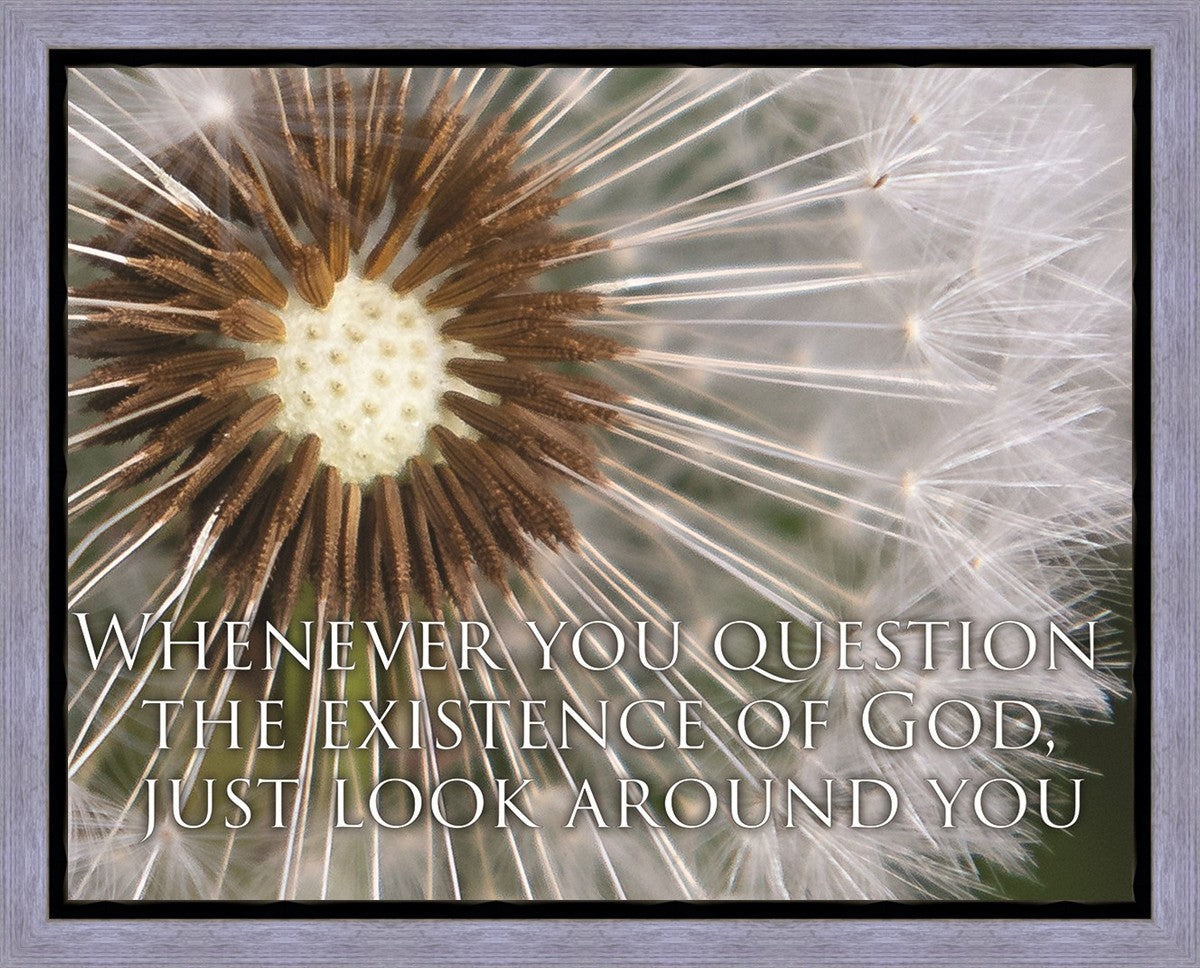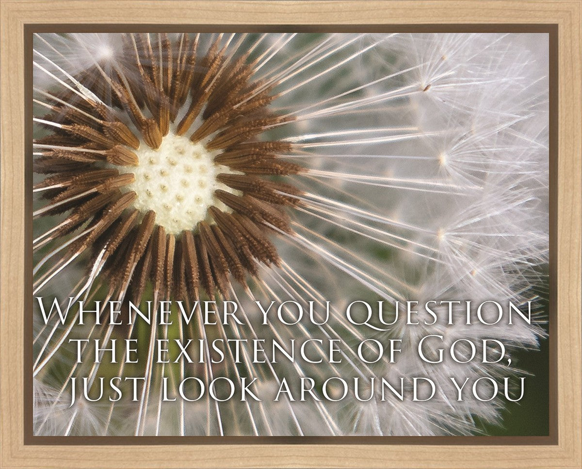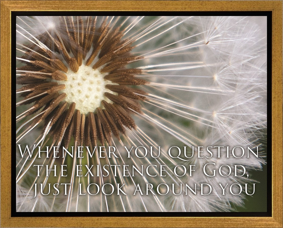 Look Around You Motivisional Poster by Julie Kerr features a photograph of a dandelion and an inspirational quote from Julie Kerr, "Whenever you question the existence of God, look around you.