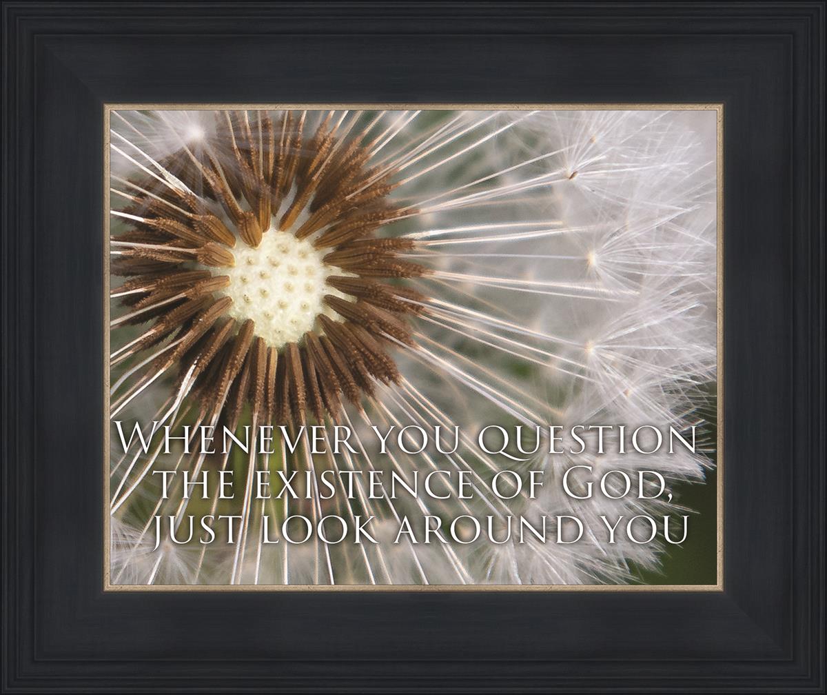 Look Around You Motivisional Poster by Julie Kerr features a photograph of a dandelion and an inspirational quote from Julie Kerr, ||Whenever you question the existence of God, look around you.
