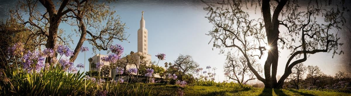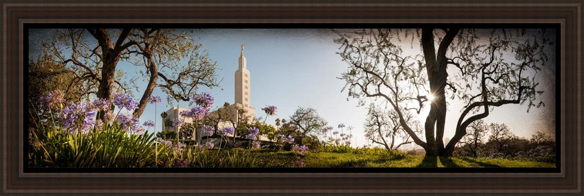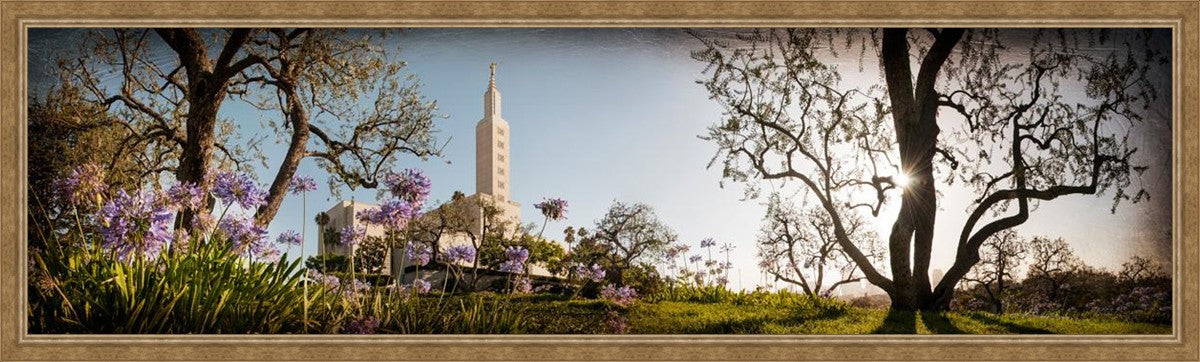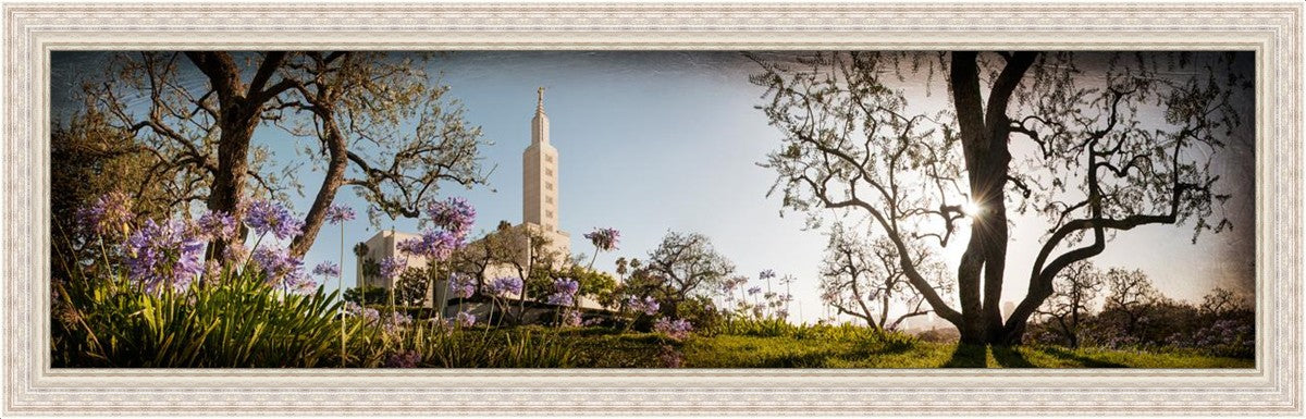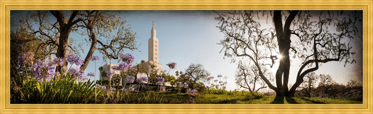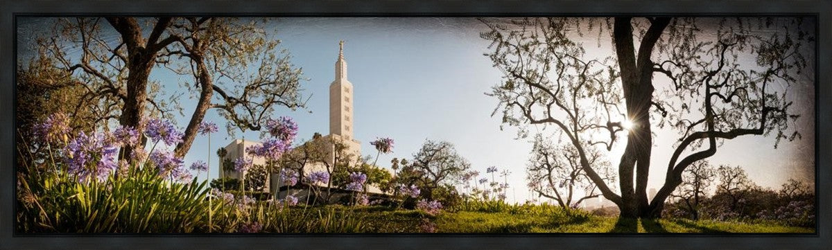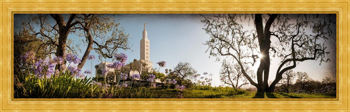 Since 1999 Landon has worked as an artisan in nearly 40 temples doing the decorative paint and gold leaf. He continues to do so as well as wood repair and graining. He was married in 2001 to Jacey Thomas in the Manti Utah temple. When she couldn’t find an image of the temple that she liked enough to purchase for their home, he decided to take one himself. That desire to create something original and different inspired his current series of temple art. They are taken from a panoramic viewpoint and stylized with an artistic border that reflect his paintings. All modern structures apart from the temple have been omitted.
