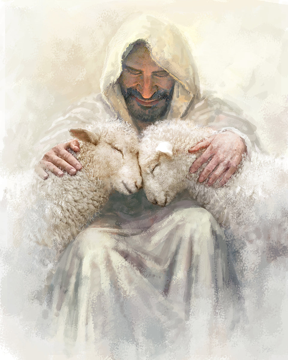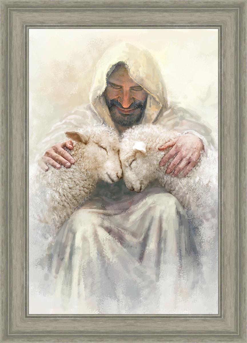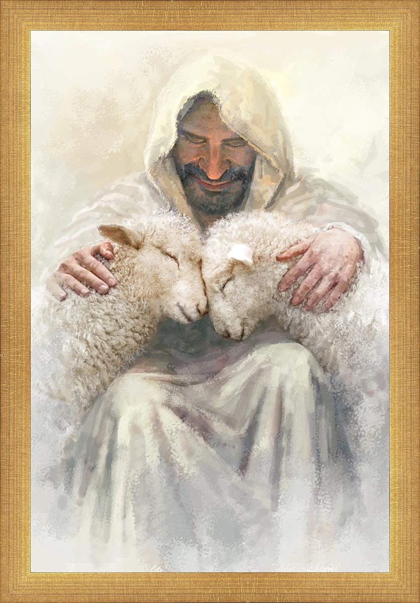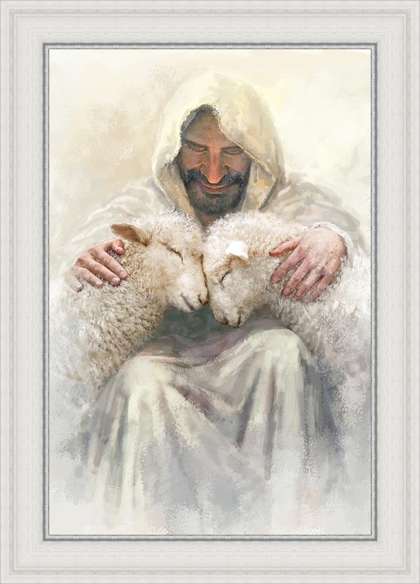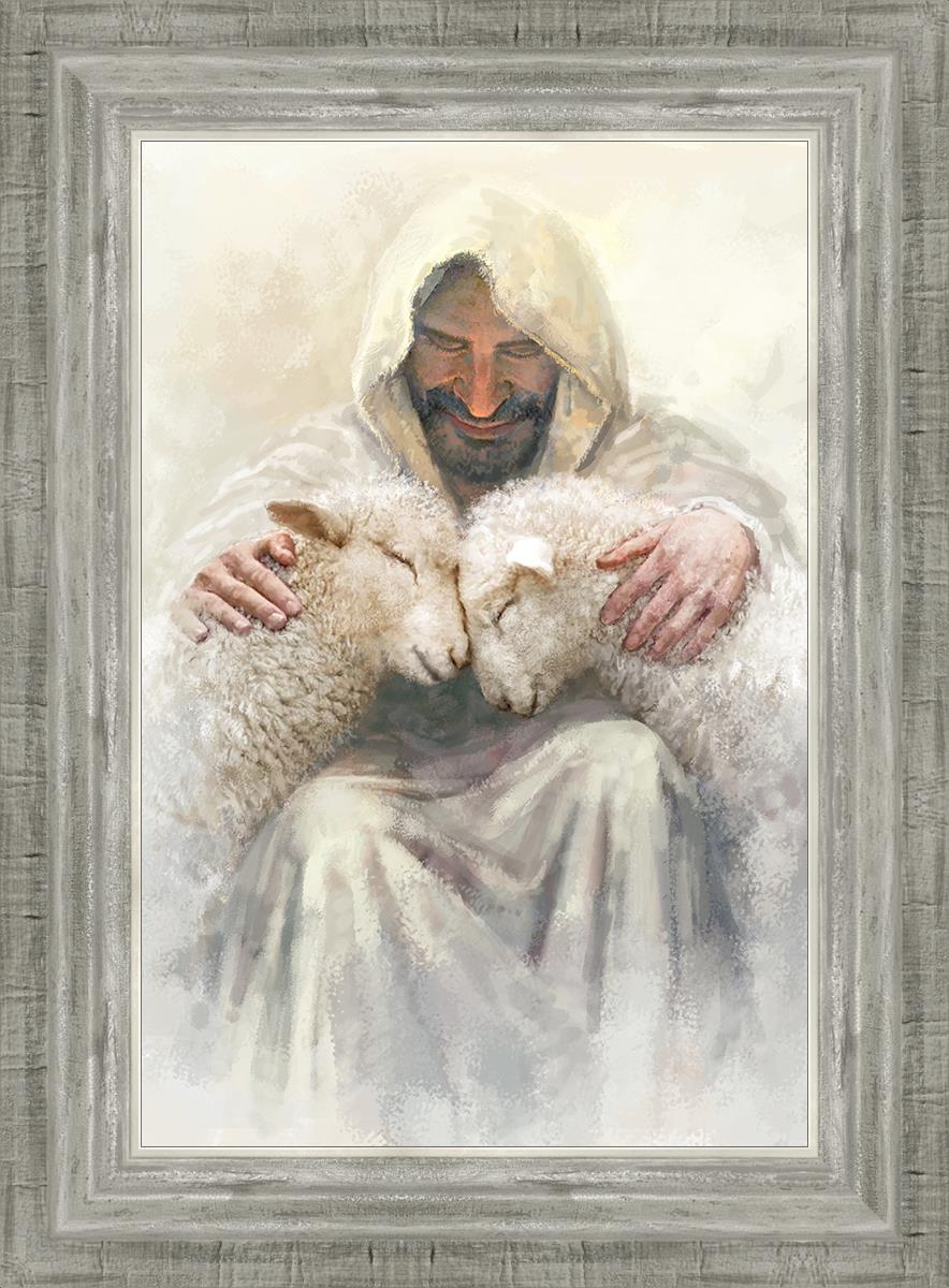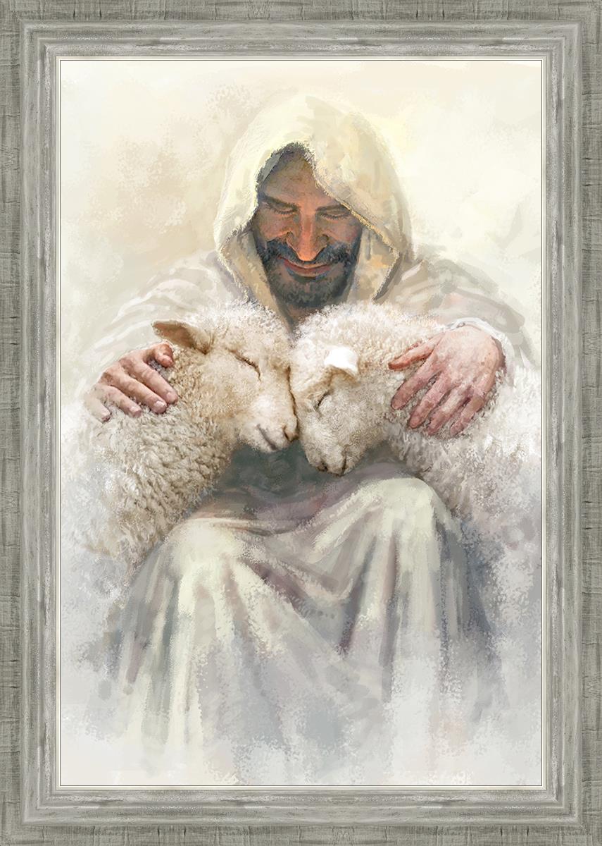 Painting of Love by Yongsung Kim depicting Christ holding two sheep.