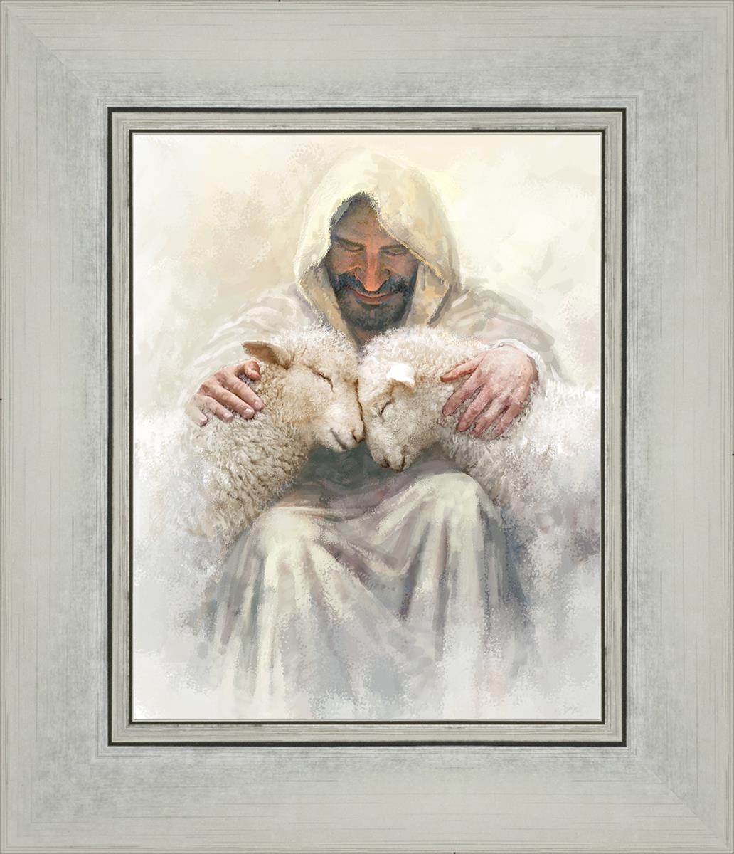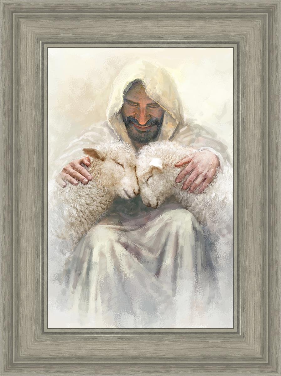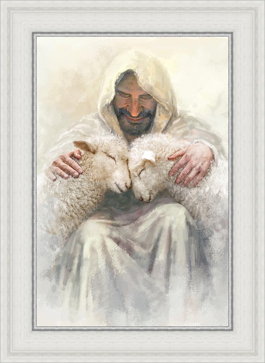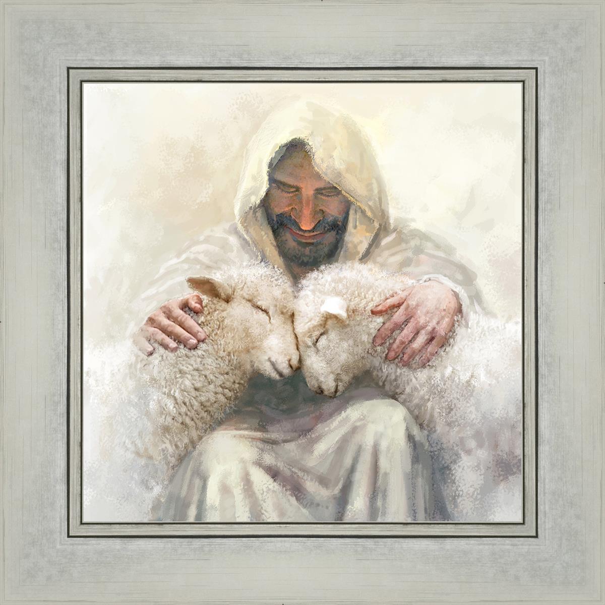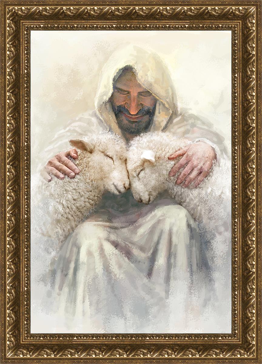 Painting of Love by Yongsung Kim depicting Christ holding two sheep.