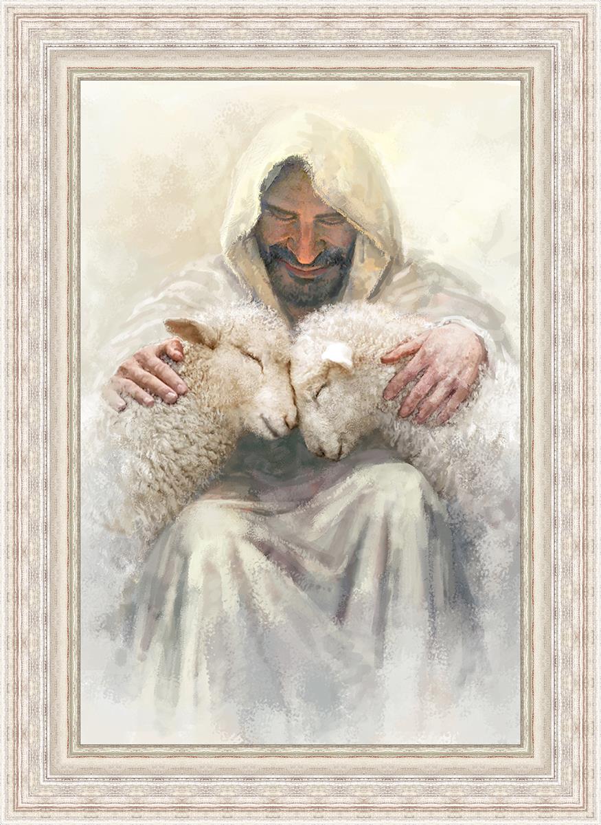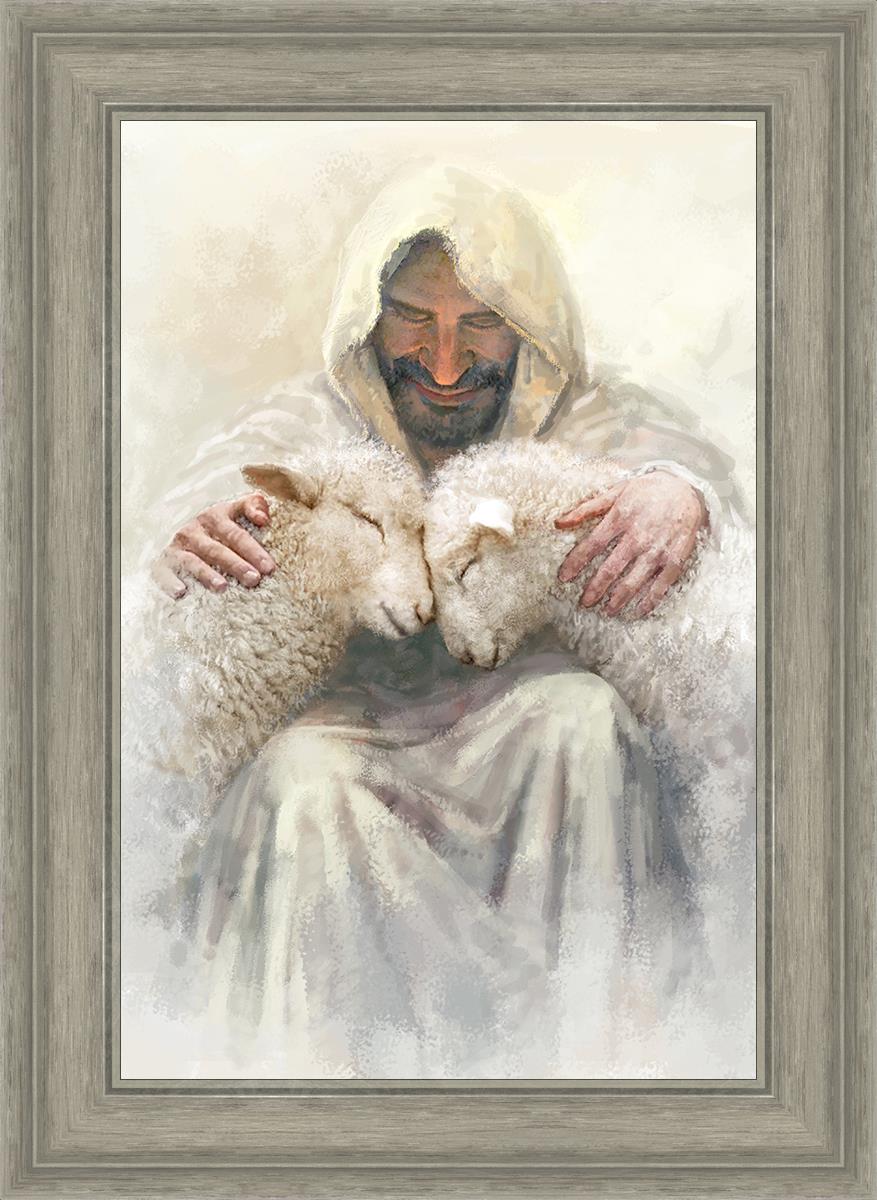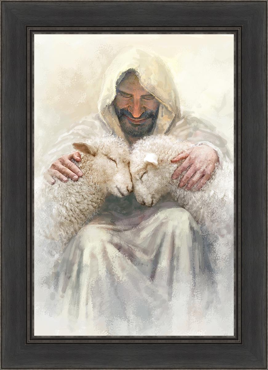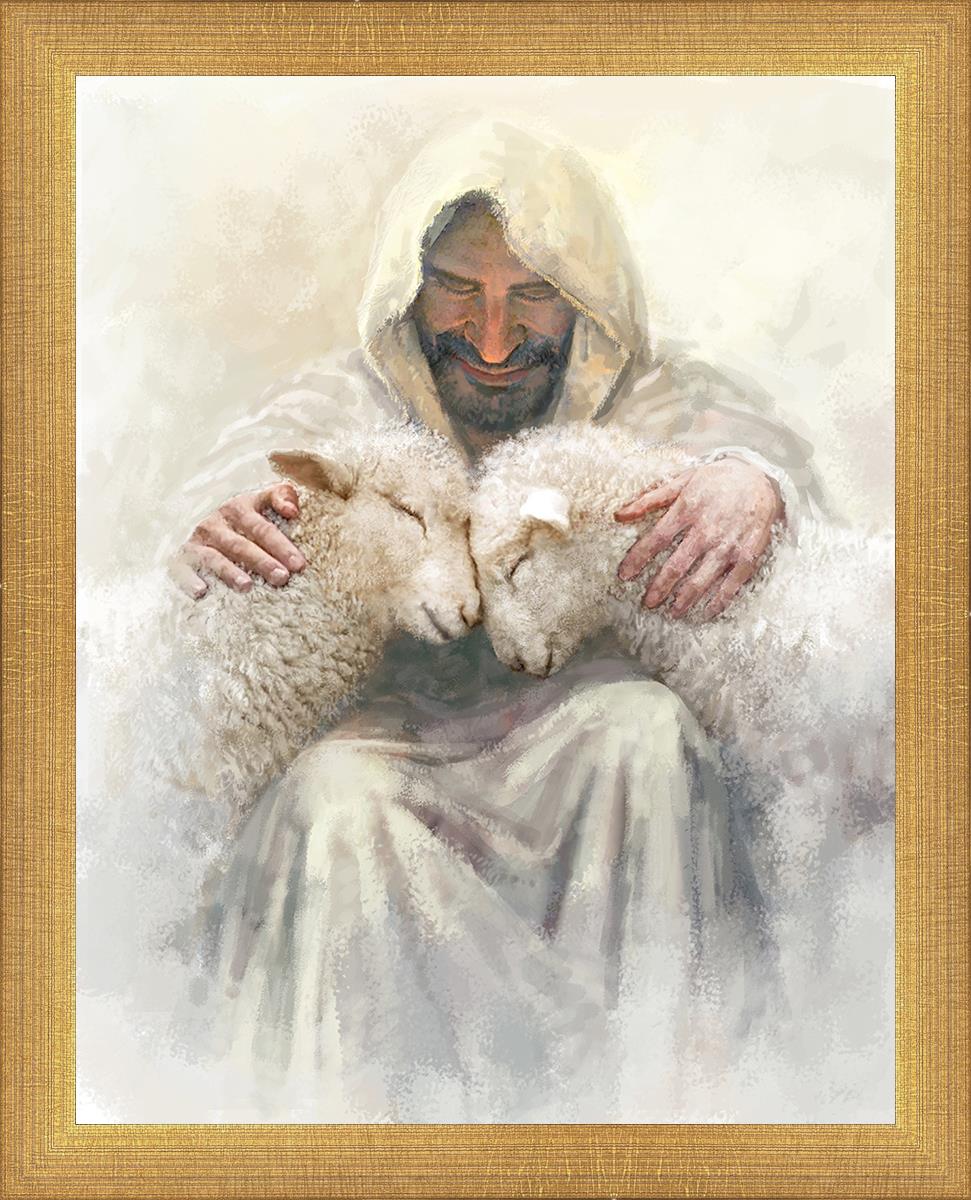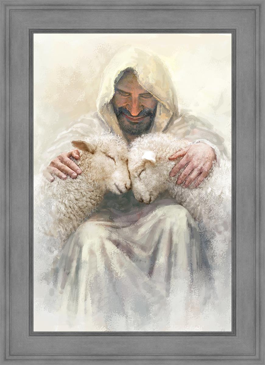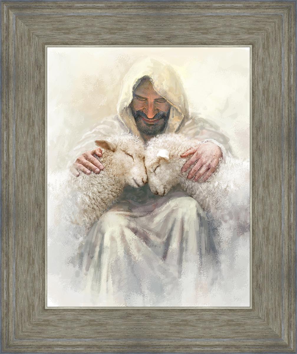 Painting of Love by Yongsung Kim depicting Christ holding two sheep.