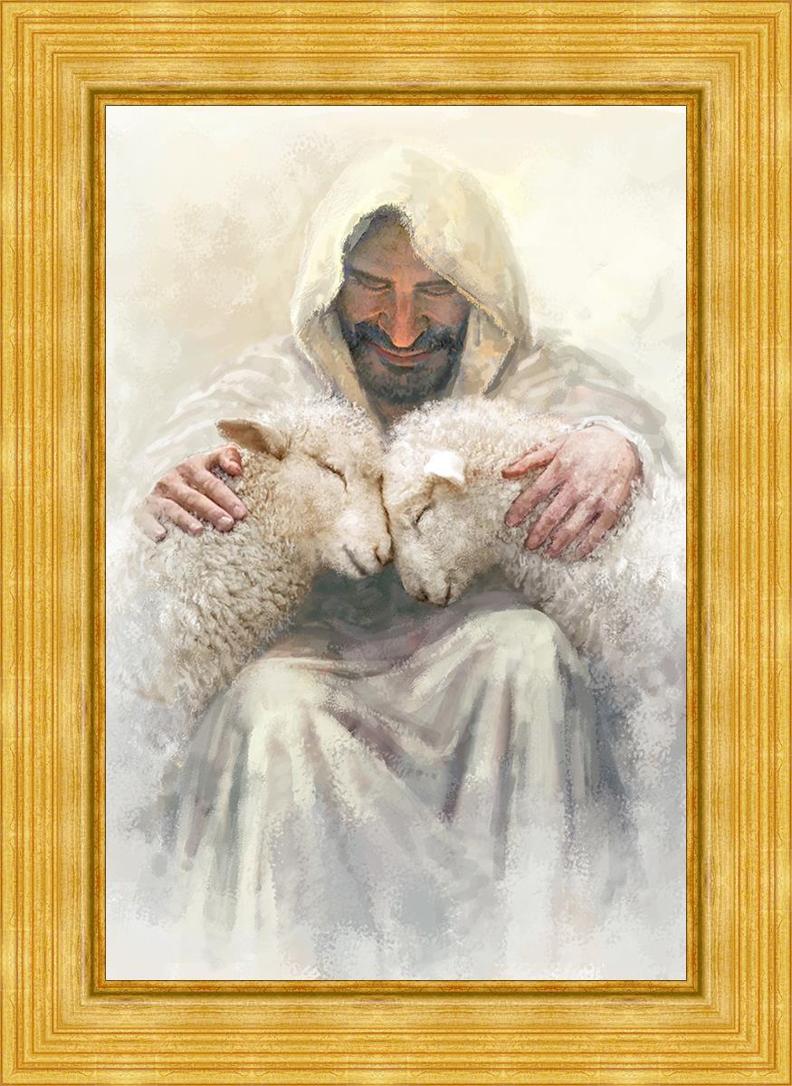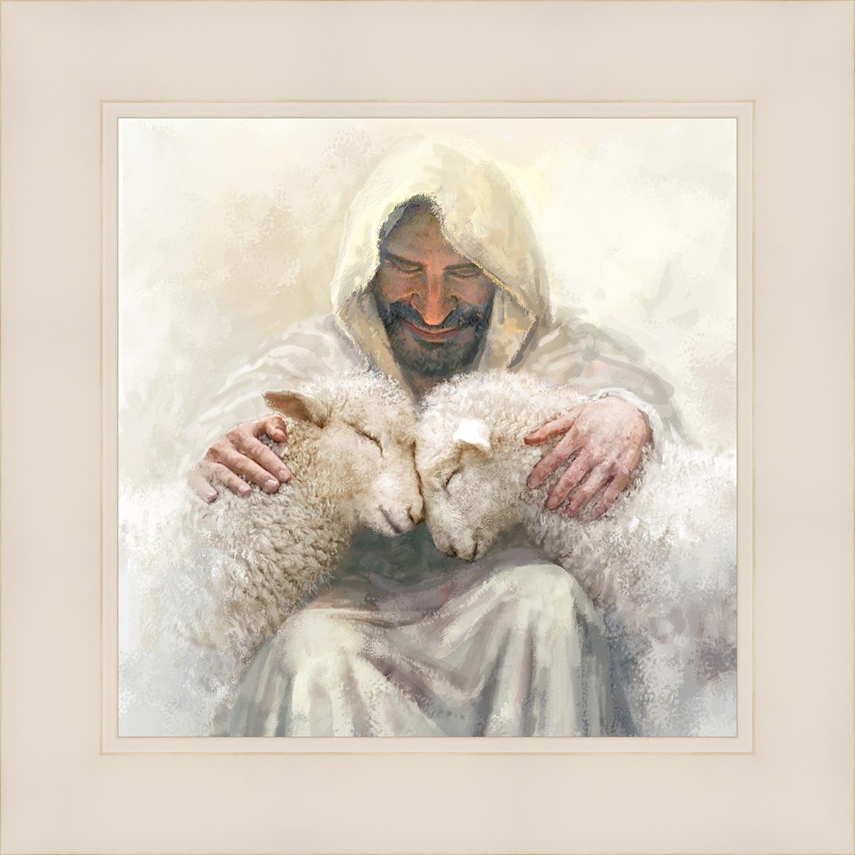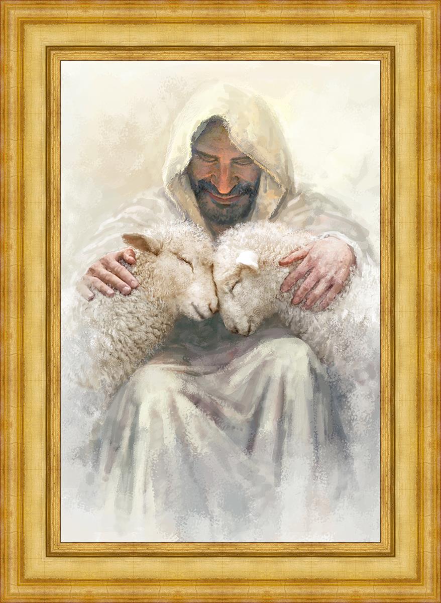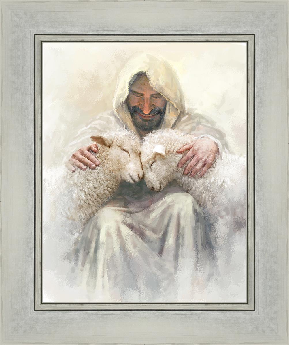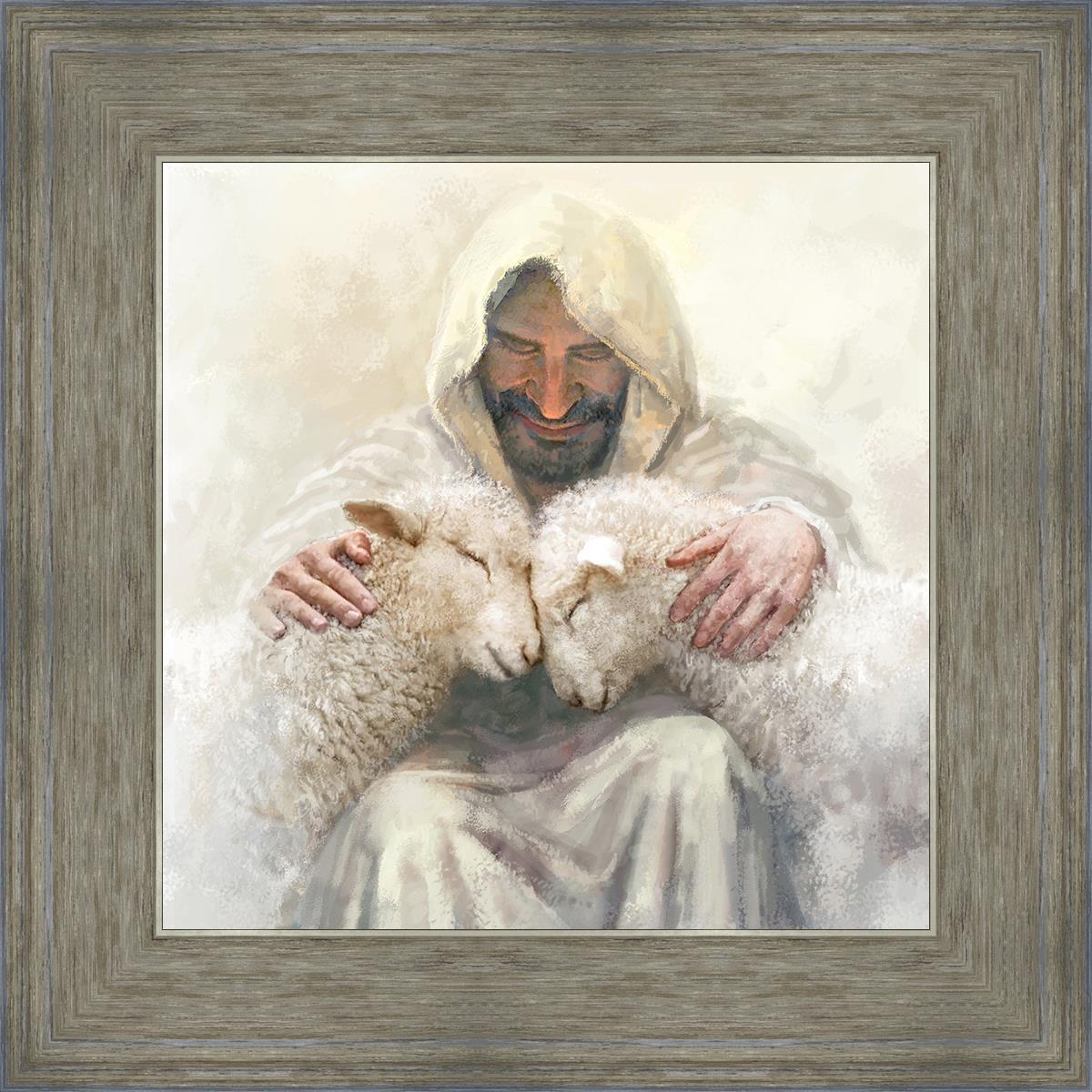 Painting of Love by Yongsung Kim depicting Christ holding two sheep.