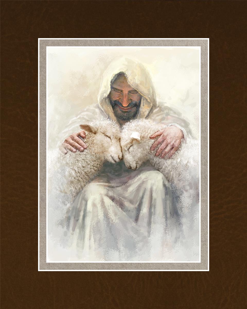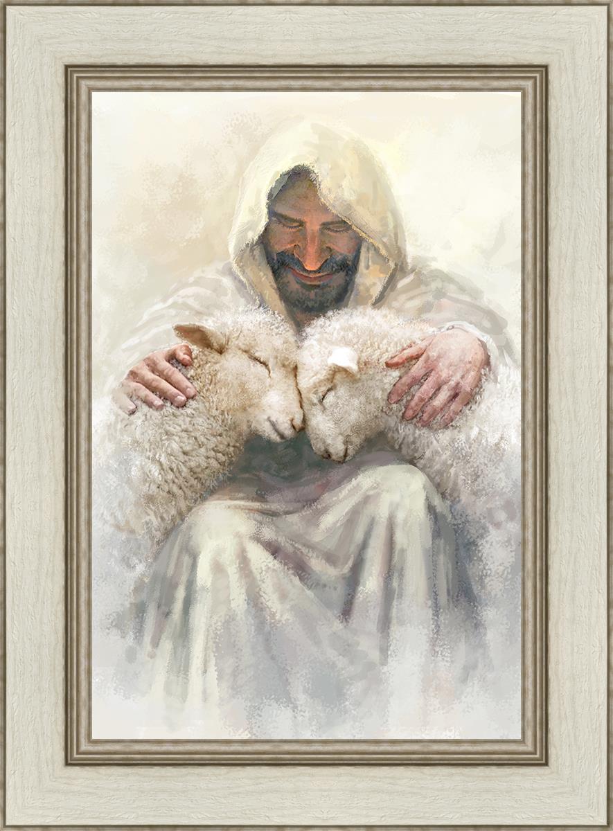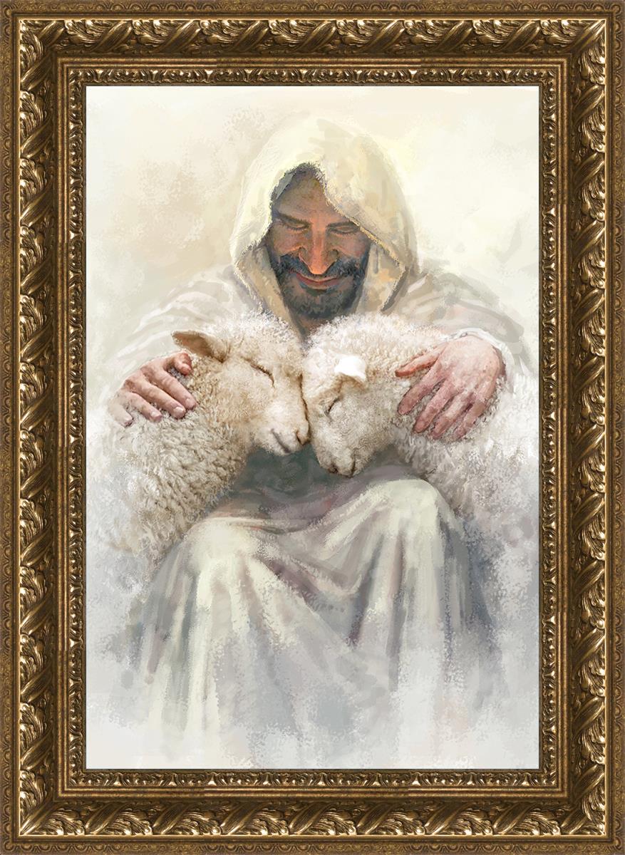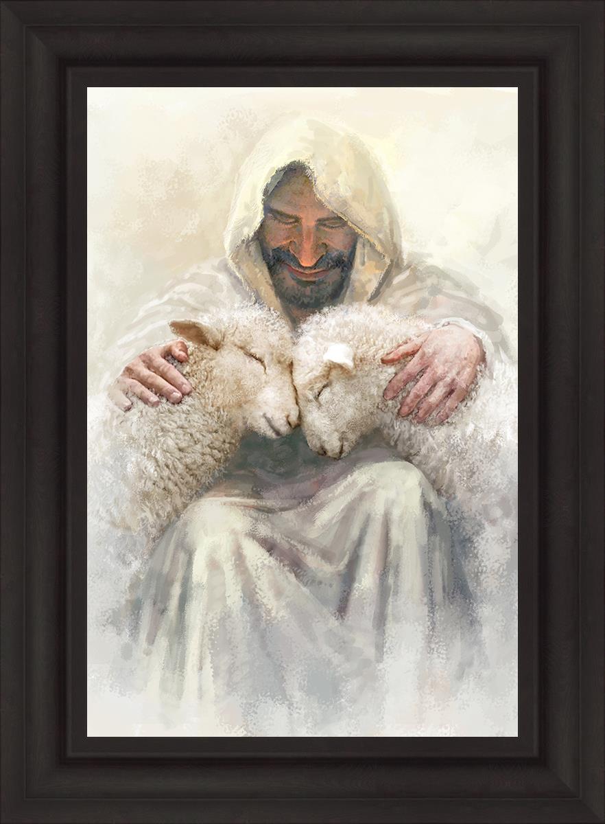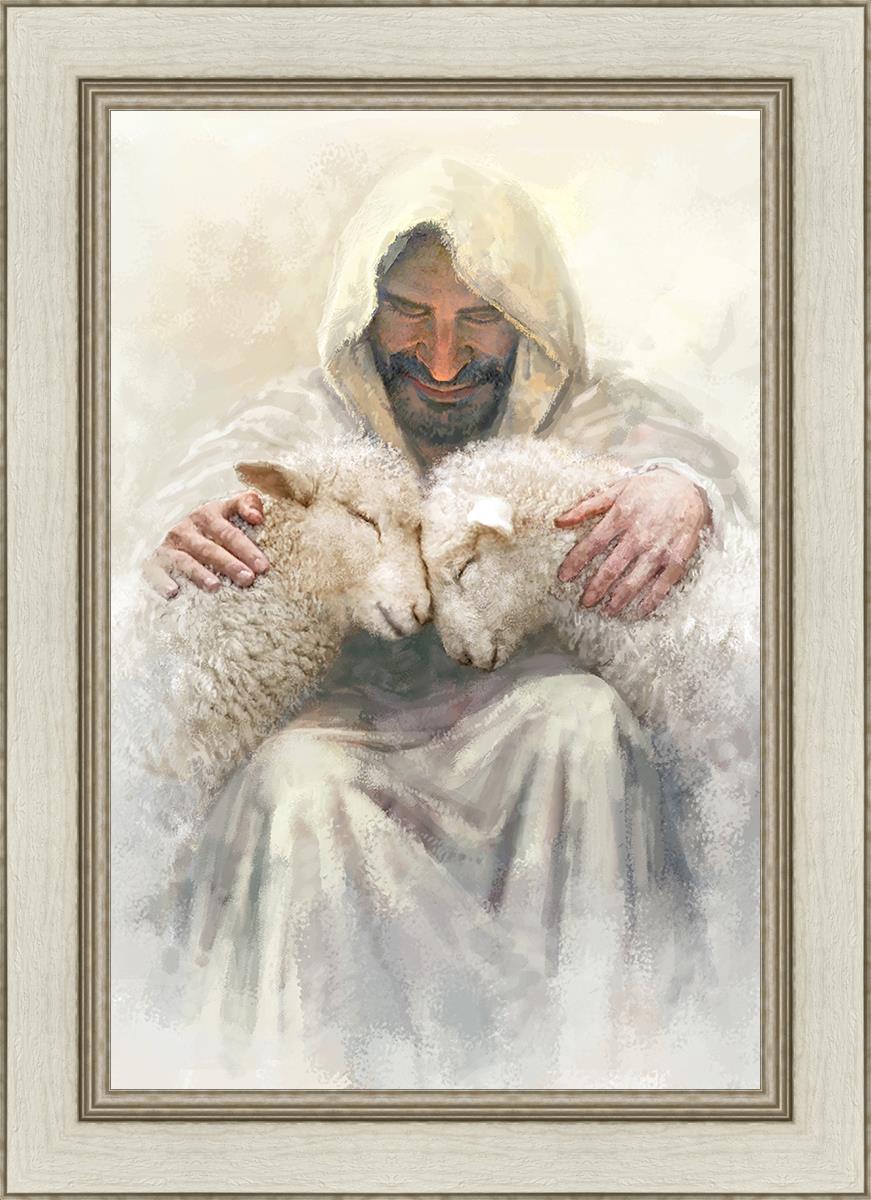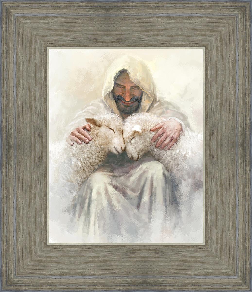 Painting of Love by Yongsung Kim depicting Christ holding two sheep.