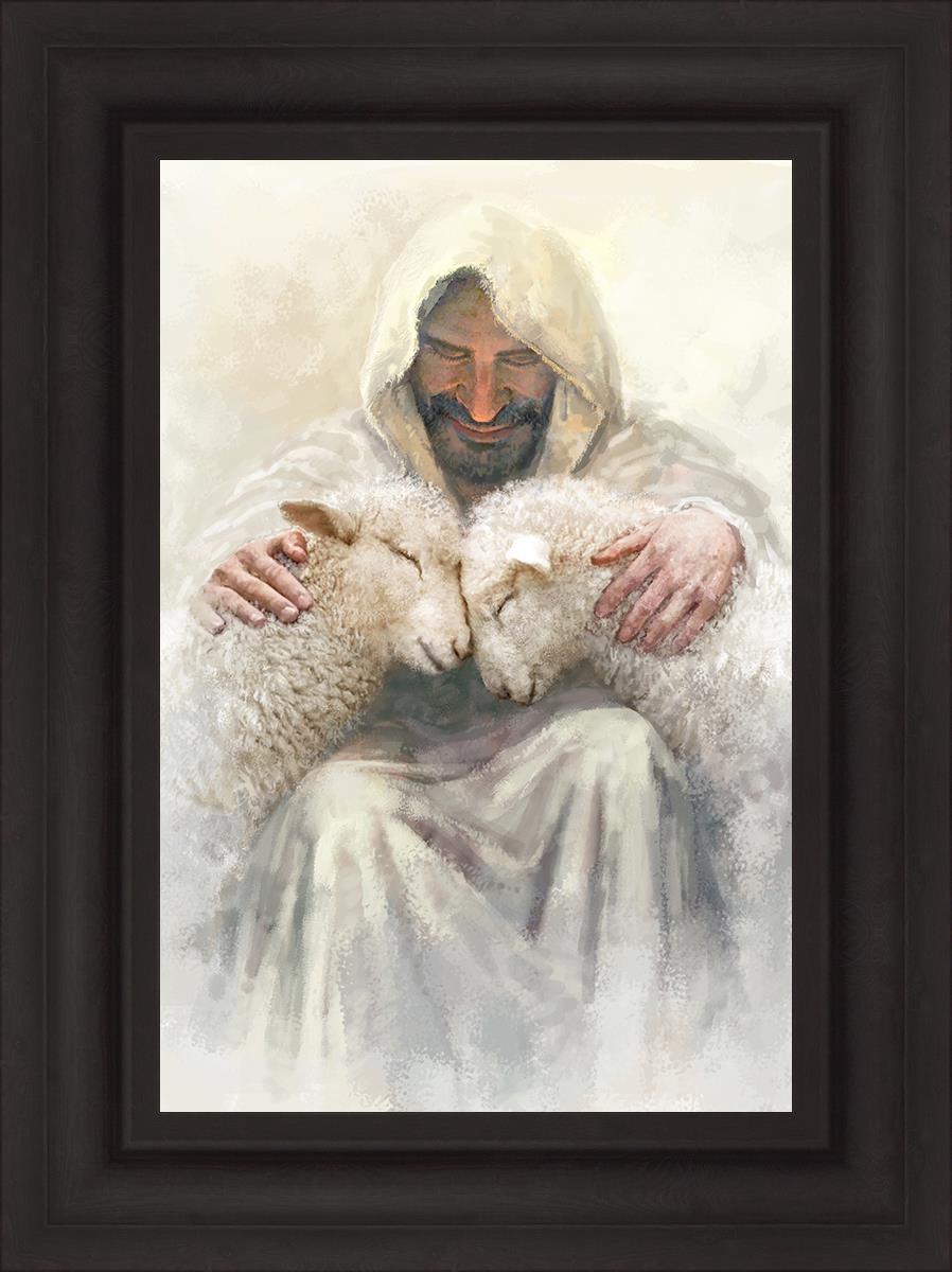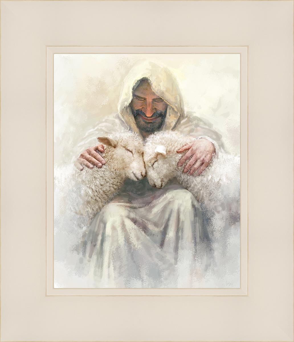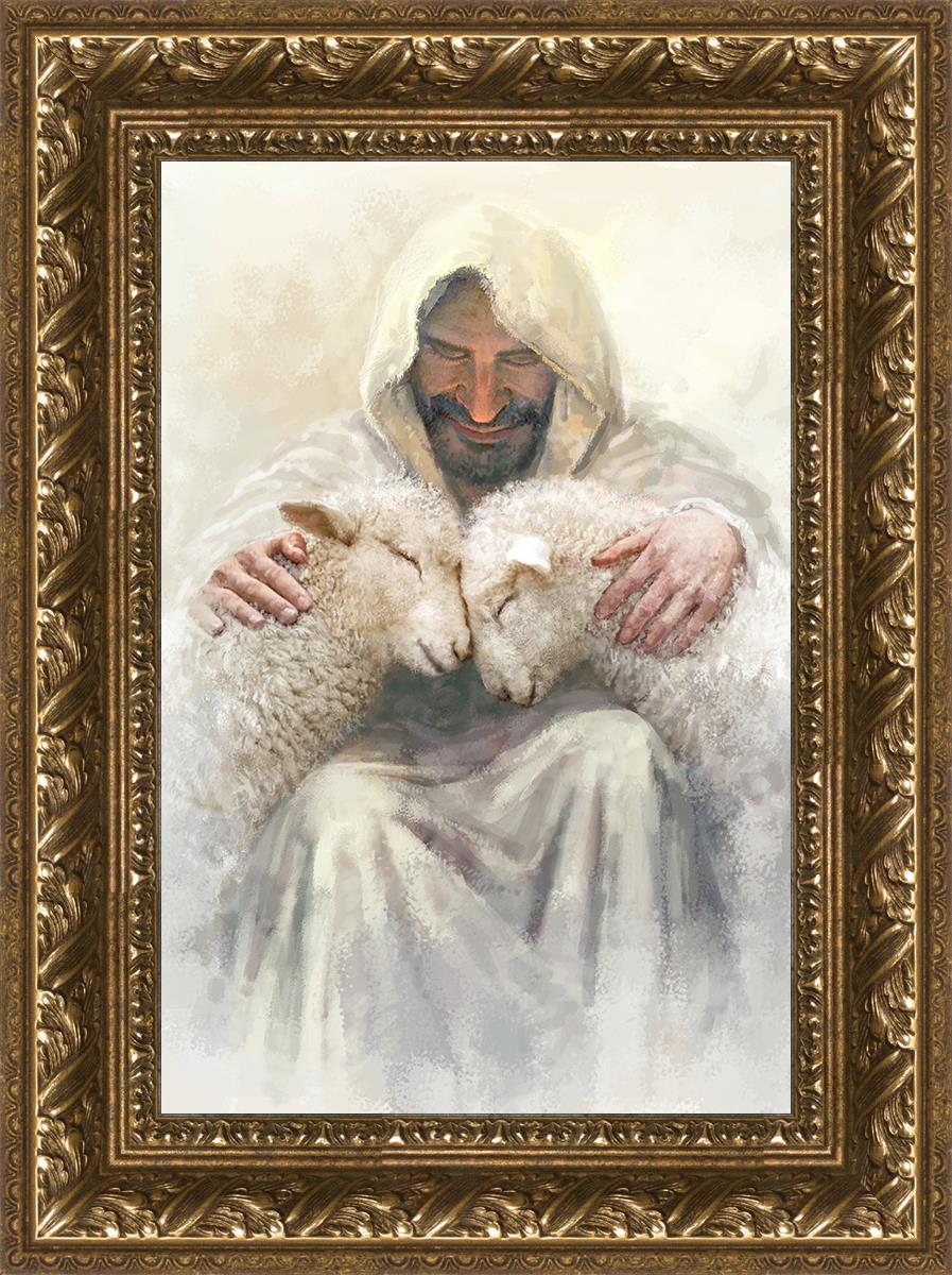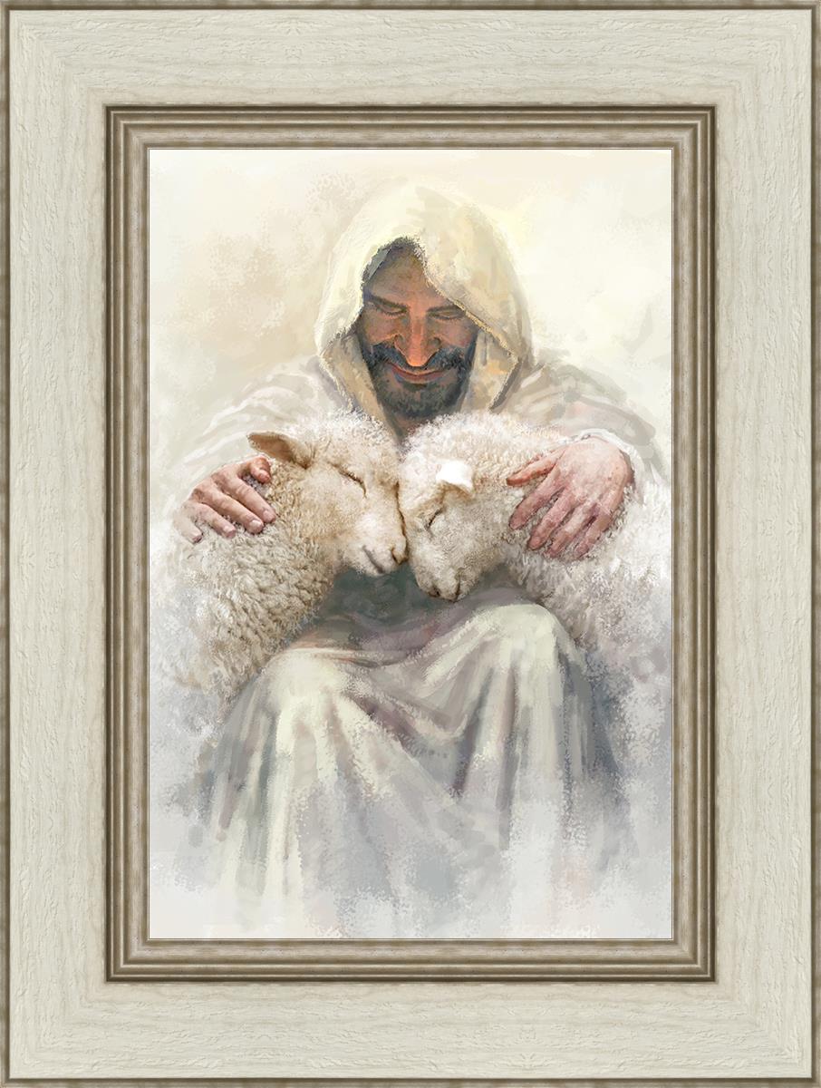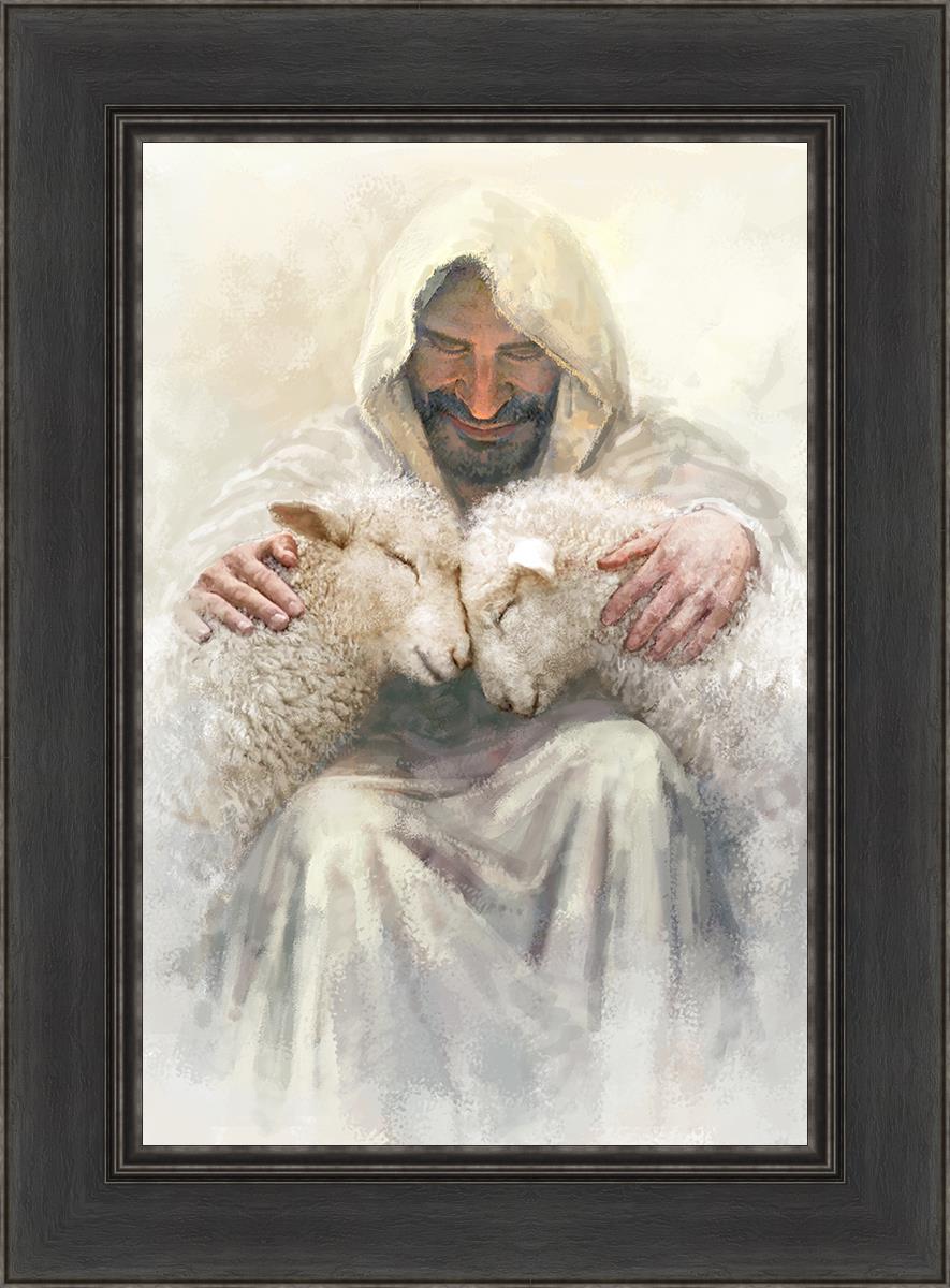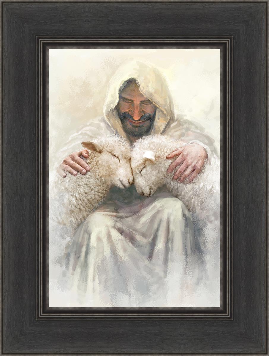 Painting of Love by Yongsung Kim depicting Christ holding two sheep.