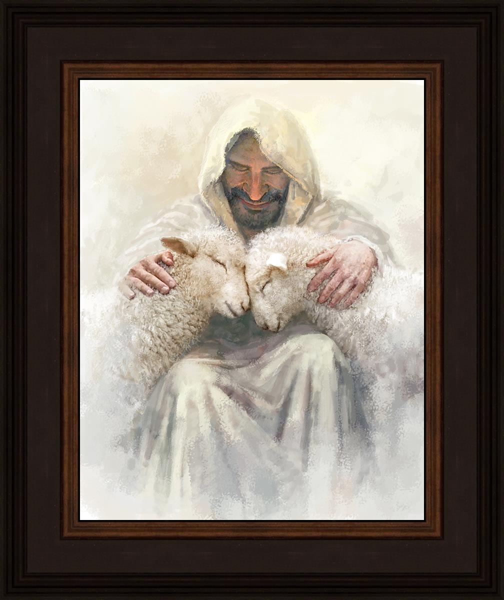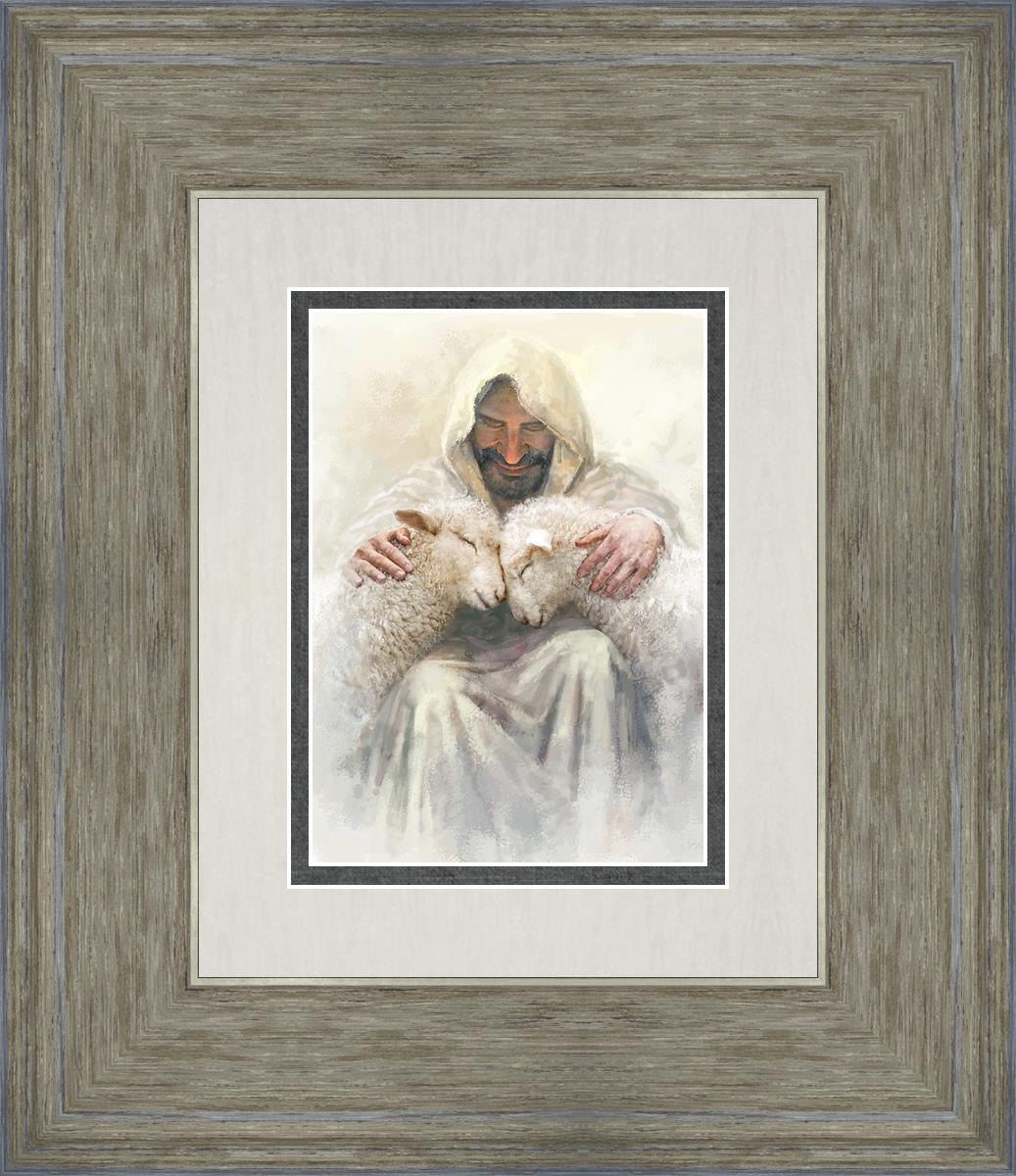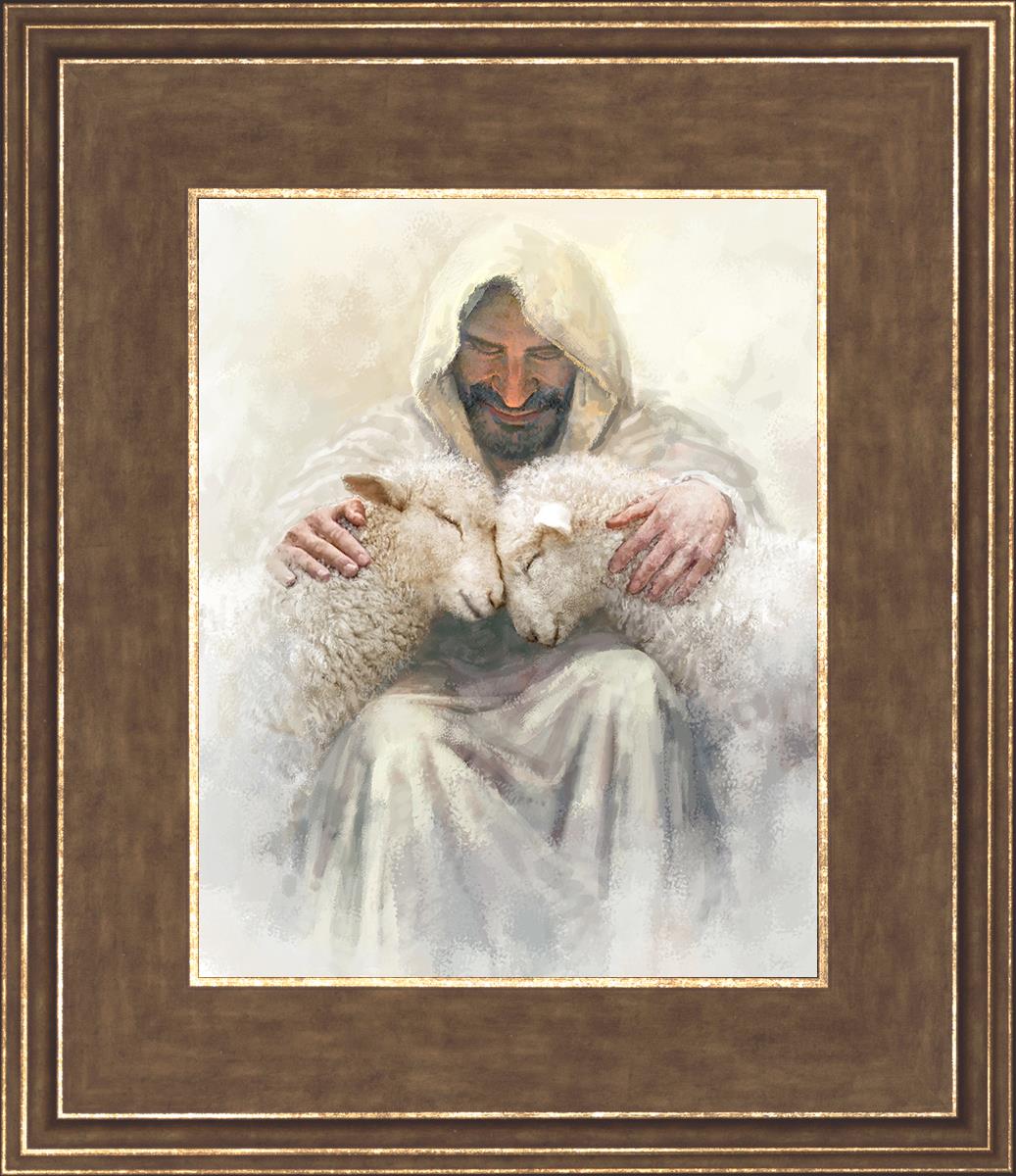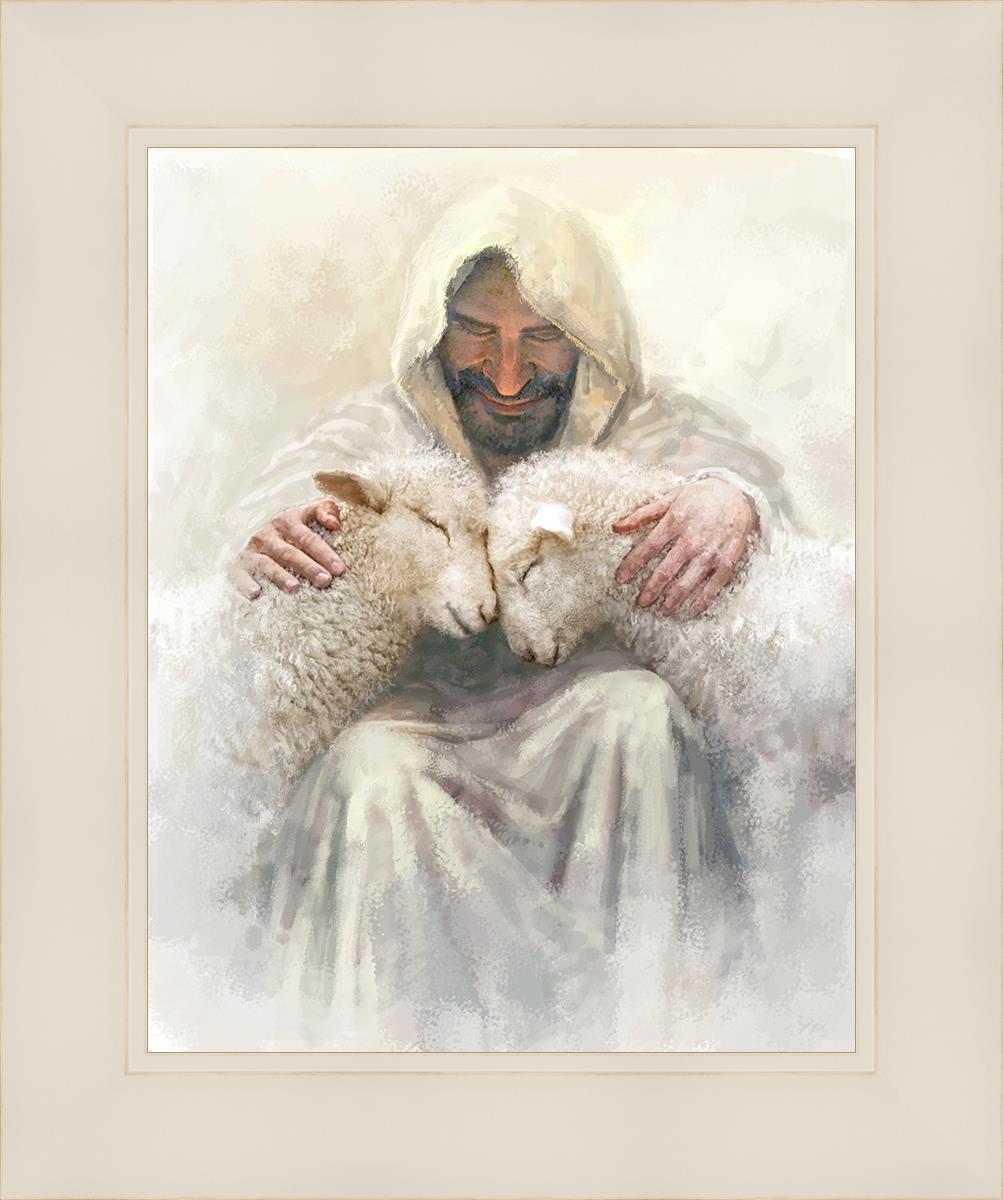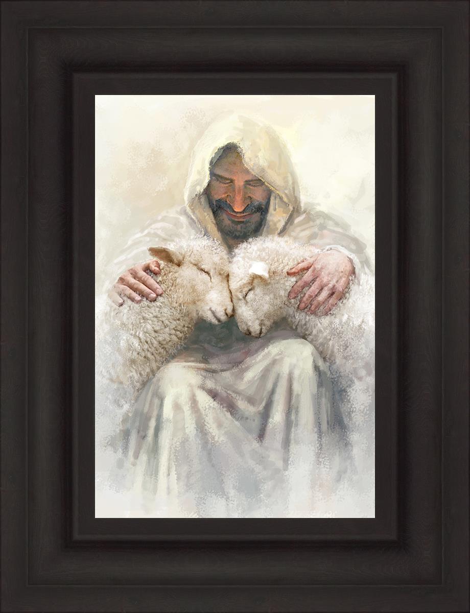 Painting of Love by Yongsung Kim depicting Christ holding two sheep.