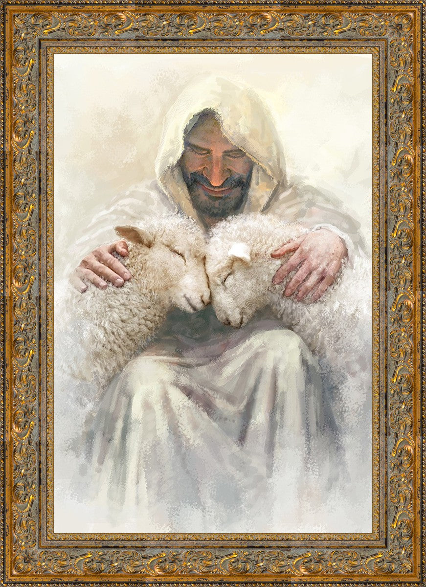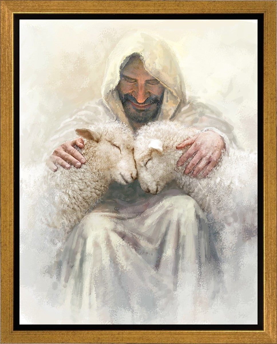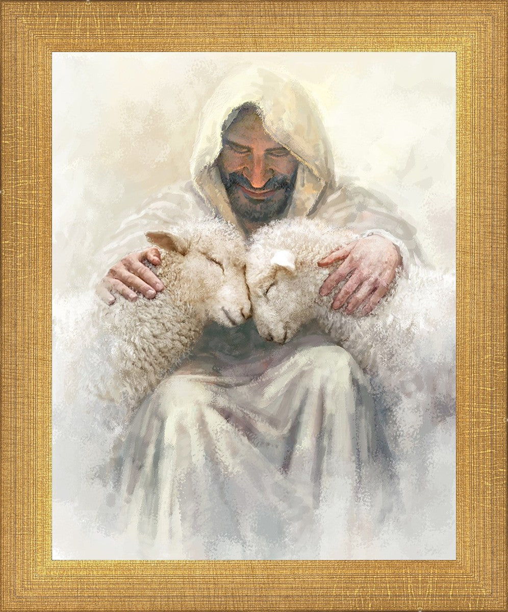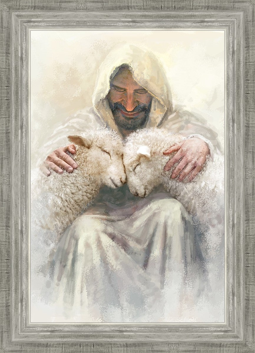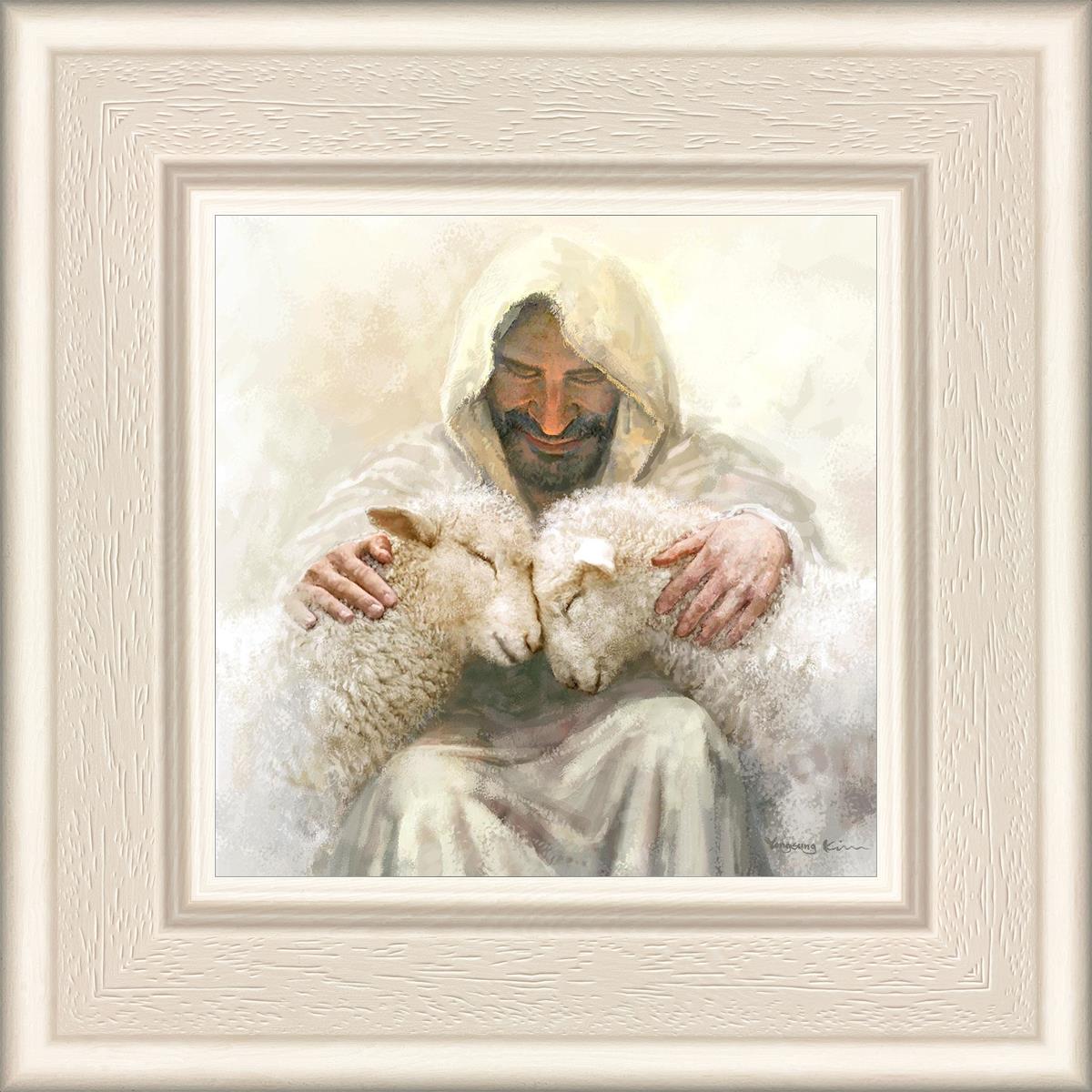 Painting of Love by Yongsung Kim depicting Christ holding two sheep.