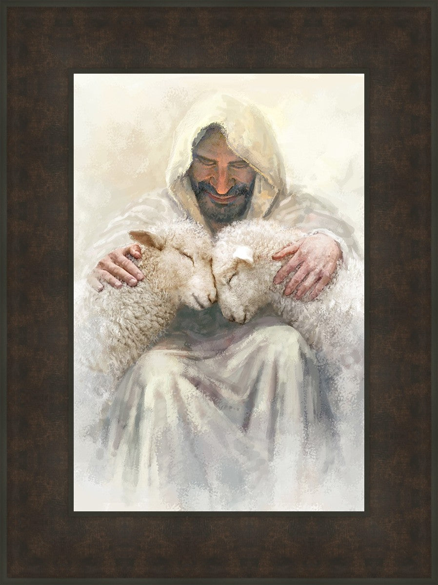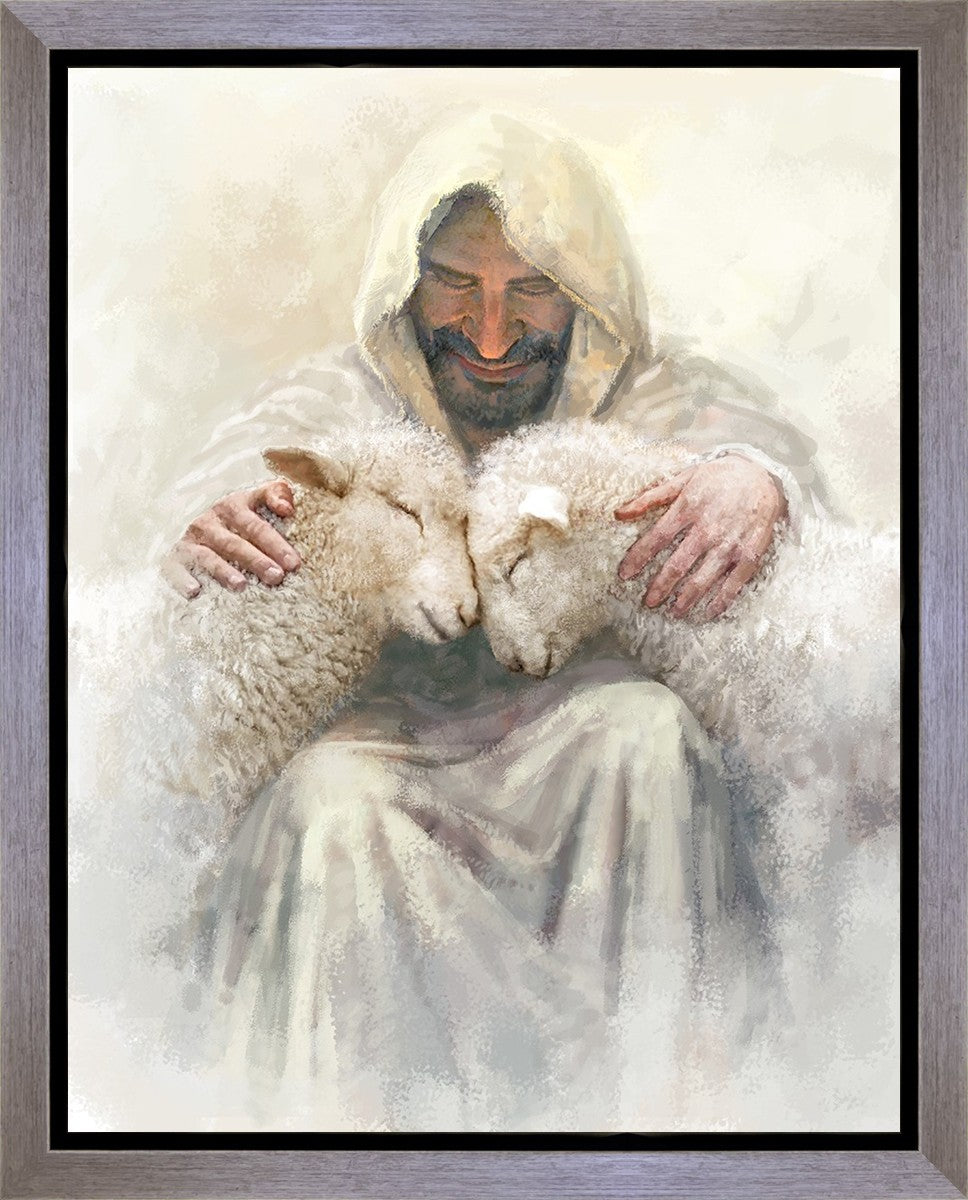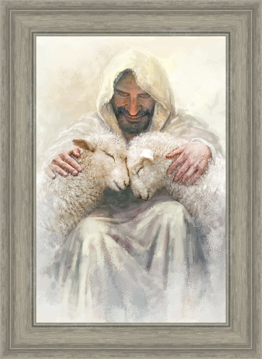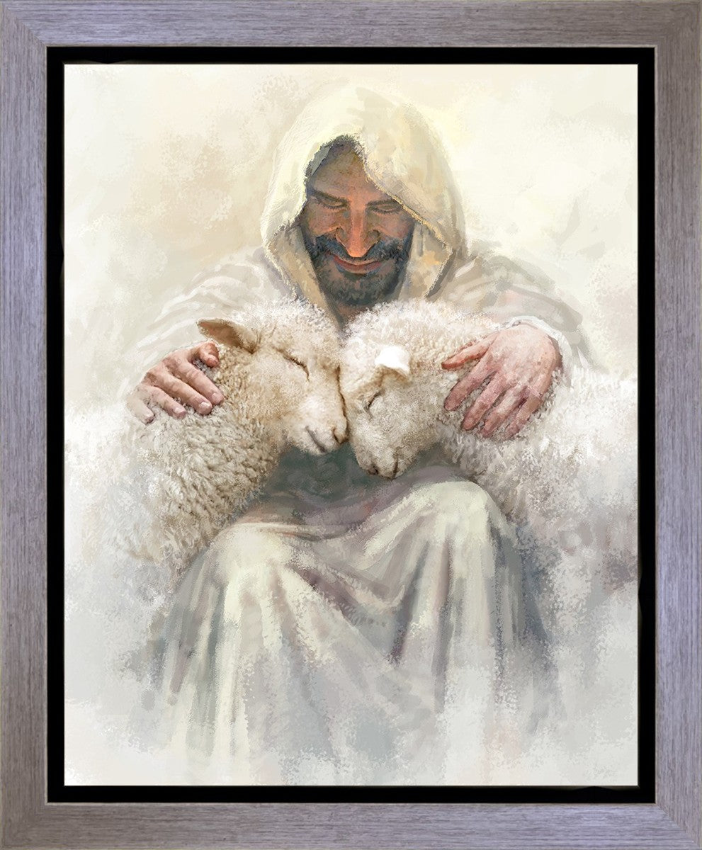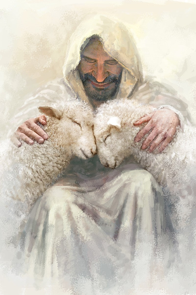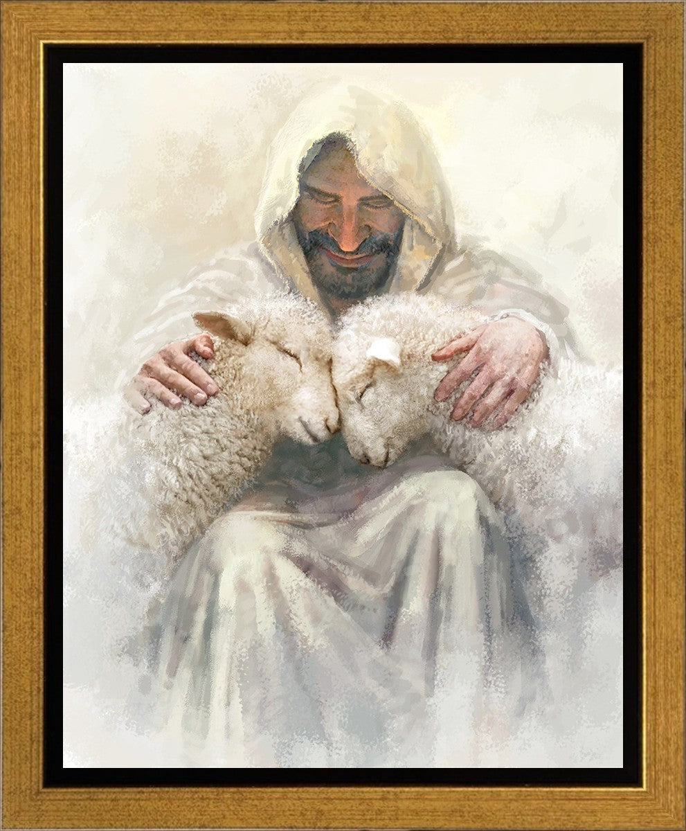 Painting of Love by Yongsung Kim depicting Christ holding two sheep.
