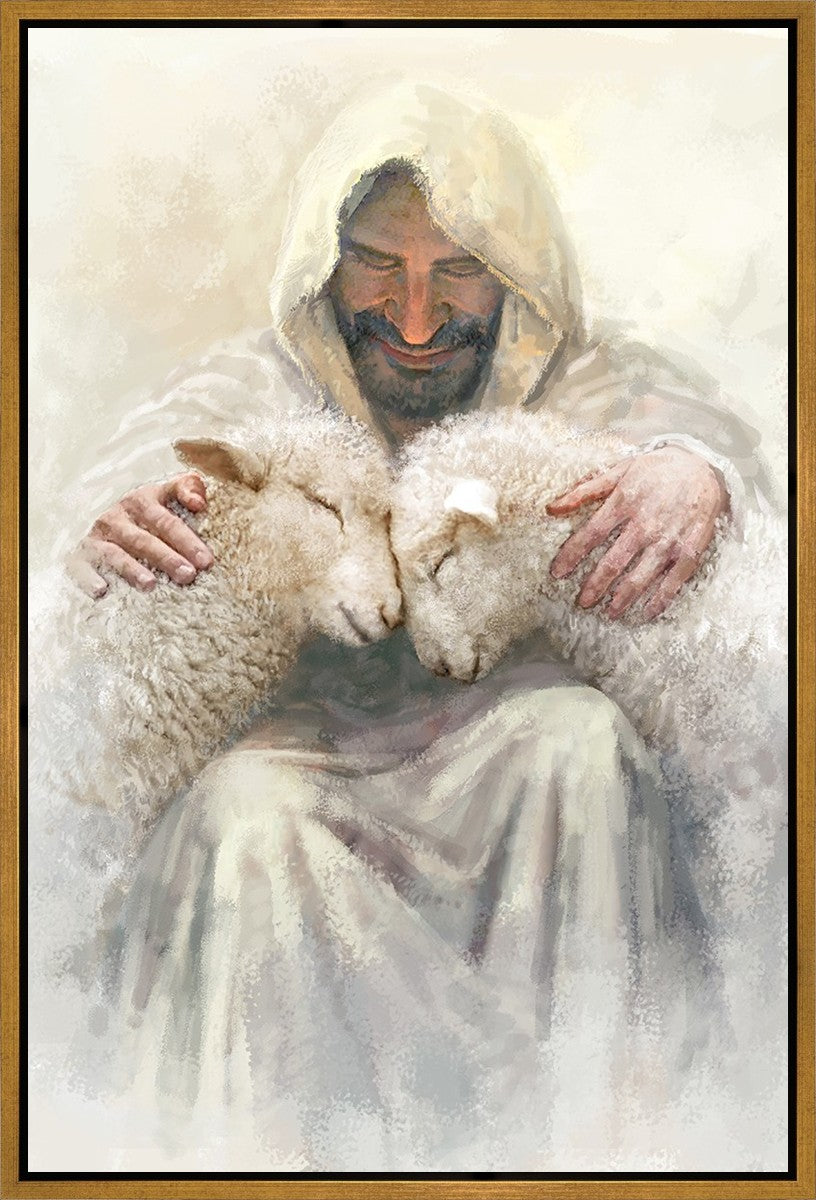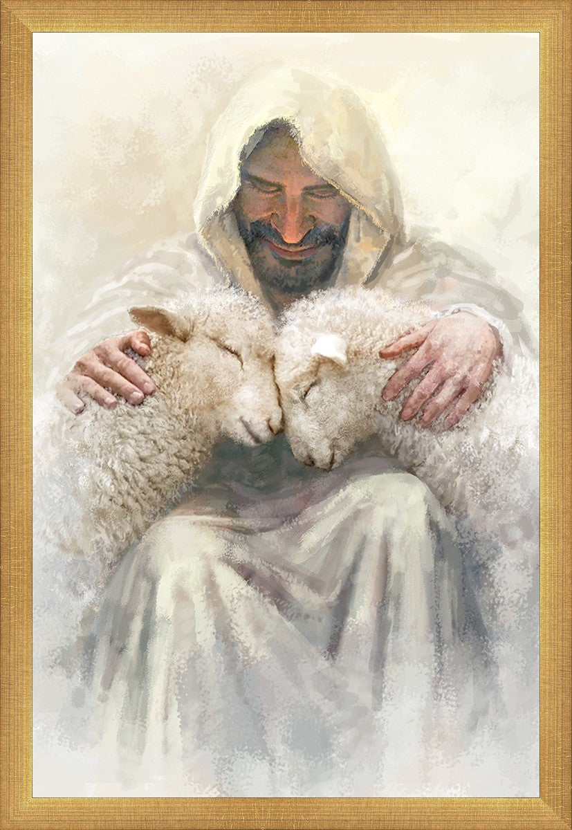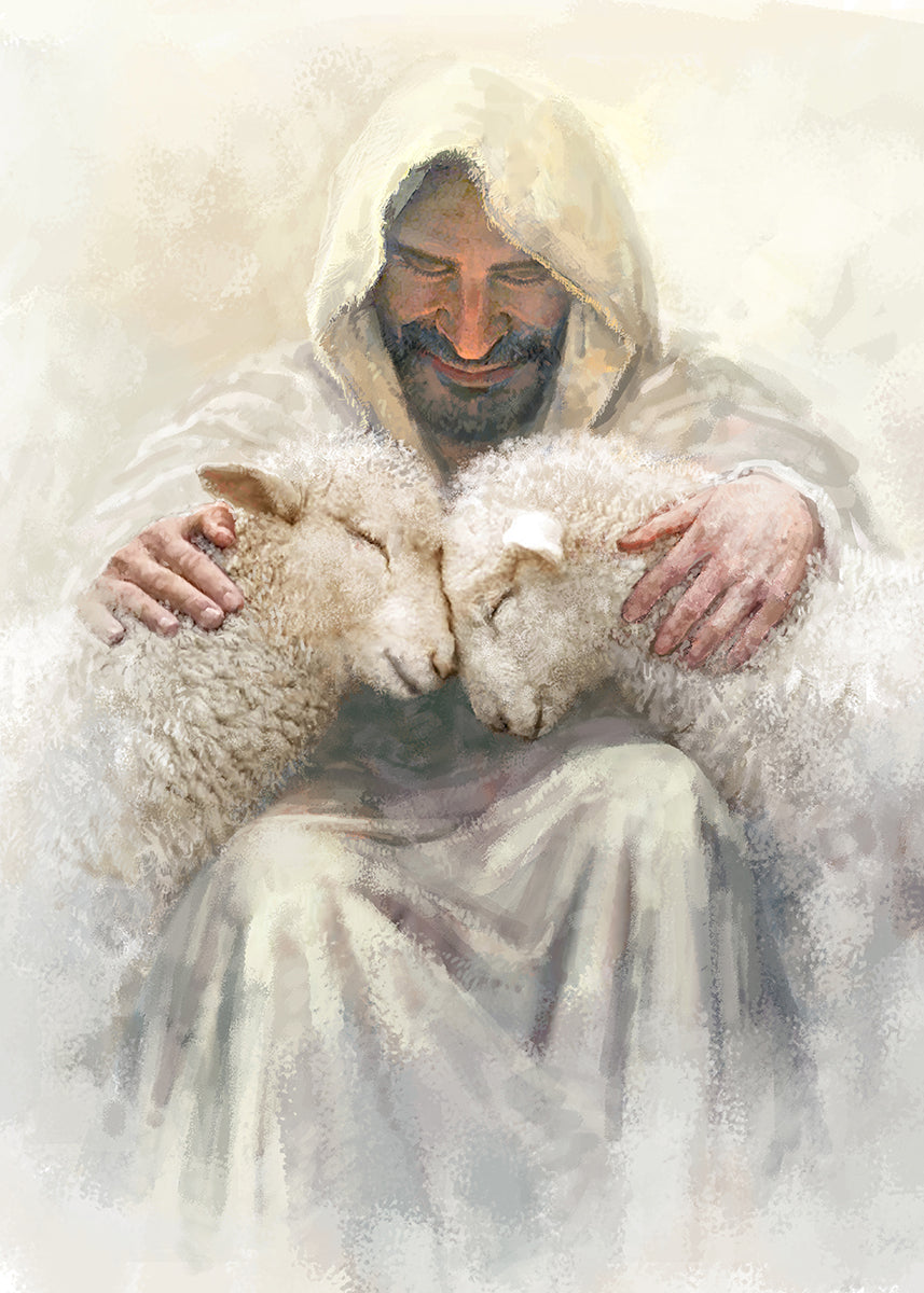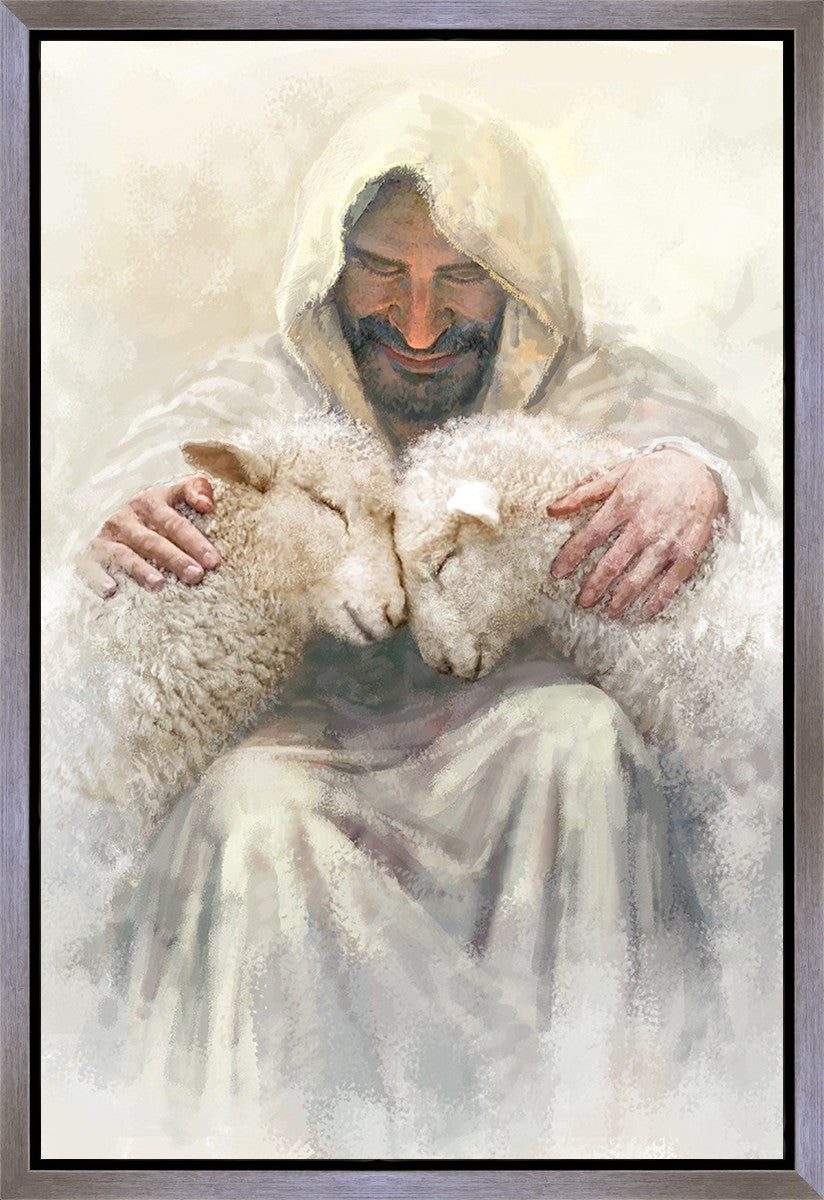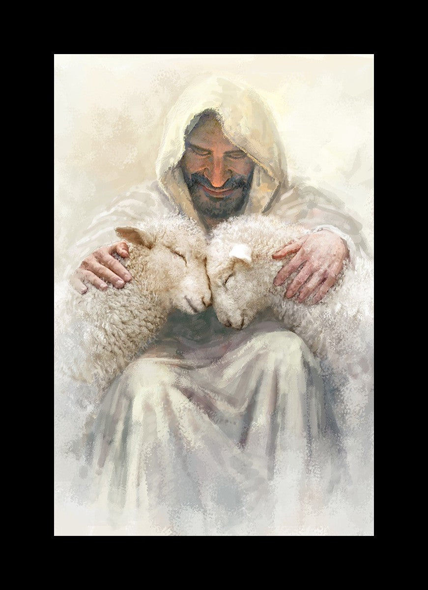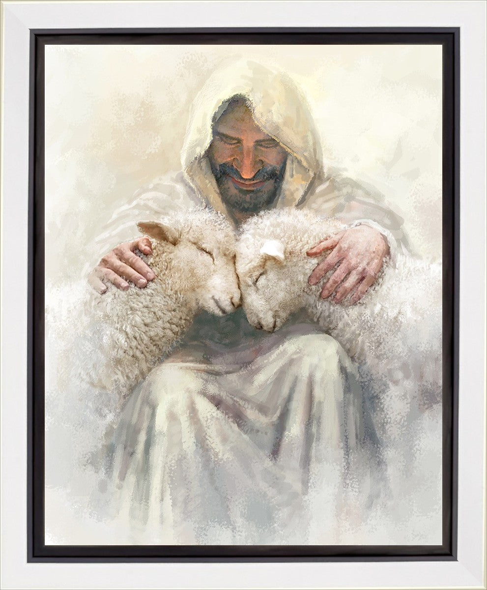 Painting of Love by Yongsung Kim depicting Christ holding two sheep.