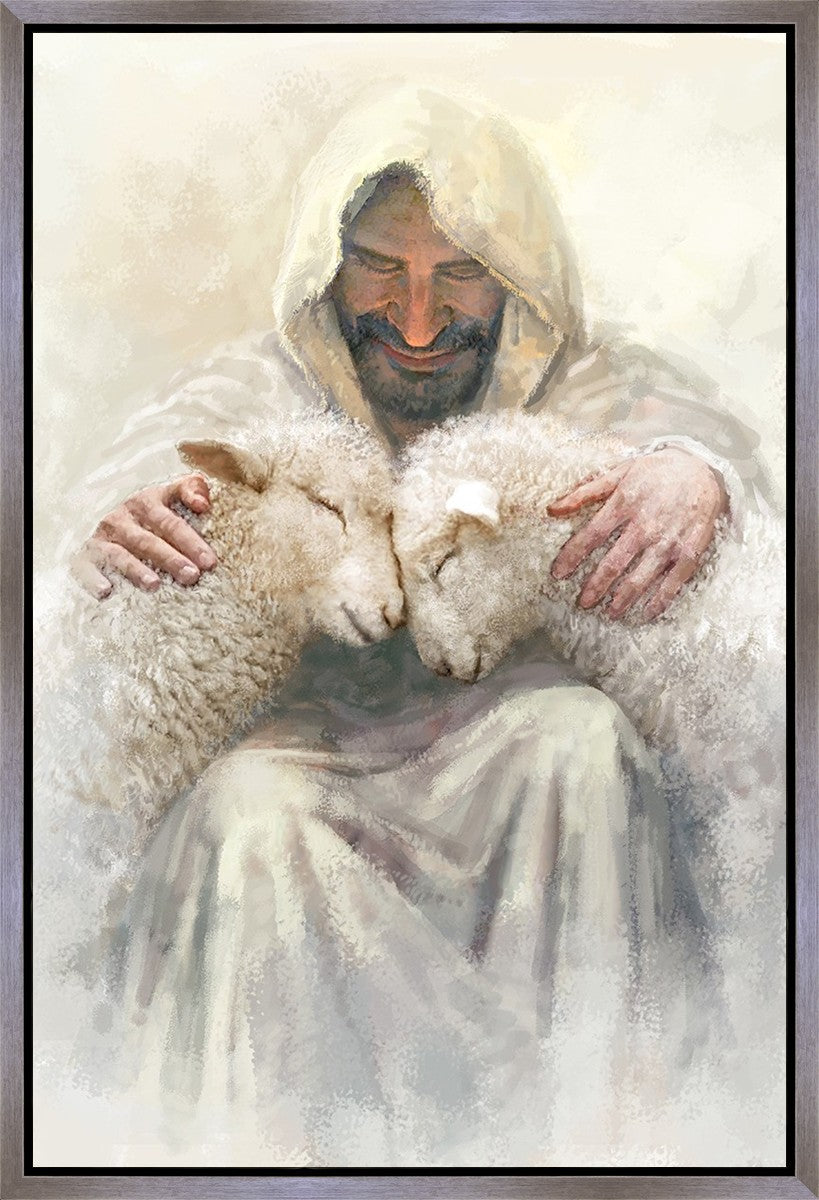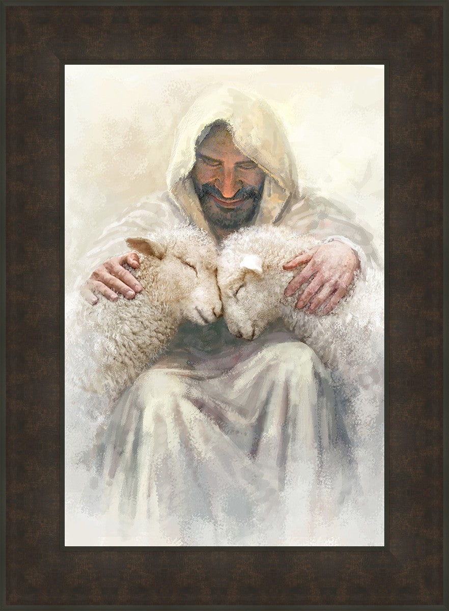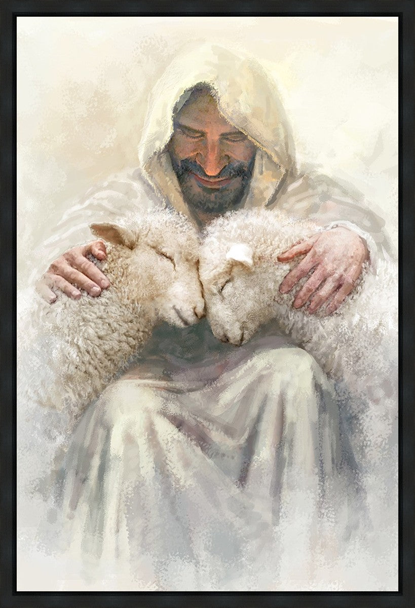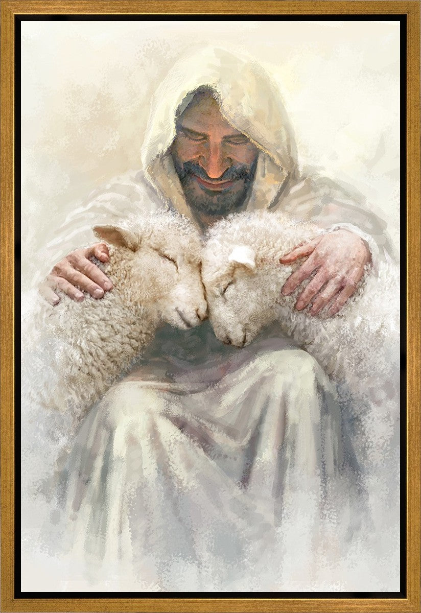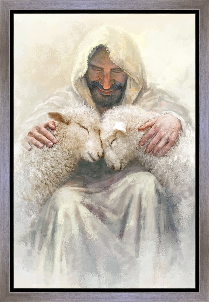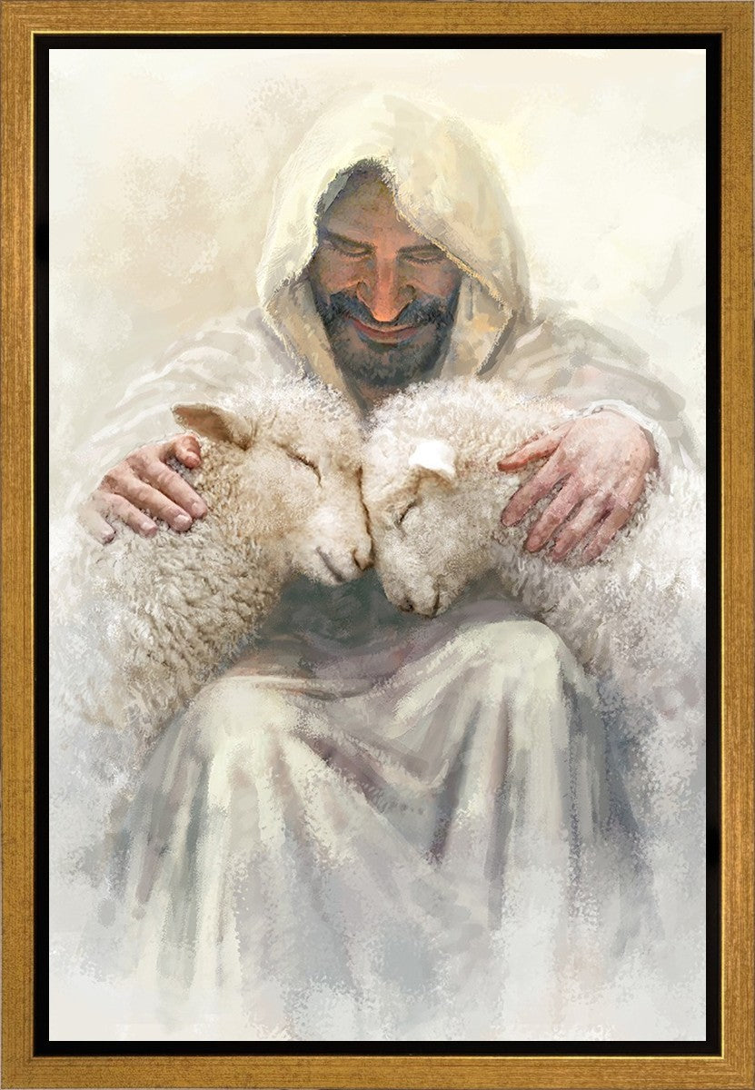 Painting of Love by Yongsung Kim depicting Christ holding two sheep.