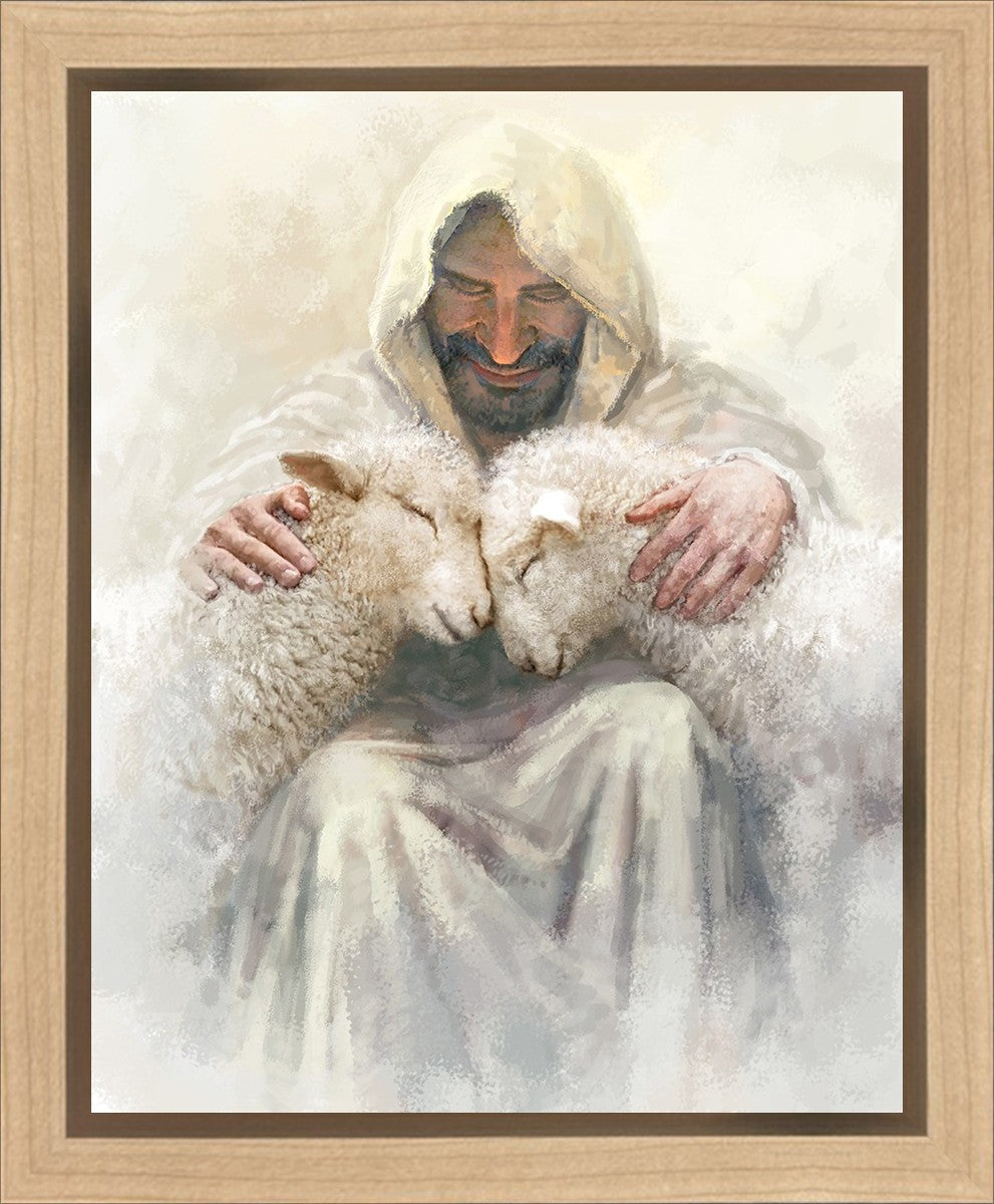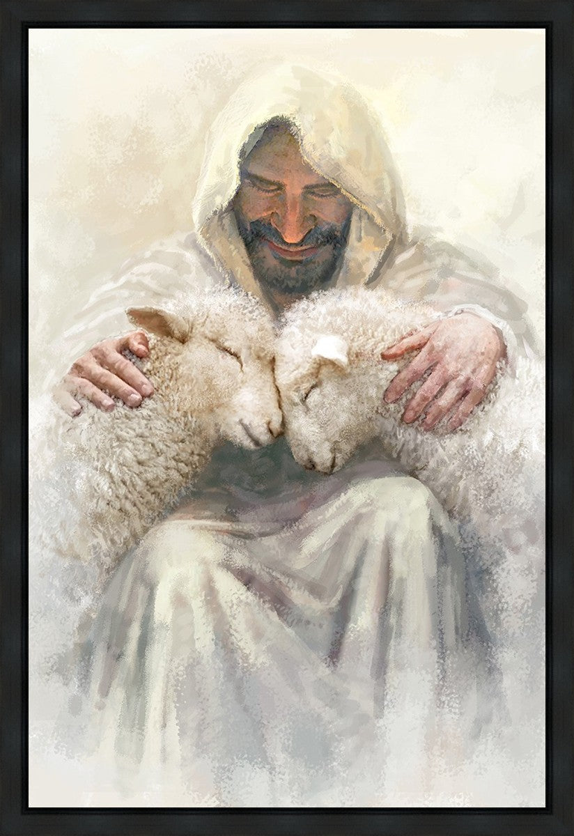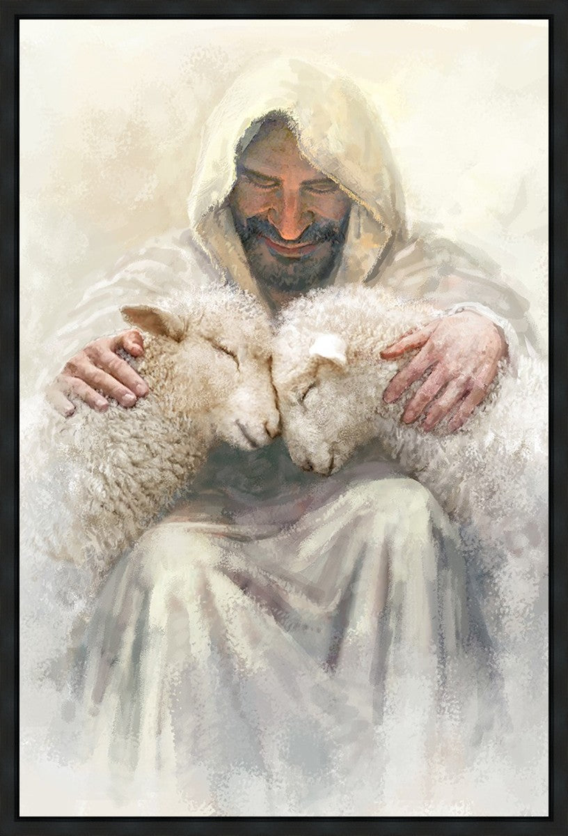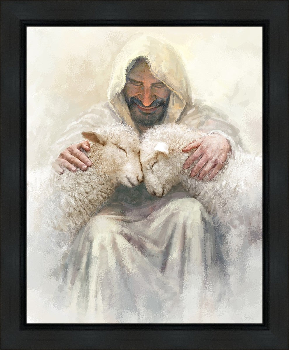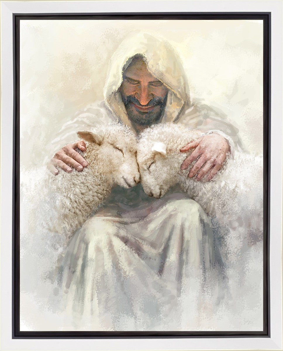 Painting of Love by Yongsung Kim depicting Christ holding two sheep.