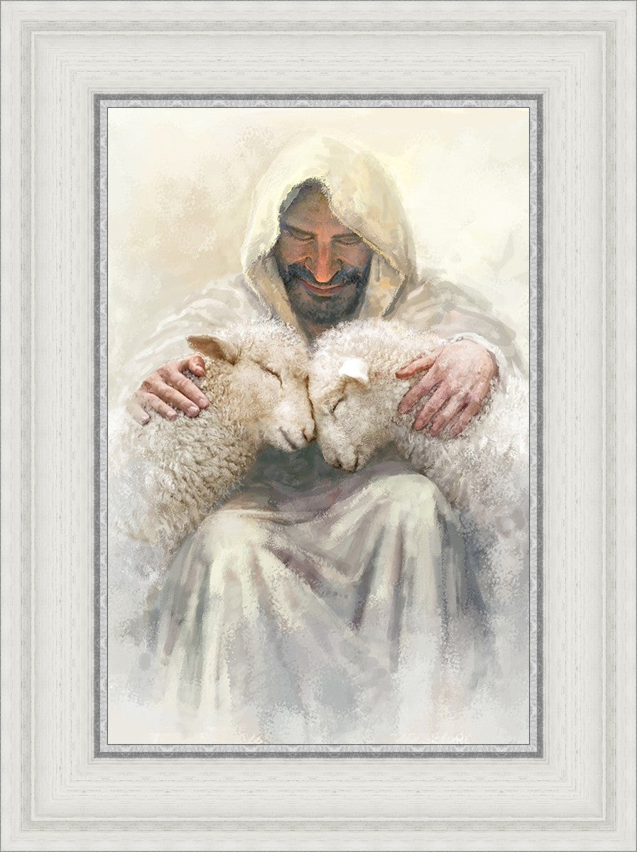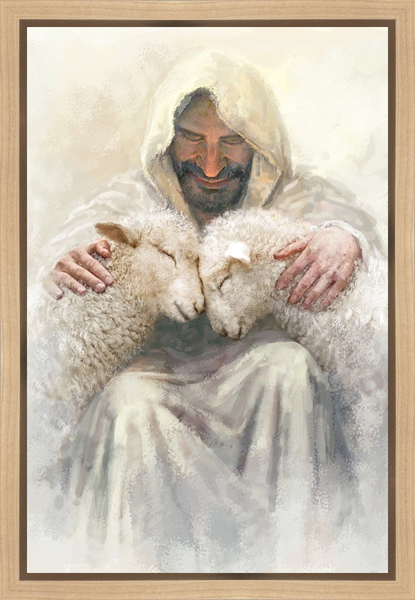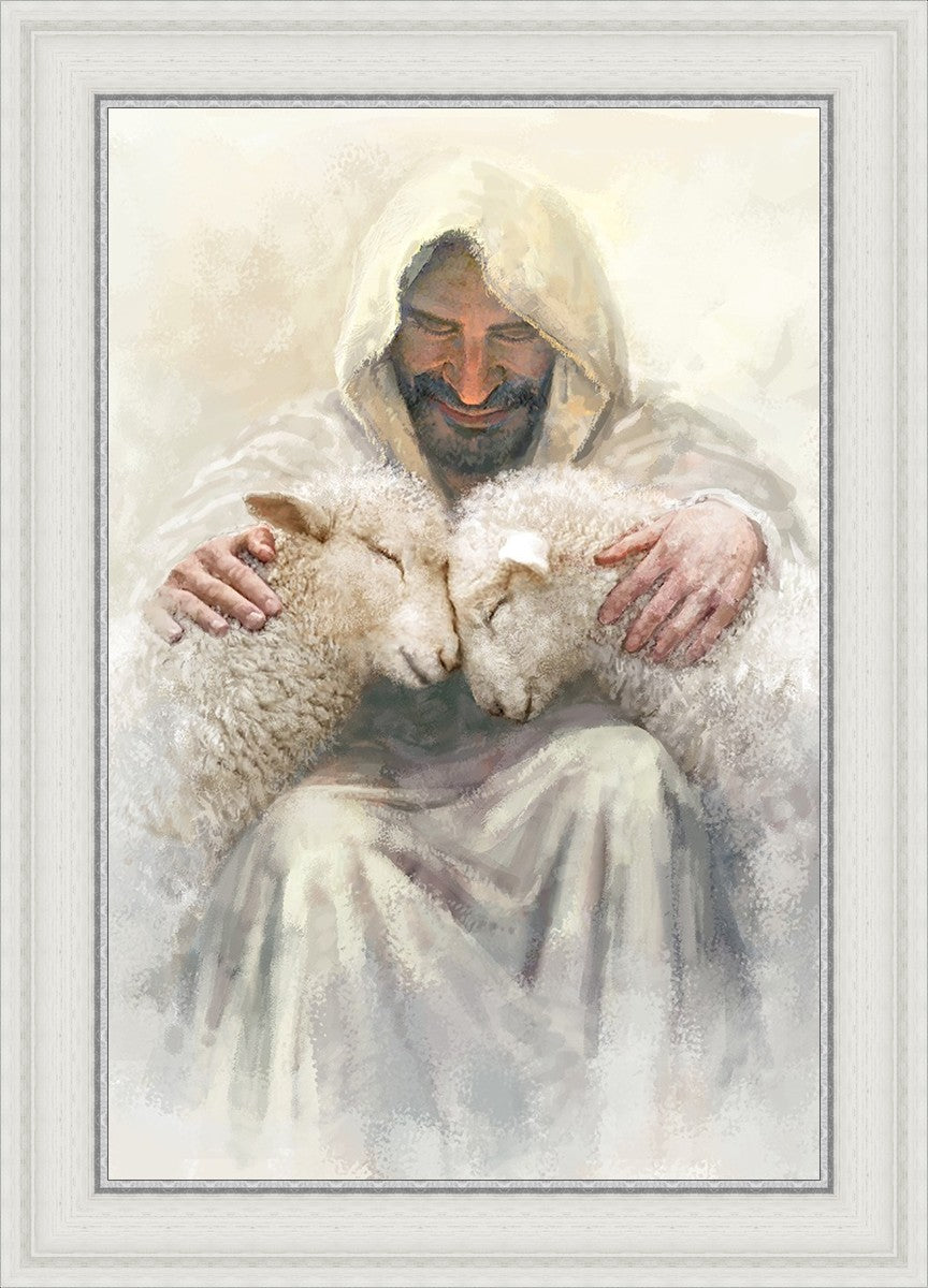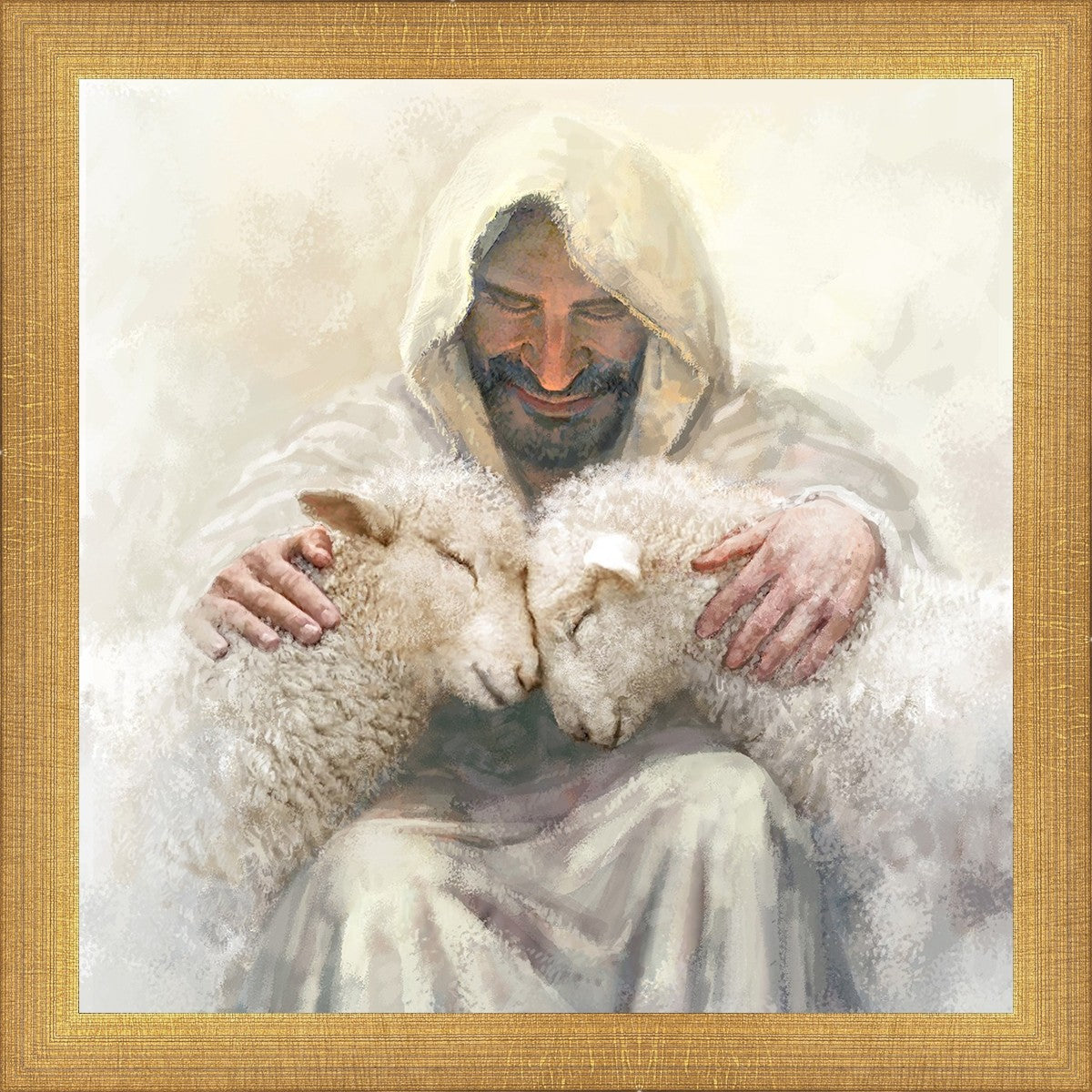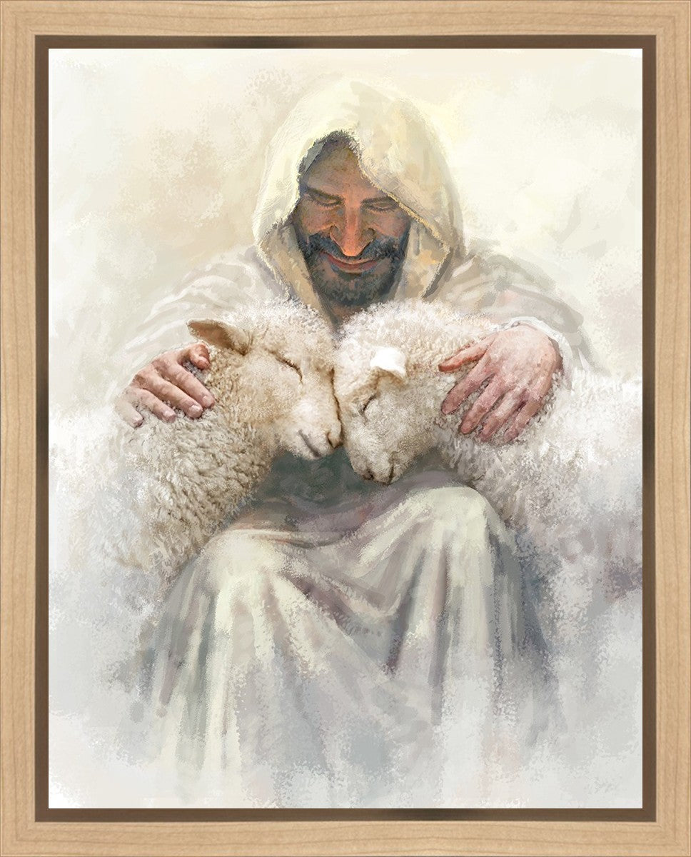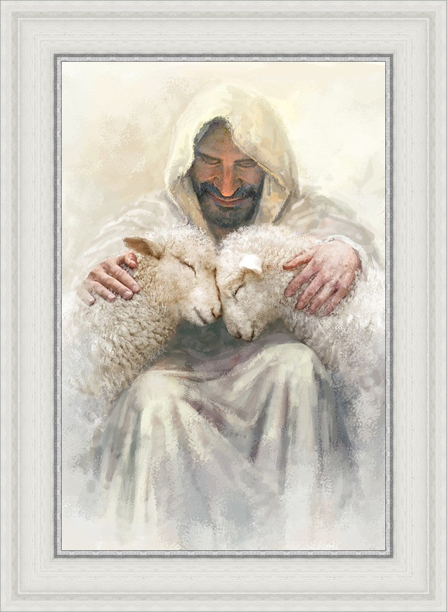 Painting of Love by Yongsung Kim depicting Christ holding two sheep.