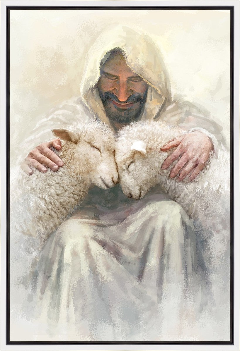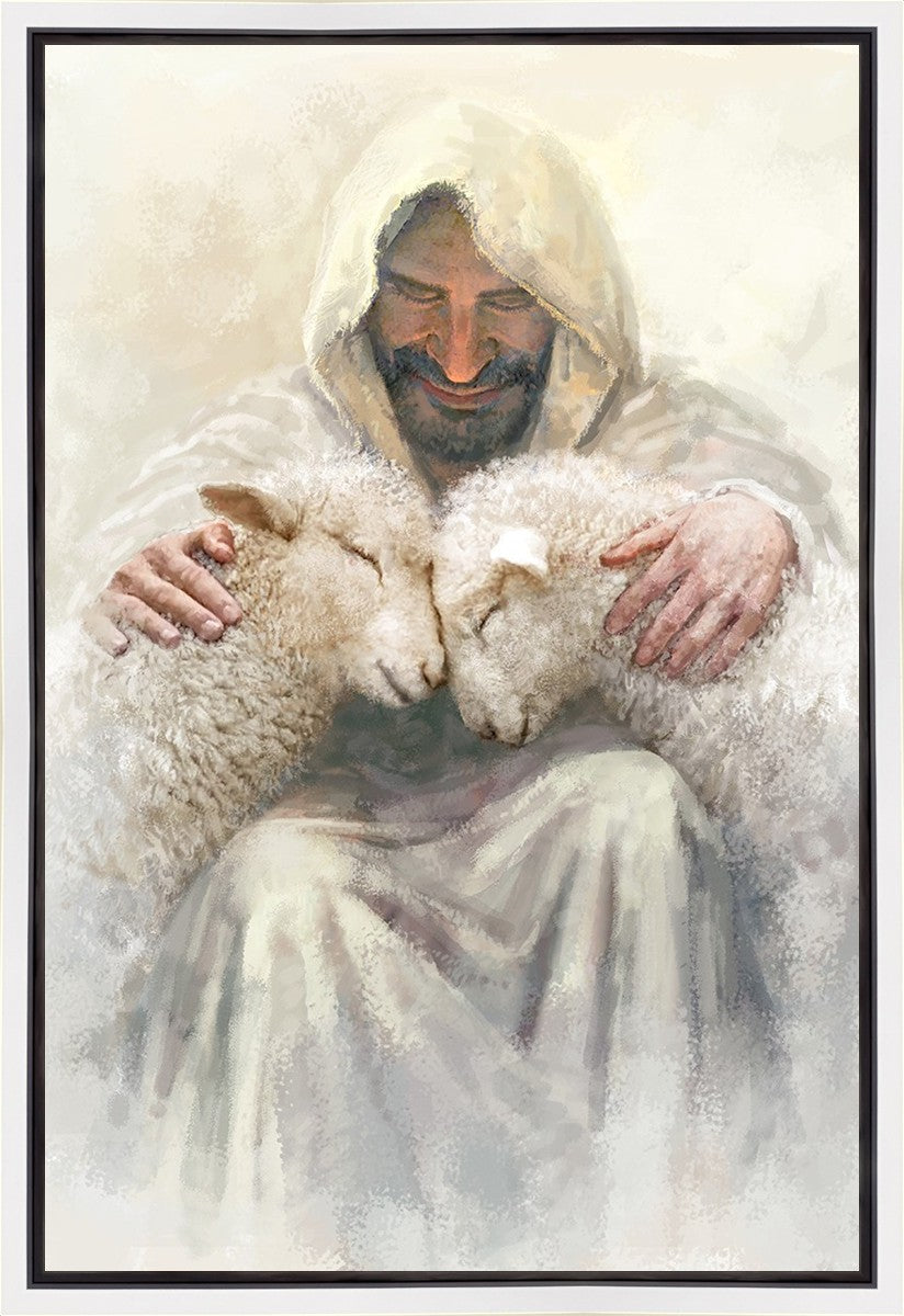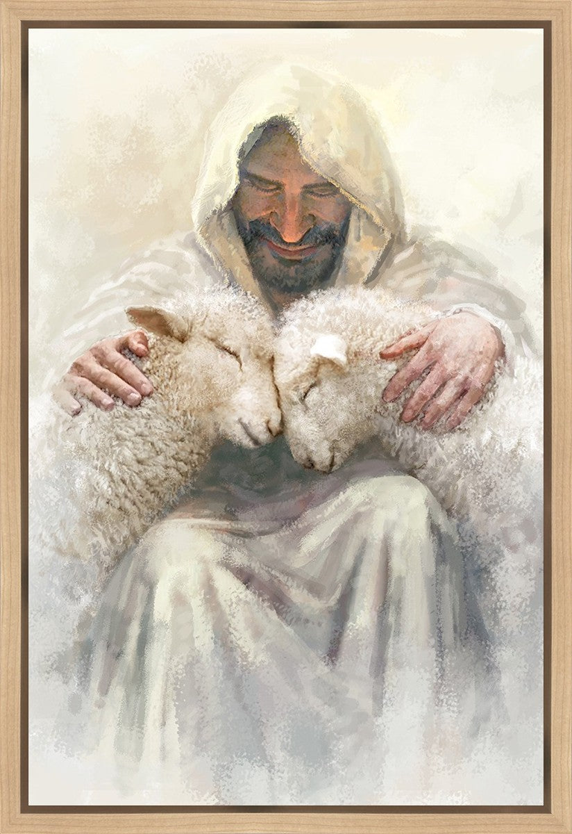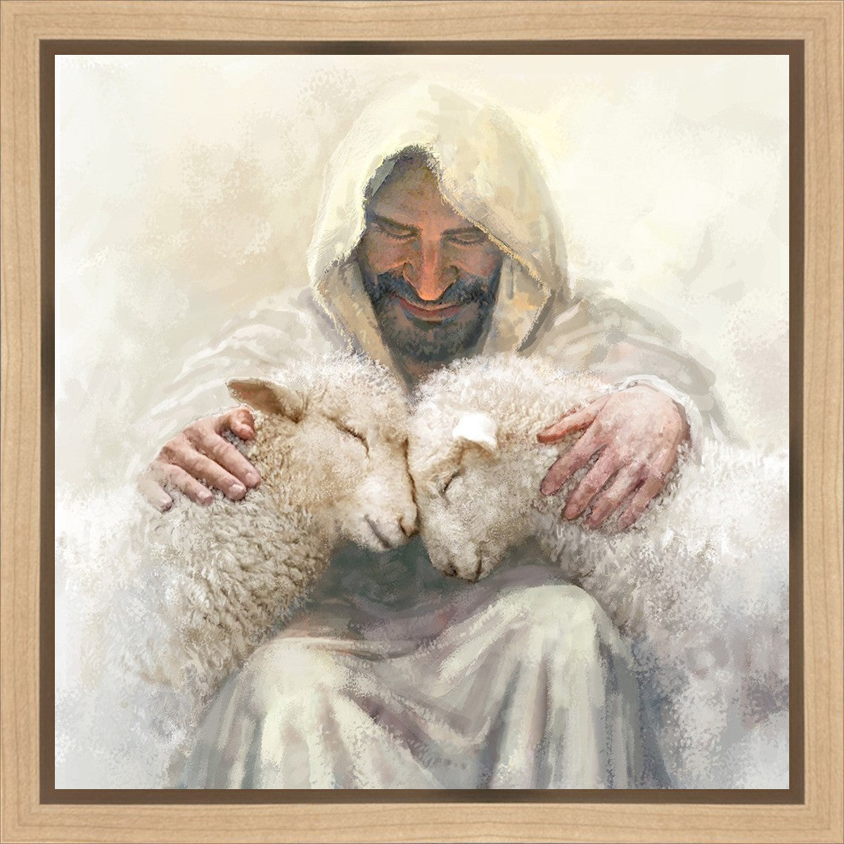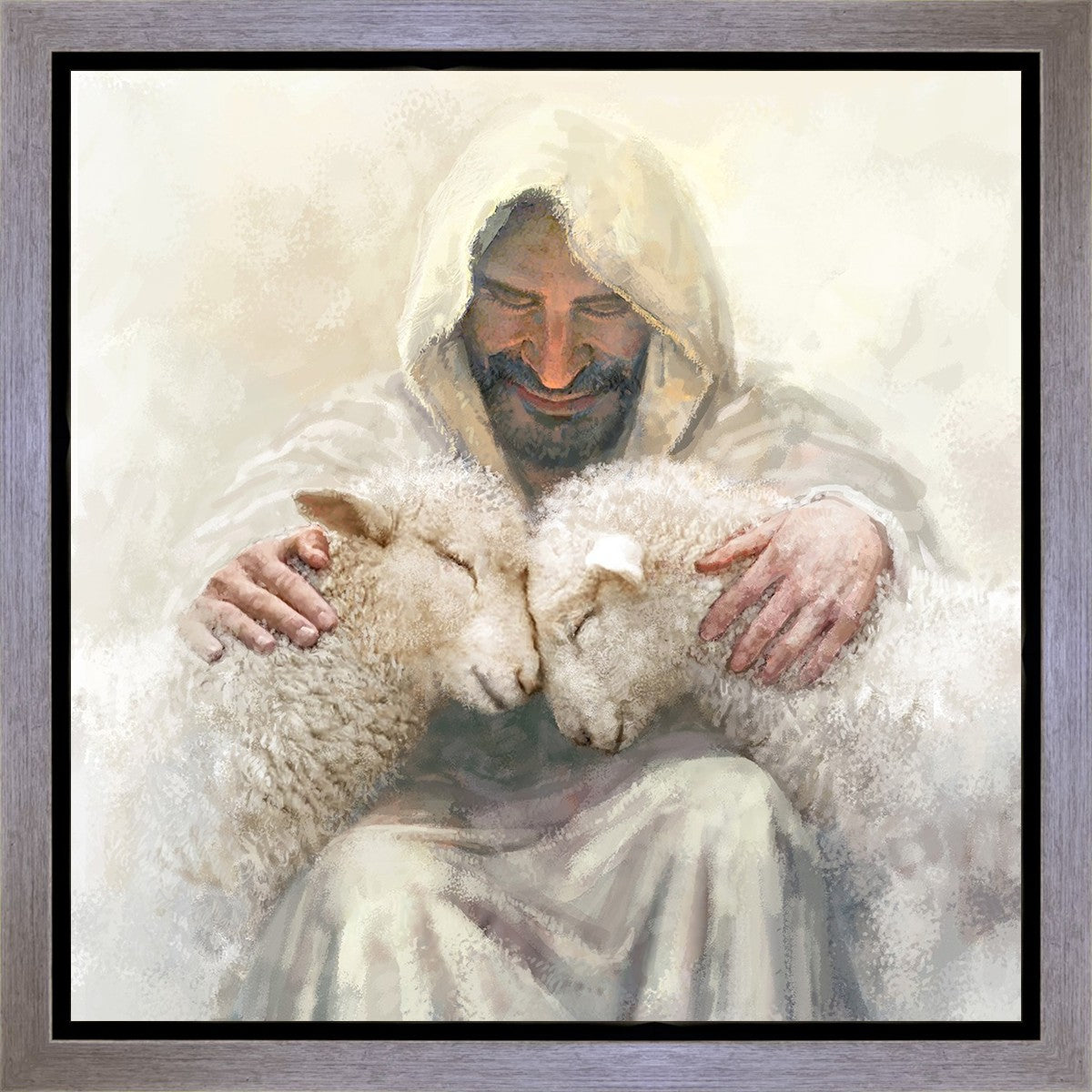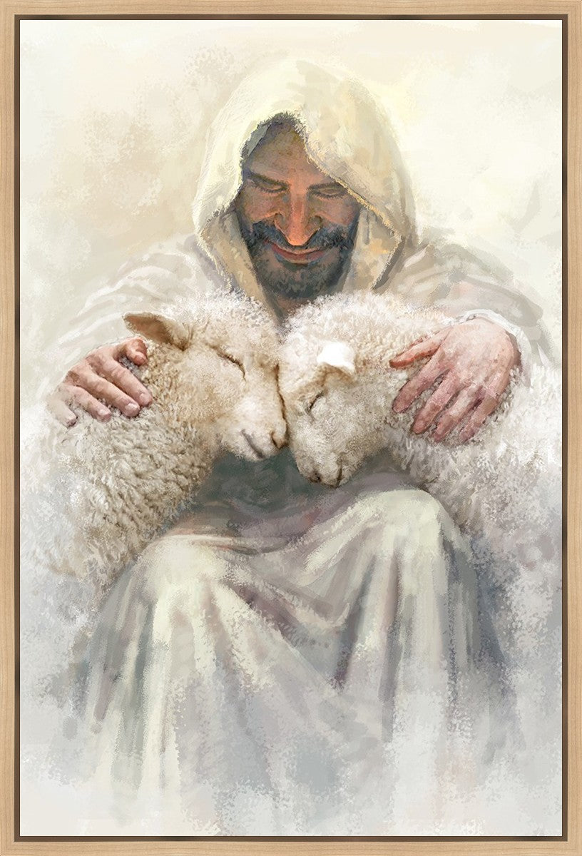 Painting of Love by Yongsung Kim depicting Christ holding two sheep.