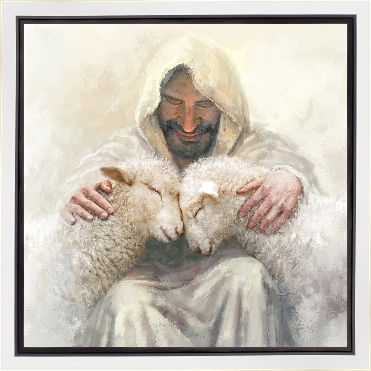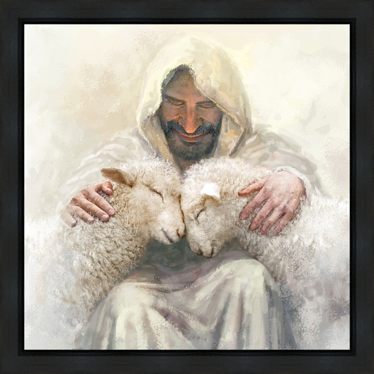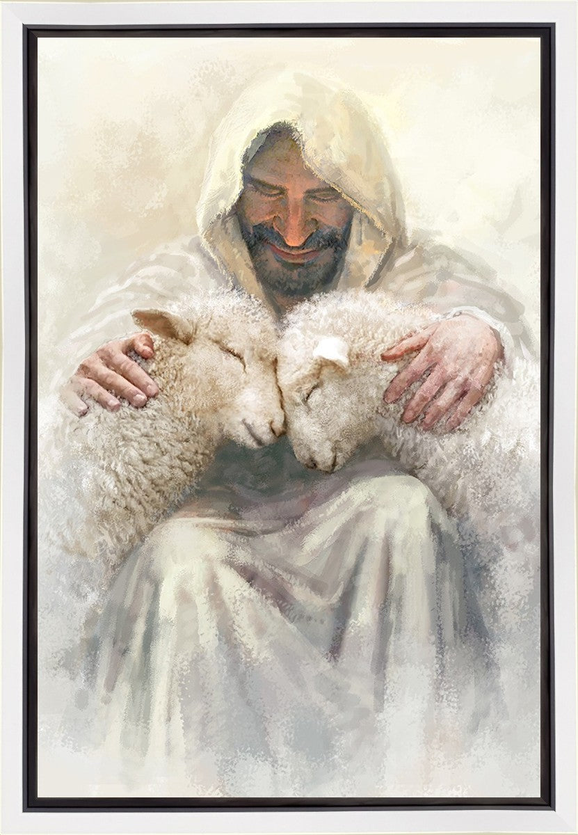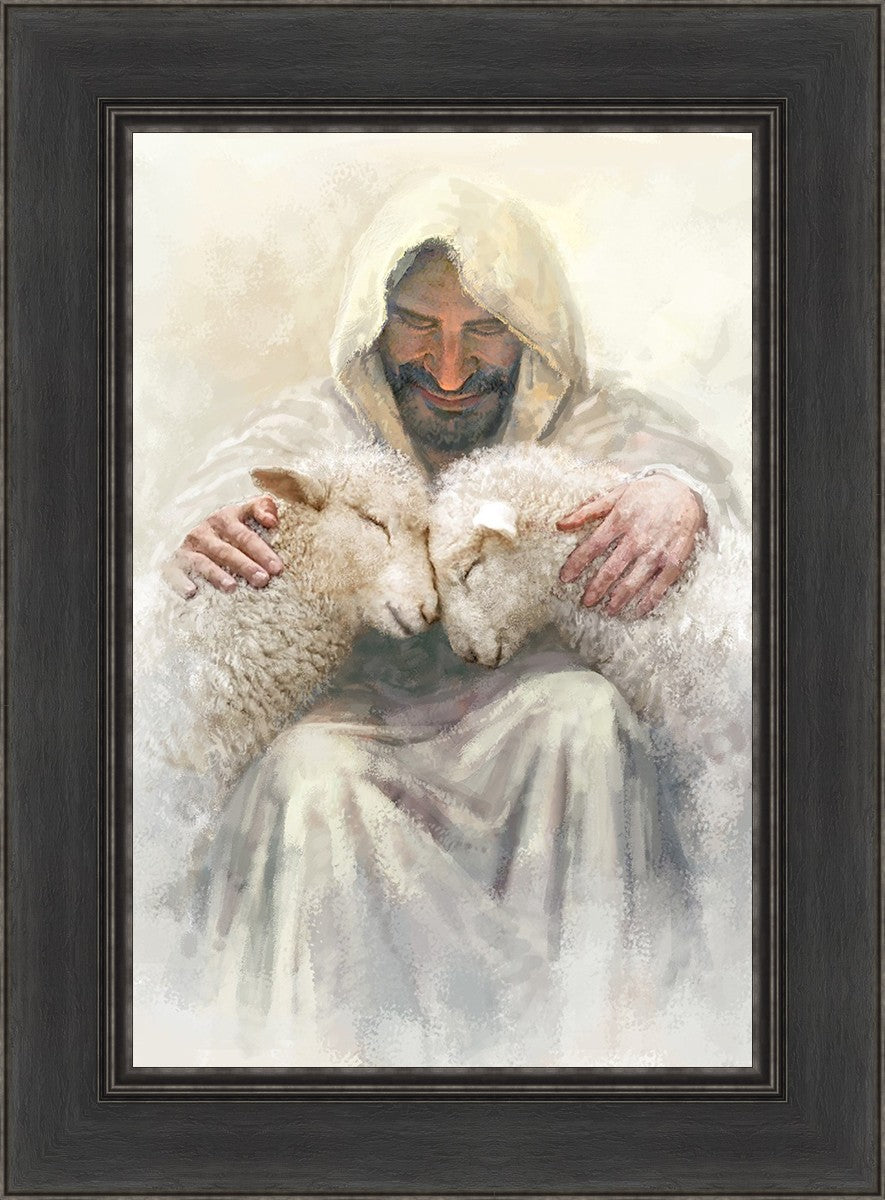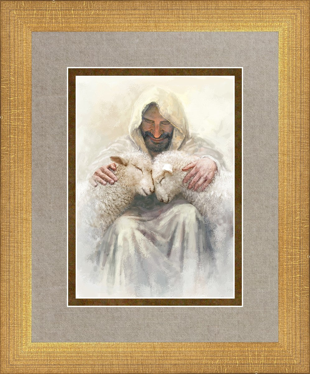 Painting of Love by Yongsung Kim depicting Christ holding two sheep.