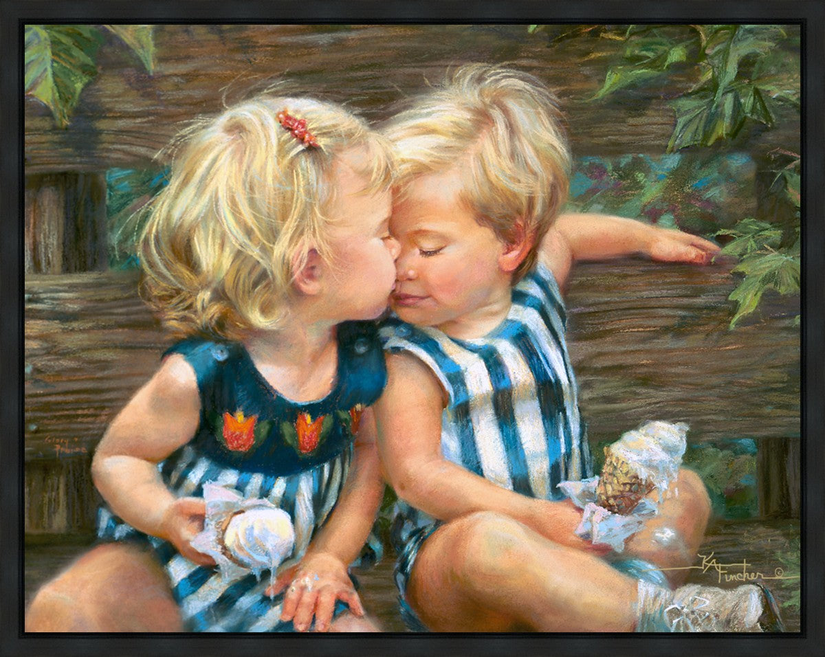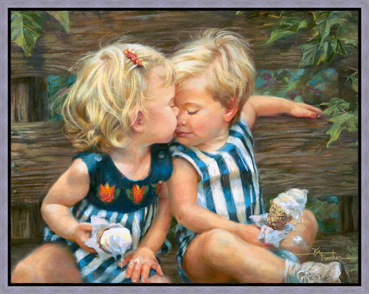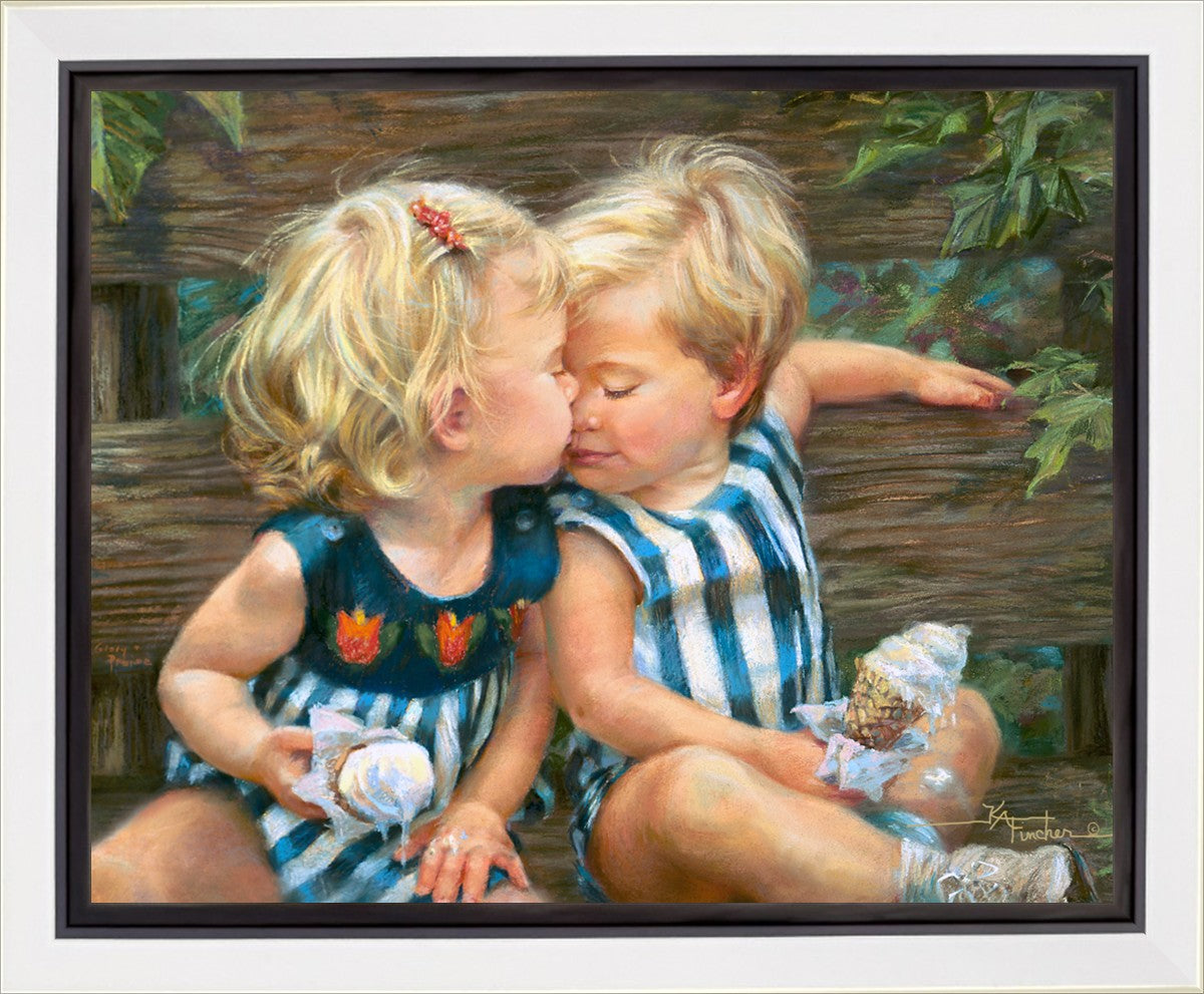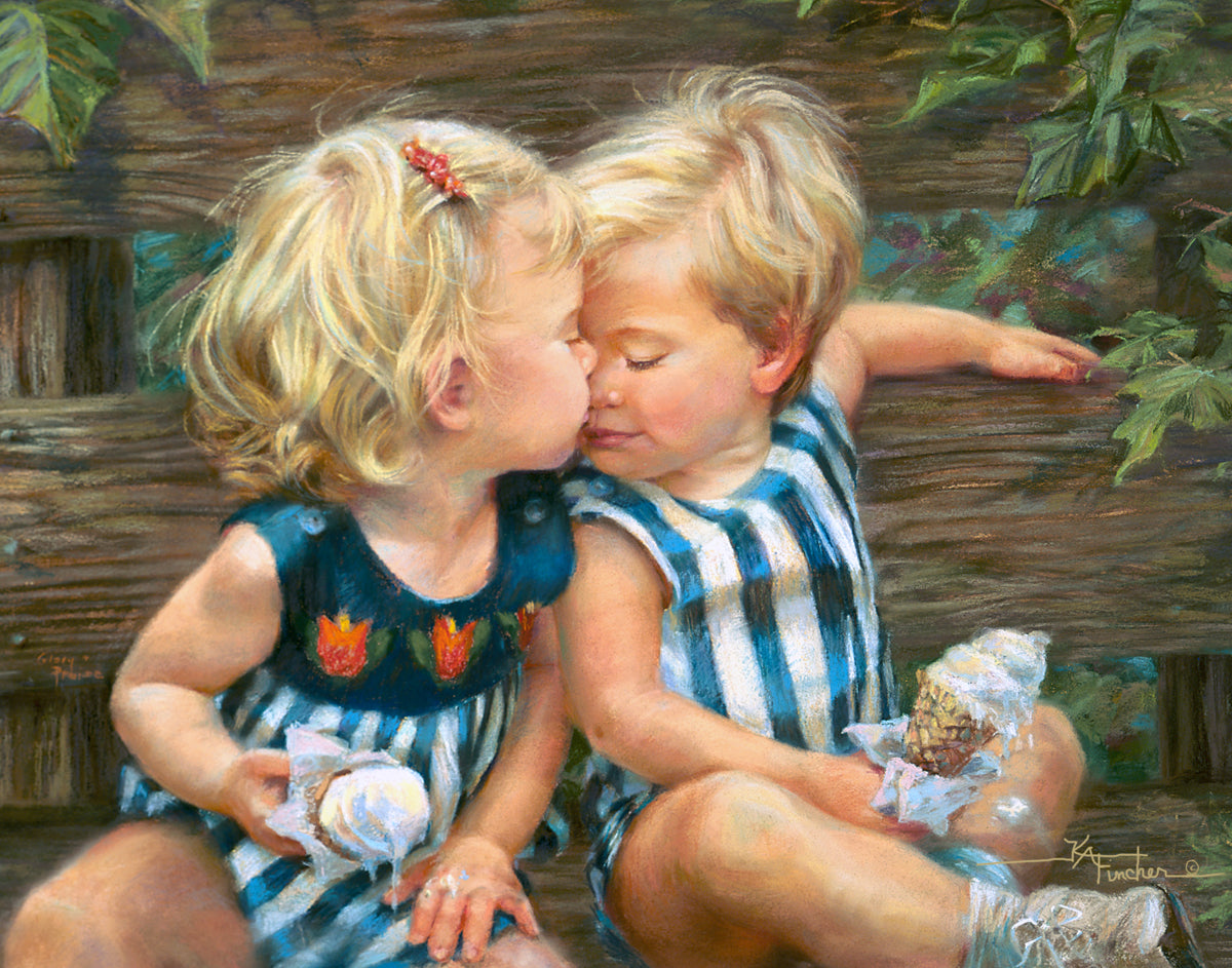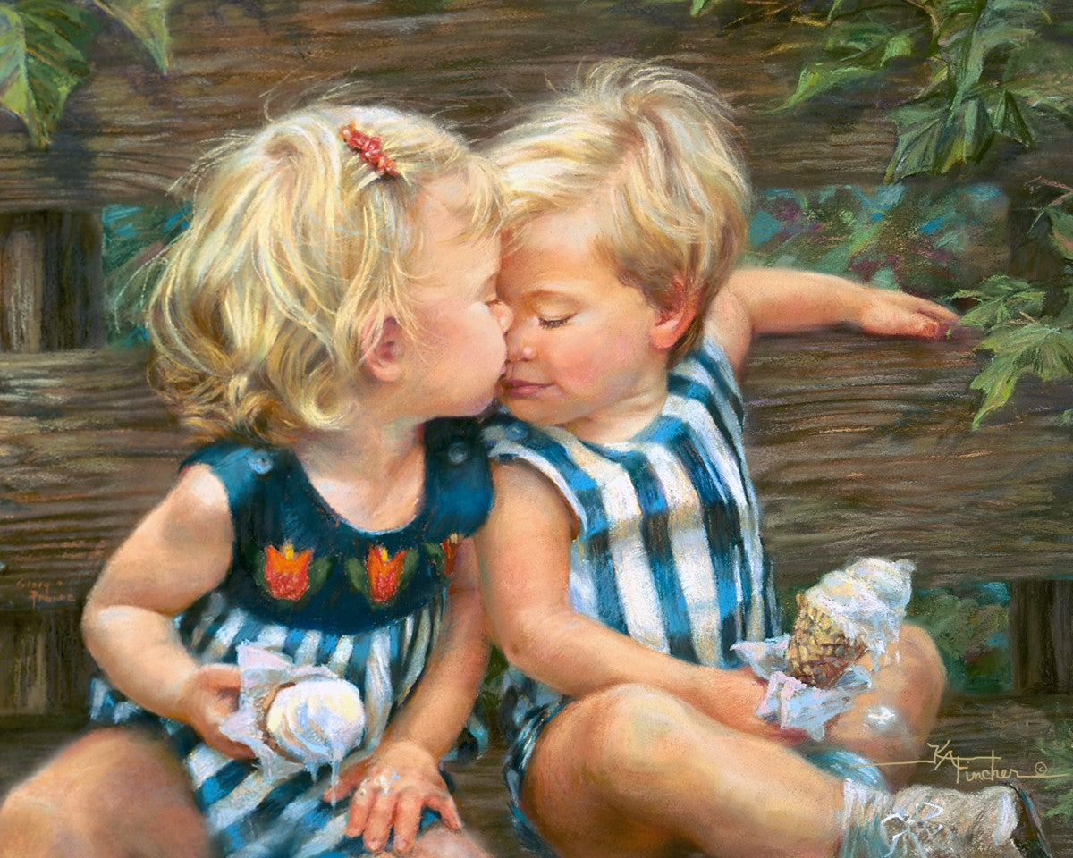 The photo I used for the painting was a snapshot offered to me from a friend. Her daughter Ashley and friend Bennett were sharing their first kiss as three-year-olds. Their parents had met in a Lamaze class, and the two were born ten days apart. As their friendship continues through triumphs and tragedies of career moves and relocations to other cities, every reunion seems like a time warp in which the past melts away like their ice cream cones.