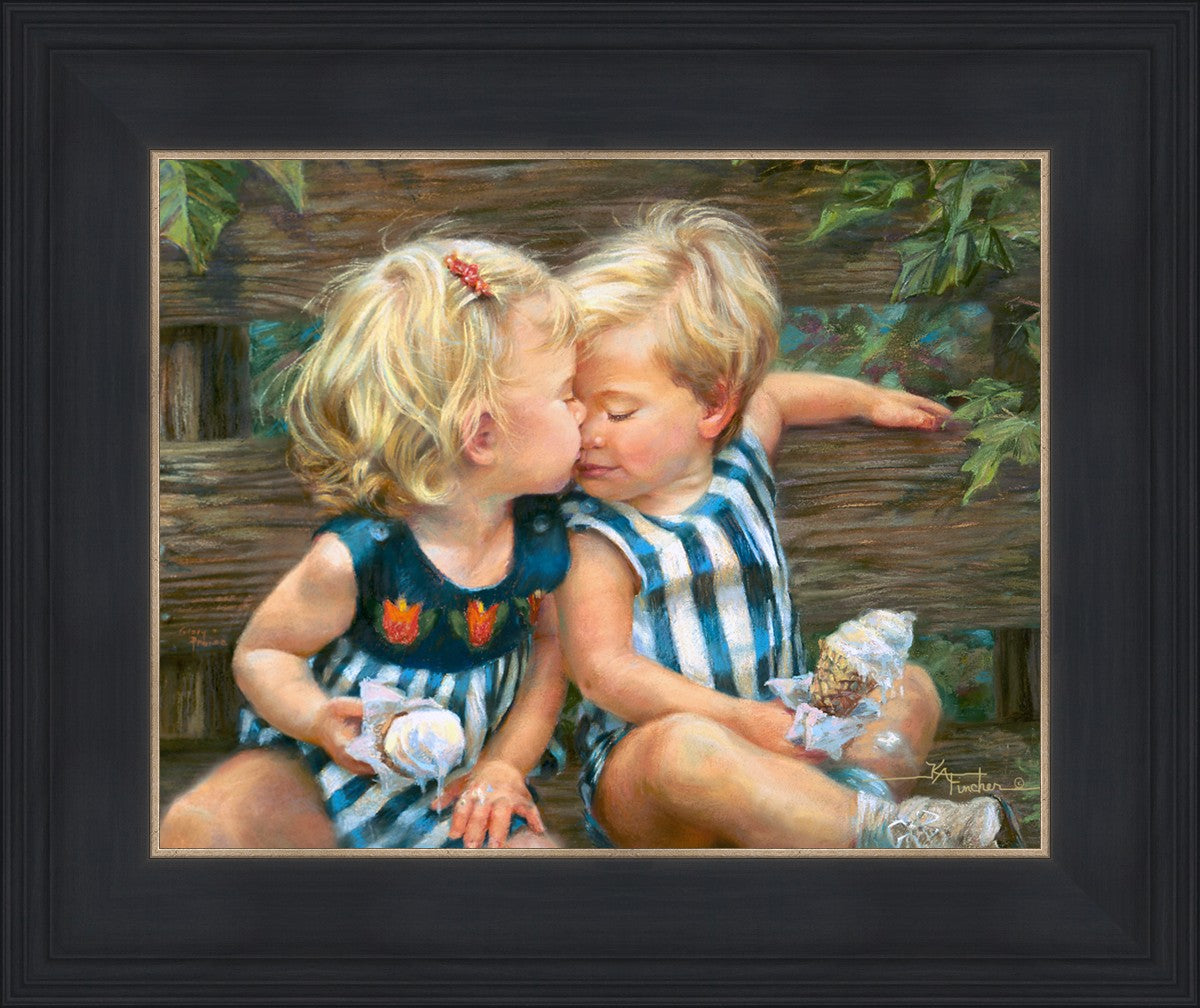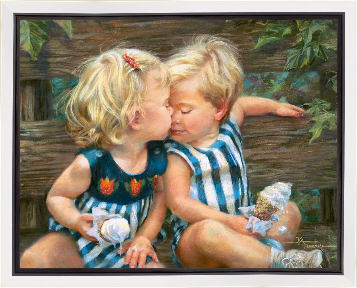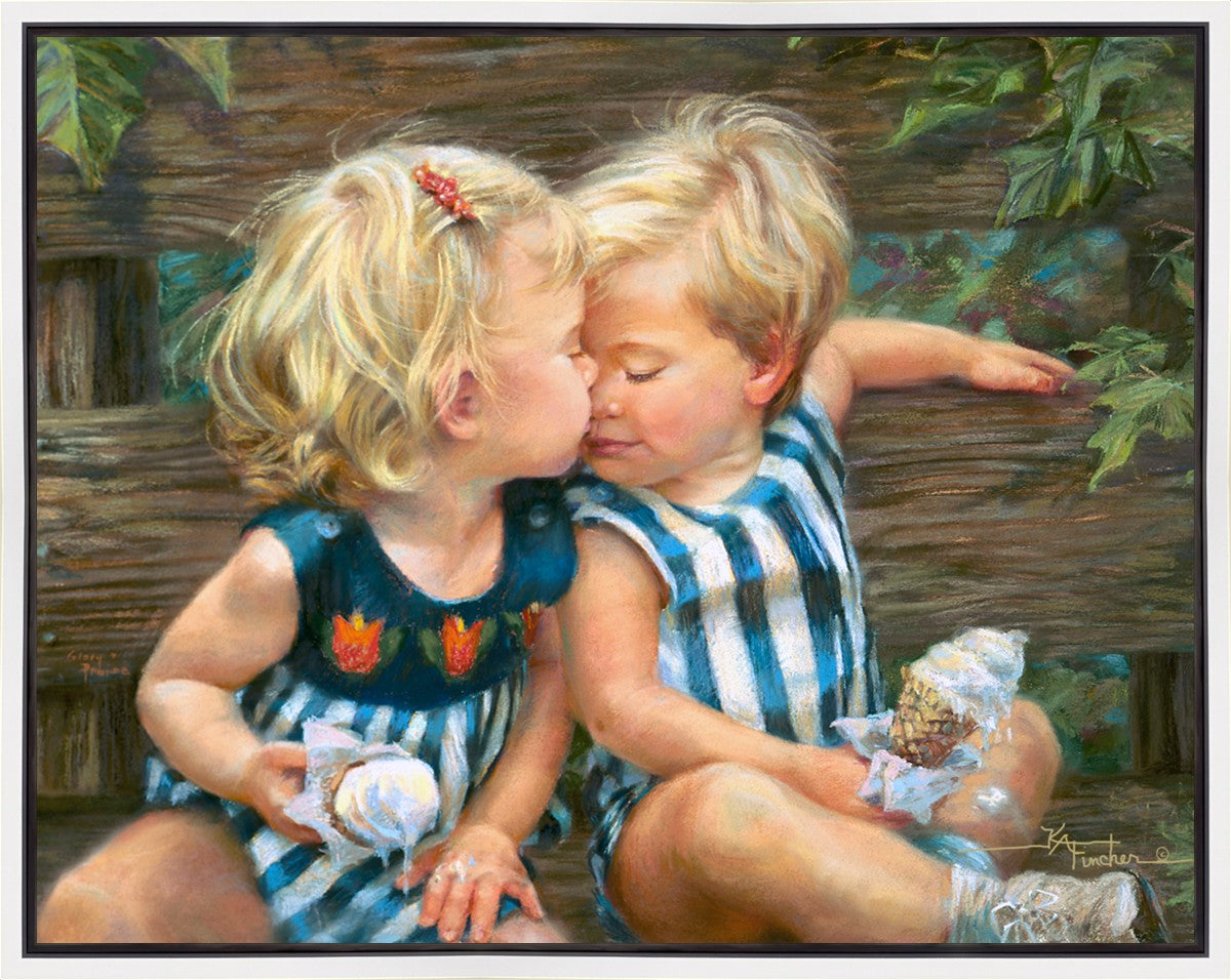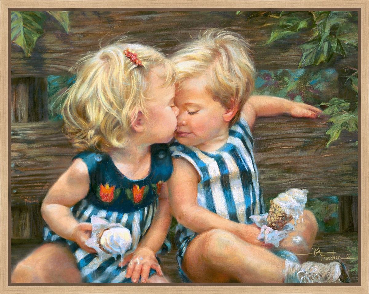 The photo I used for the painting was a snapshot offered to me from a friend. Her daughter Ashley and friend Bennett were sharing their first kiss as three-year-olds. Their parents had met in a Lamaze class, and the two were born ten days apart. As their friendship continues through triumphs and tragedies of career moves and relocations to other cities, every reunion seems like a time warp in which the past melts away like their ice cream cones.