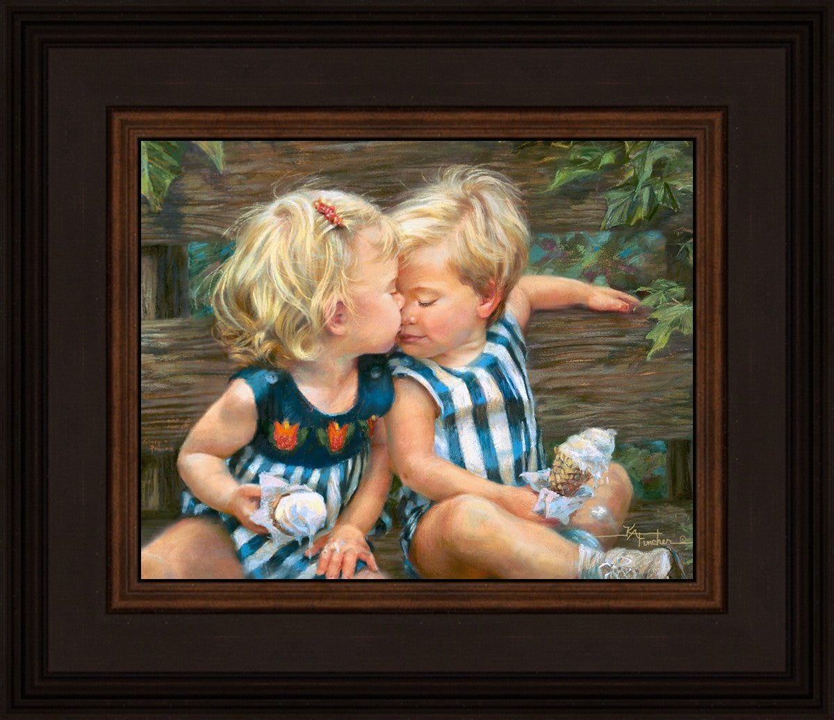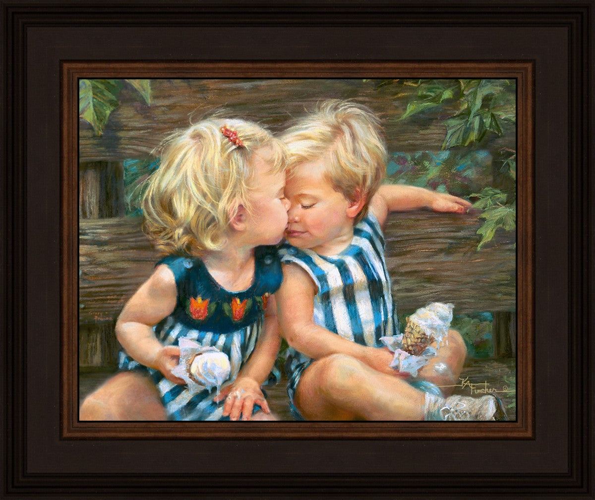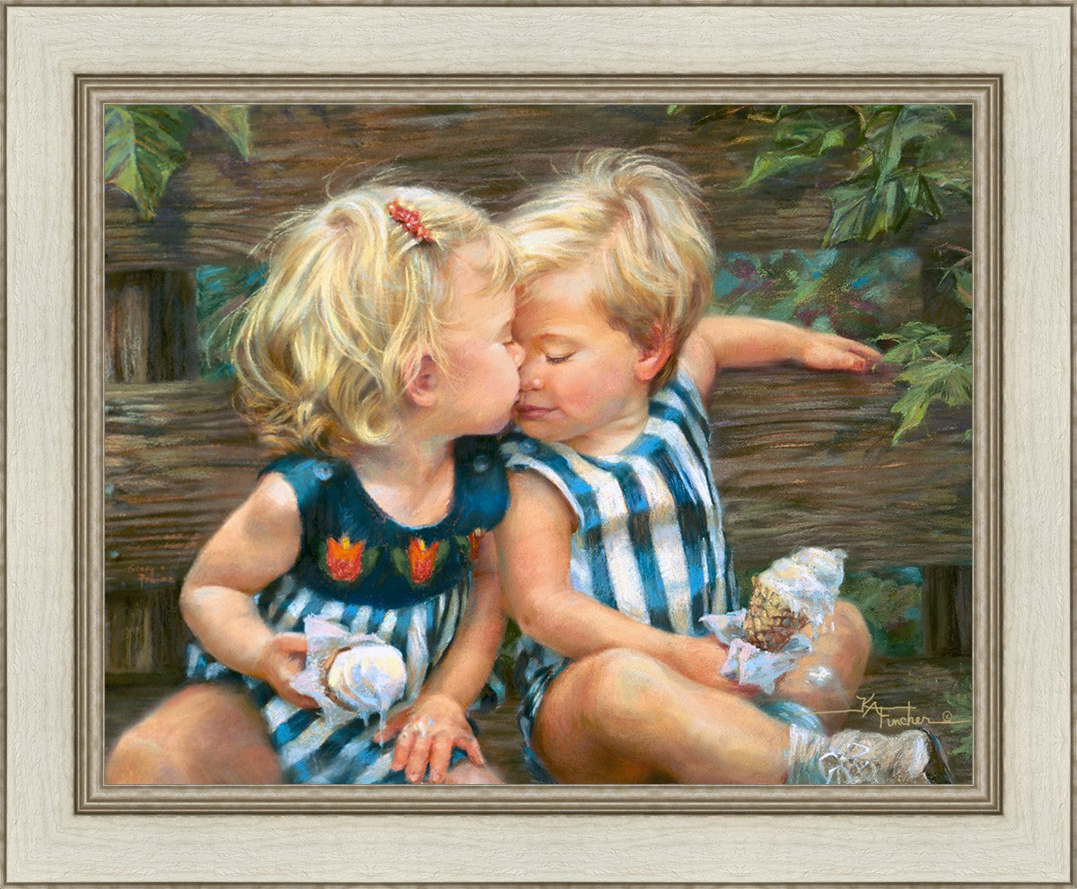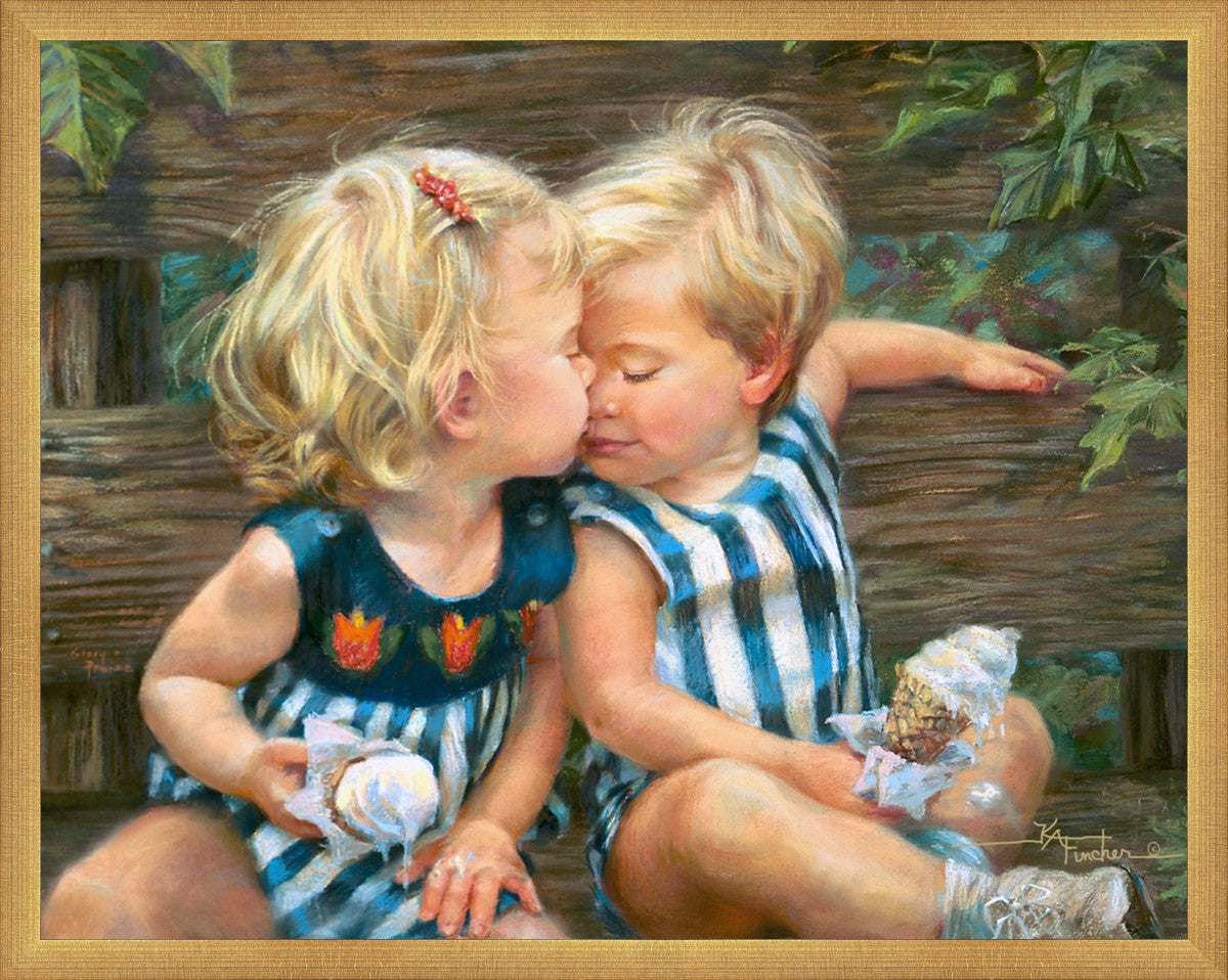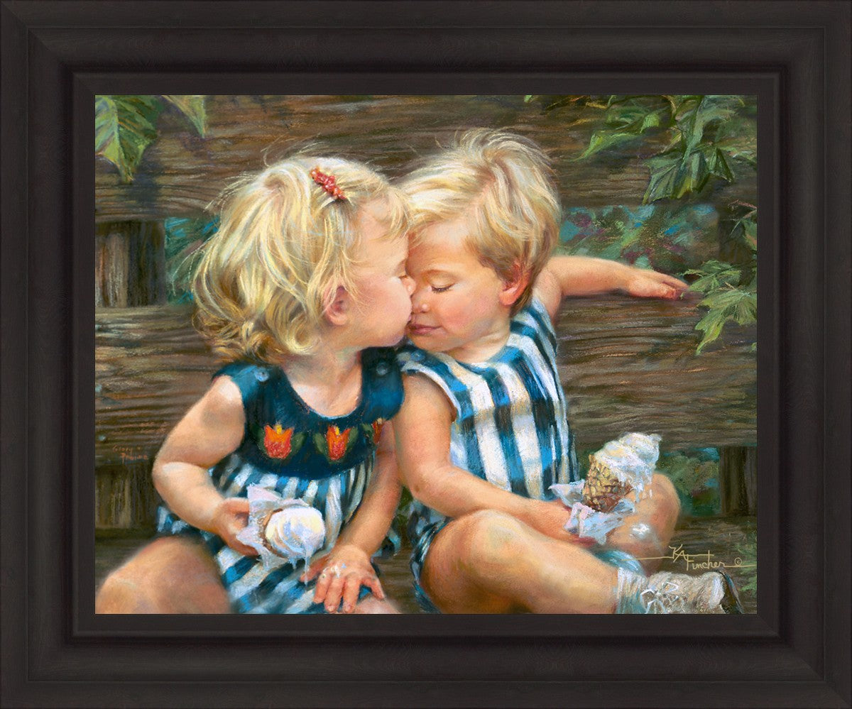 The photo I used for the painting was a snapshot offered to me from a friend. Her daughter Ashley and friend Bennett were sharing their first kiss as three-year-olds. Their parents had met in a Lamaze class, and the two were born ten days apart. As their friendship continues through triumphs and tragedies of career moves and relocations to other cities, every reunion seems like a time warp in which the past melts away like their ice cream cones.