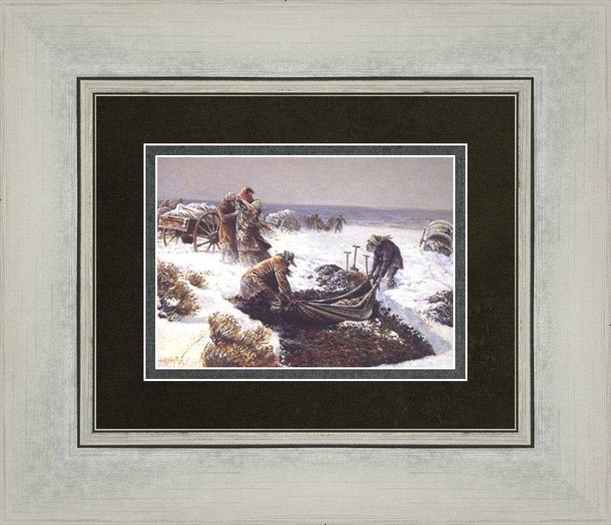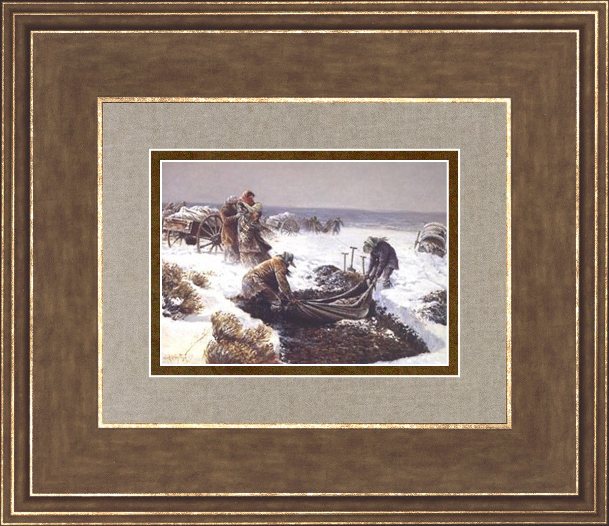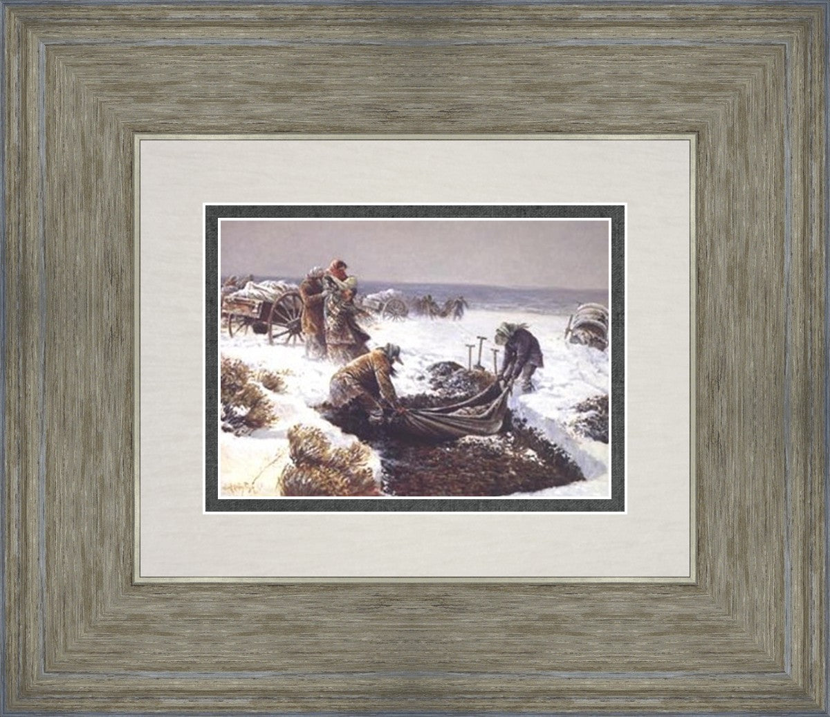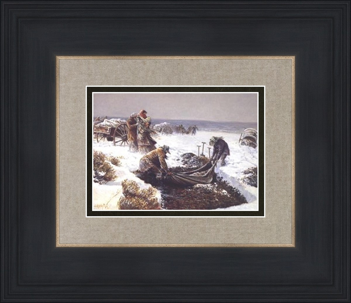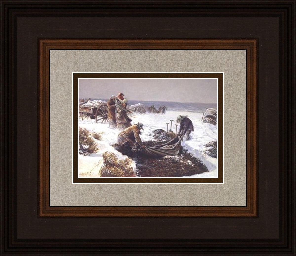 In the painting, I have pictured my relatives who were in the Martin Company. The woman holding the infant is my great great grandmother, Elizabeth Steele, from Scotland. The baby is James E. Steele, about one year old at that time. Her husband being buried is James Steele. They were converts and had just lately arrived in America in great expectation of a grand future in Zion. James had literally starved to death giving all his food to his children and wife. He died on the windswept plains, hundreds of miles from Zion, but it was in his heart and as the Savior said,