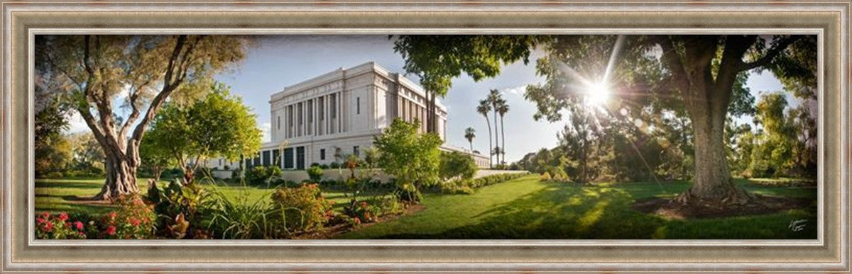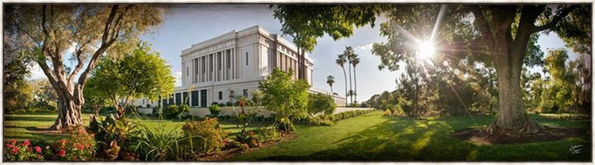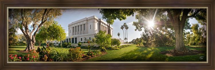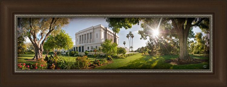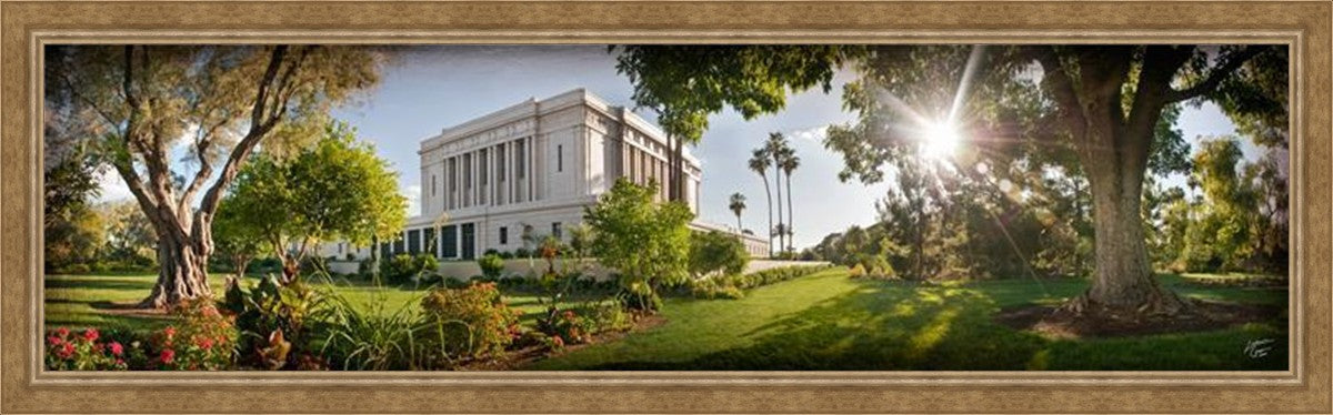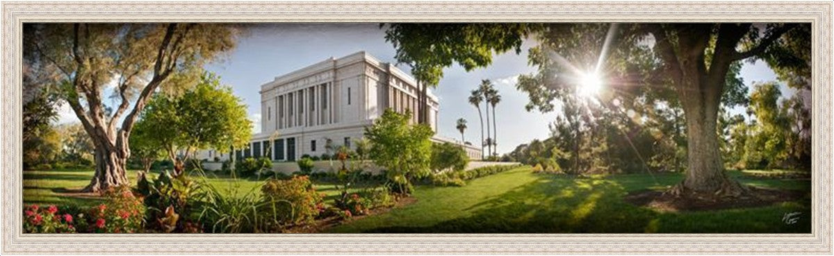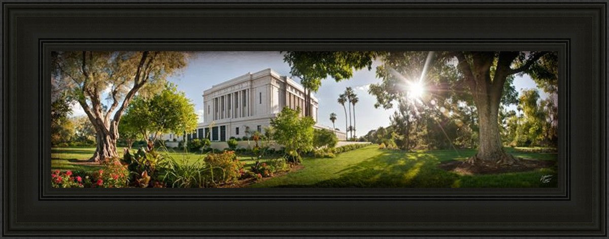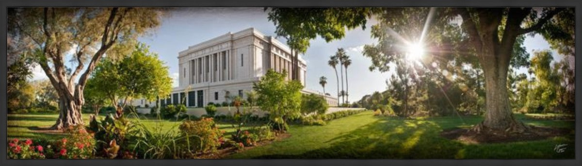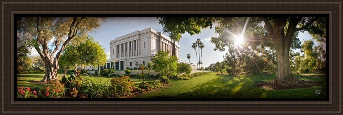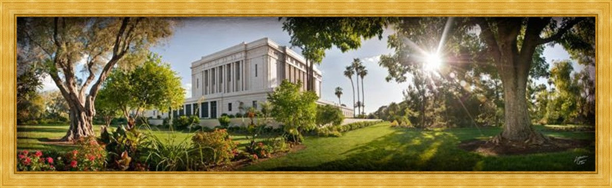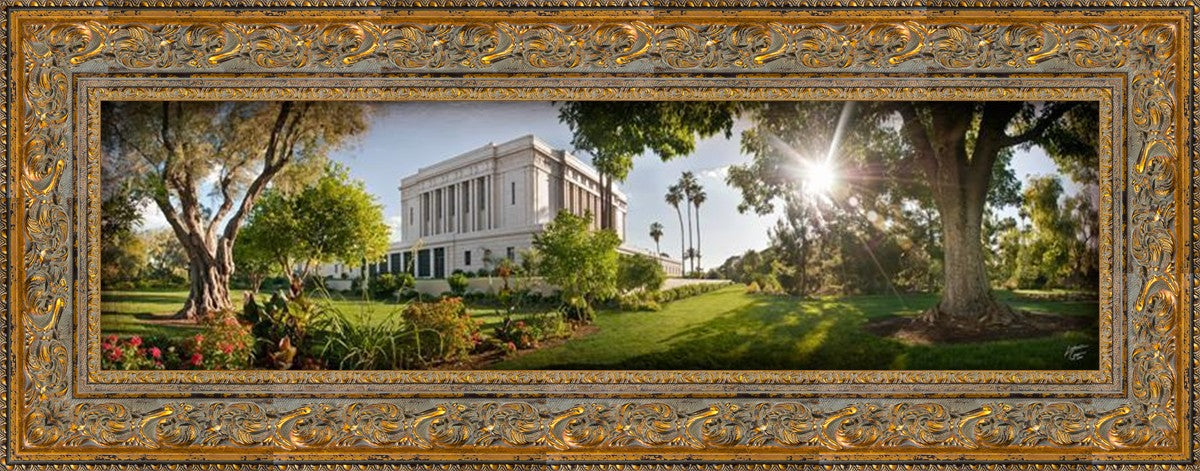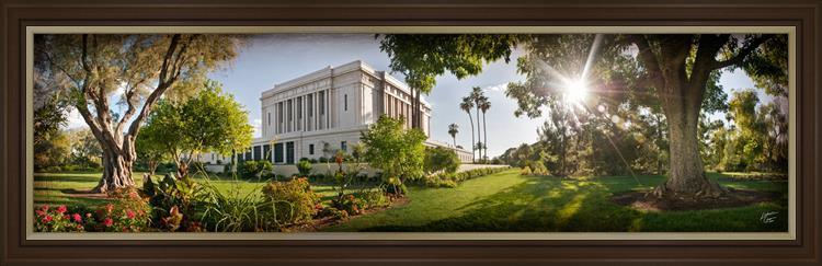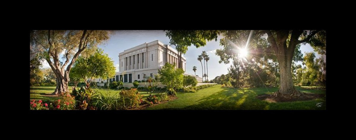 Since 1999 Landon has worked as an artisan in nearly 40 temples doing the decorative paint and gold leaf. He continues to do so as well as wood repair and graining. He was married in 2001 to Jacey Thomas in the Manti Utah temple. When she couldn’t find an image of the temple that she liked enough to purchase for their home, he decided to take one himself. That desire to create something original and different inspired his current series of temple art. They are taken from a panoramic viewpoint and stylized with an artistic border that reflect his paintings. All modern structures apart from the temple have been omitted.