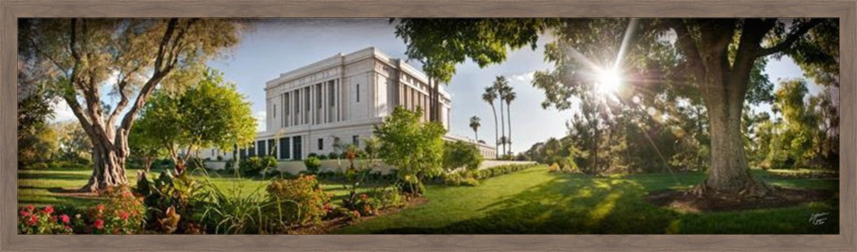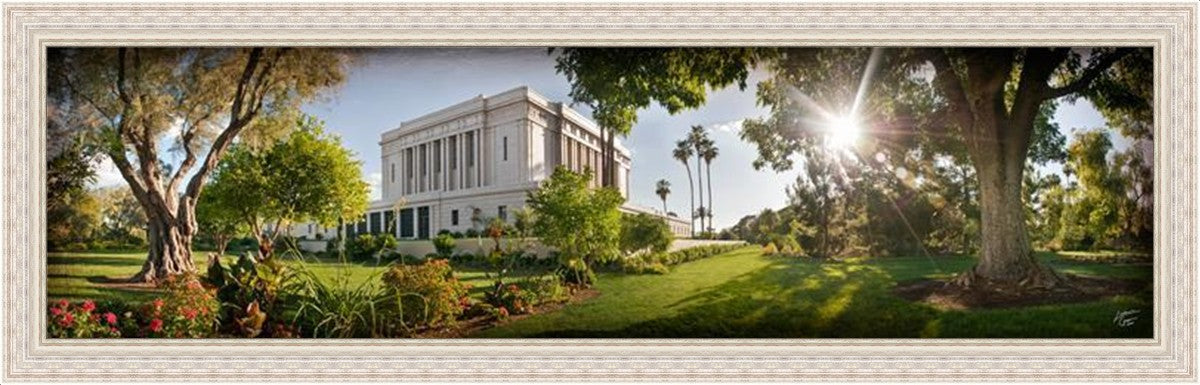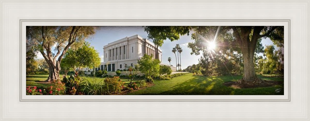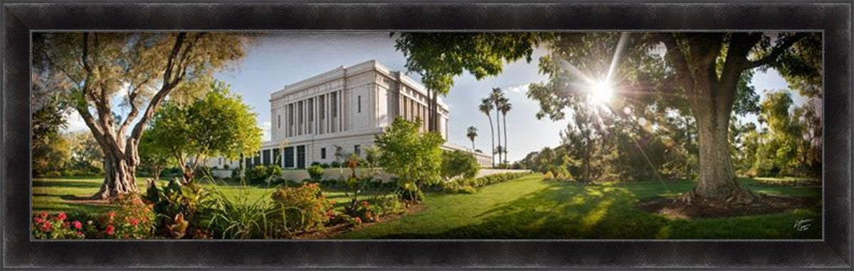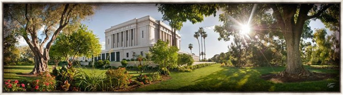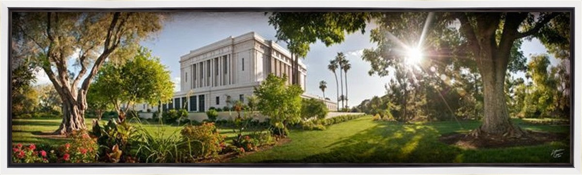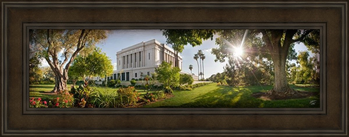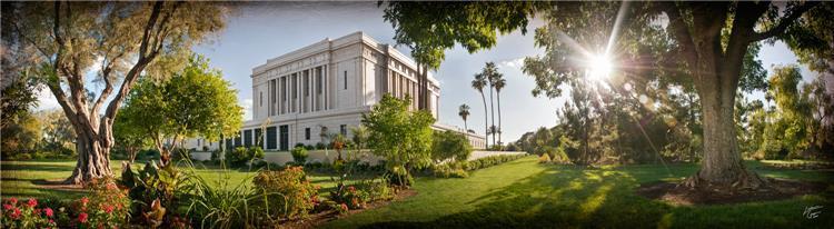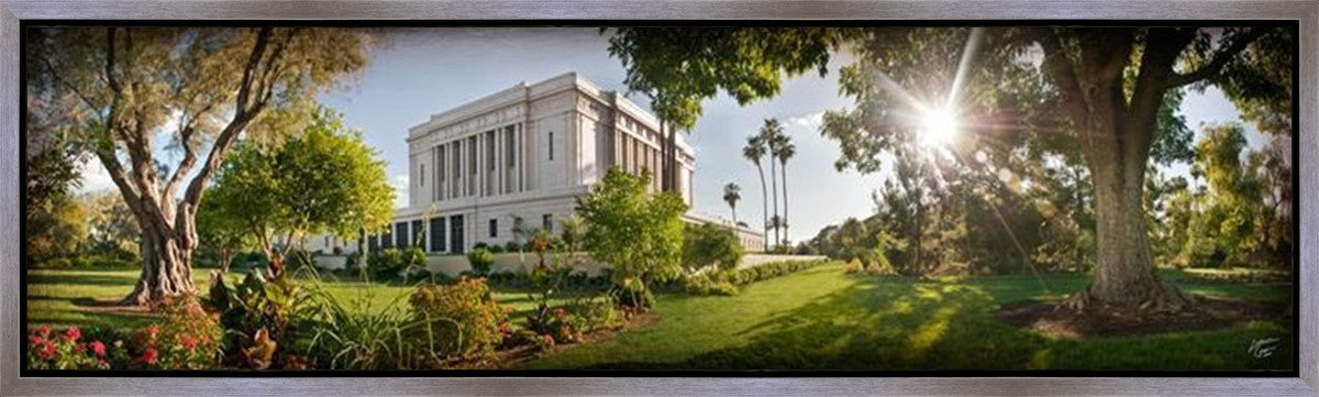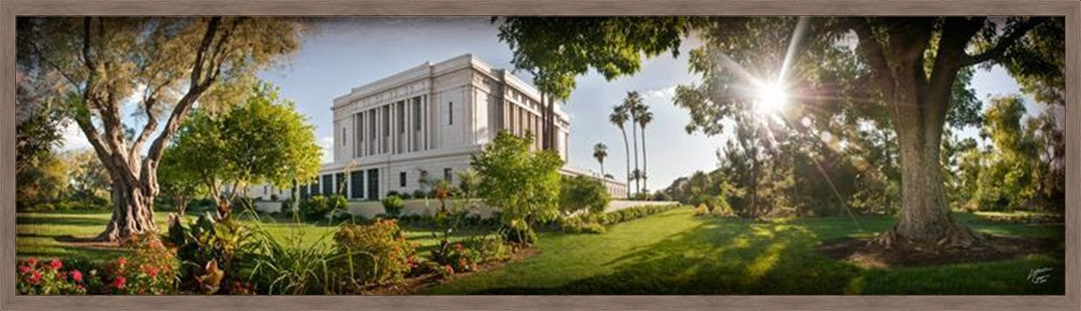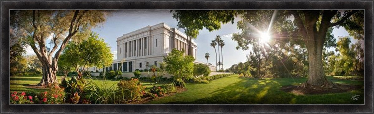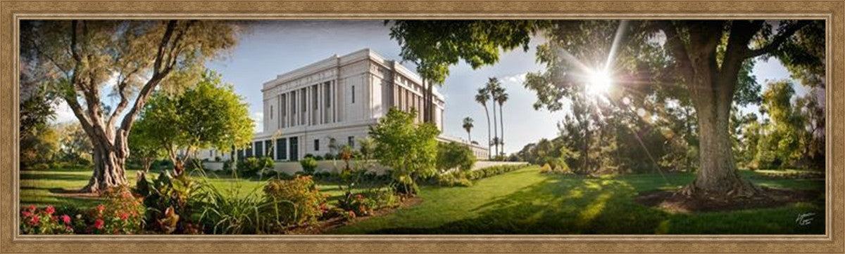 Since 1999 Landon has worked as an artisan in nearly 40 temples doing the decorative paint and gold leaf. He continues to do so as well as wood repair and graining. He was married in 2001 to Jacey Thomas in the Manti Utah temple. When she couldn’t find an image of the temple that she liked enough to purchase for their home, he decided to take one himself. That desire to create something original and different inspired his current series of temple art. They are taken from a panoramic viewpoint and stylized with an artistic border that reflect his paintings. All modern structures apart from the temple have been omitted.