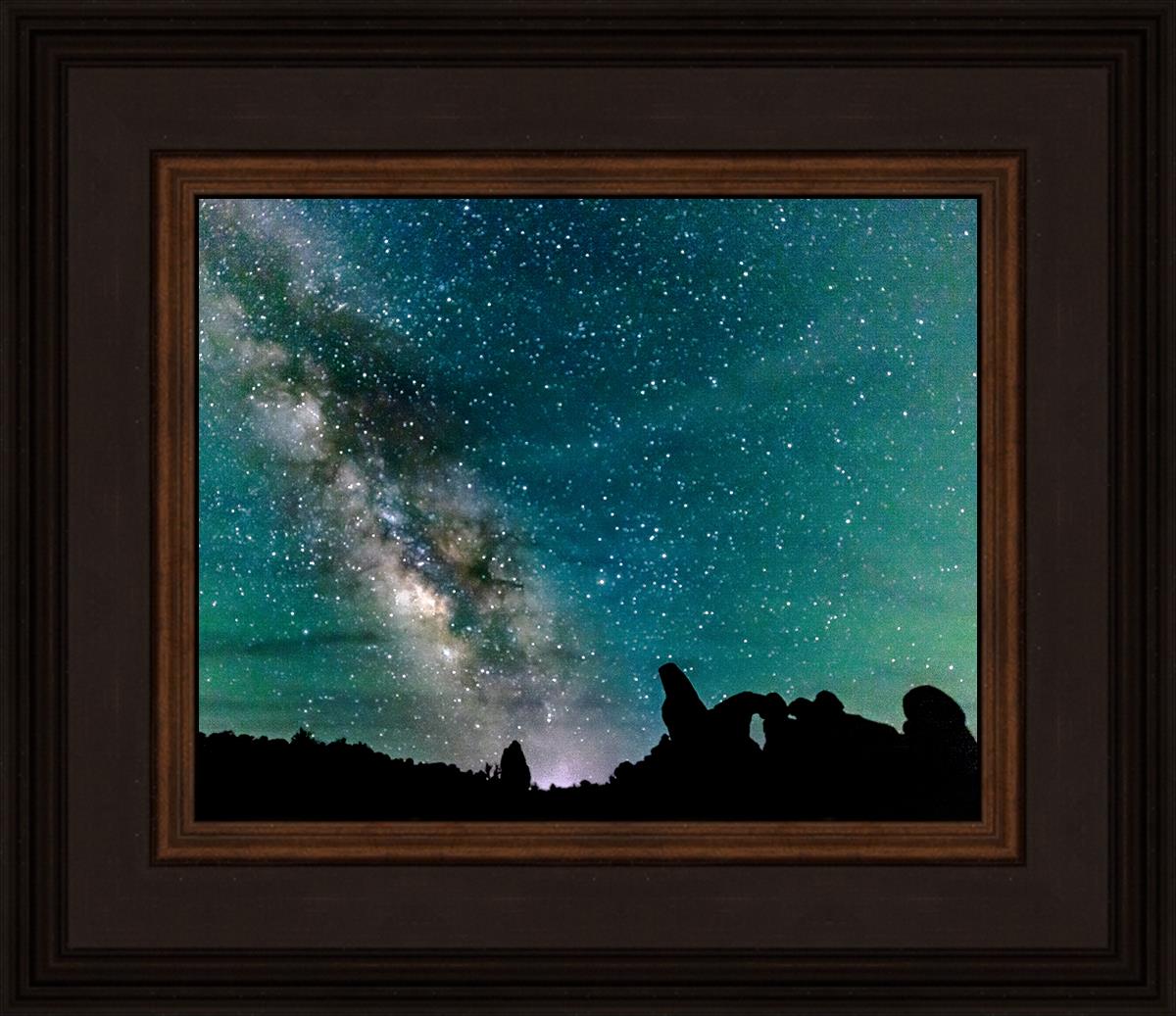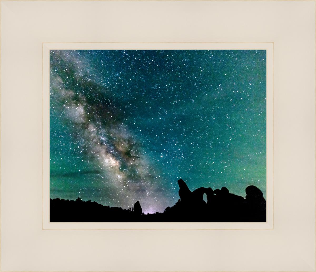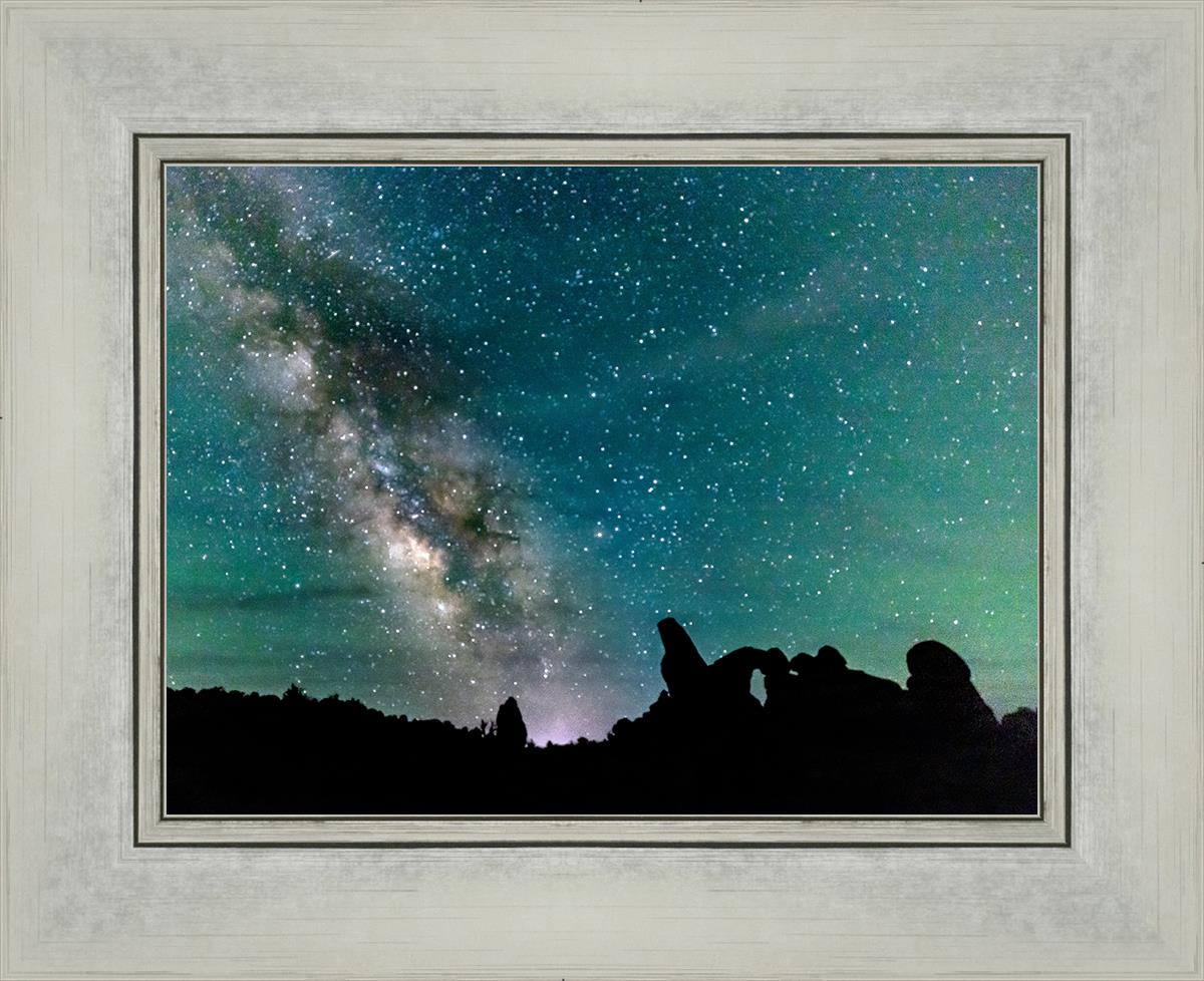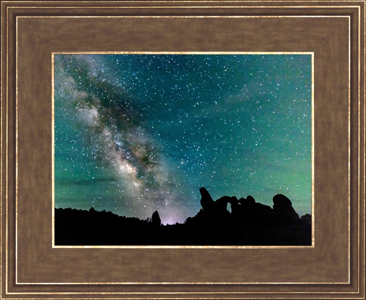 A spectacular view of the Milky Way is seen in this late cosmic spring view over a striking silhouette of The Turret geologic formation, located in Arches National Park in Utah.