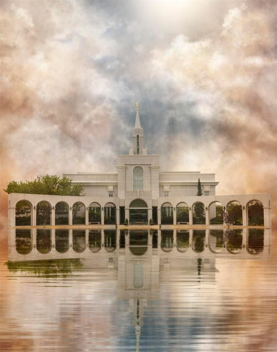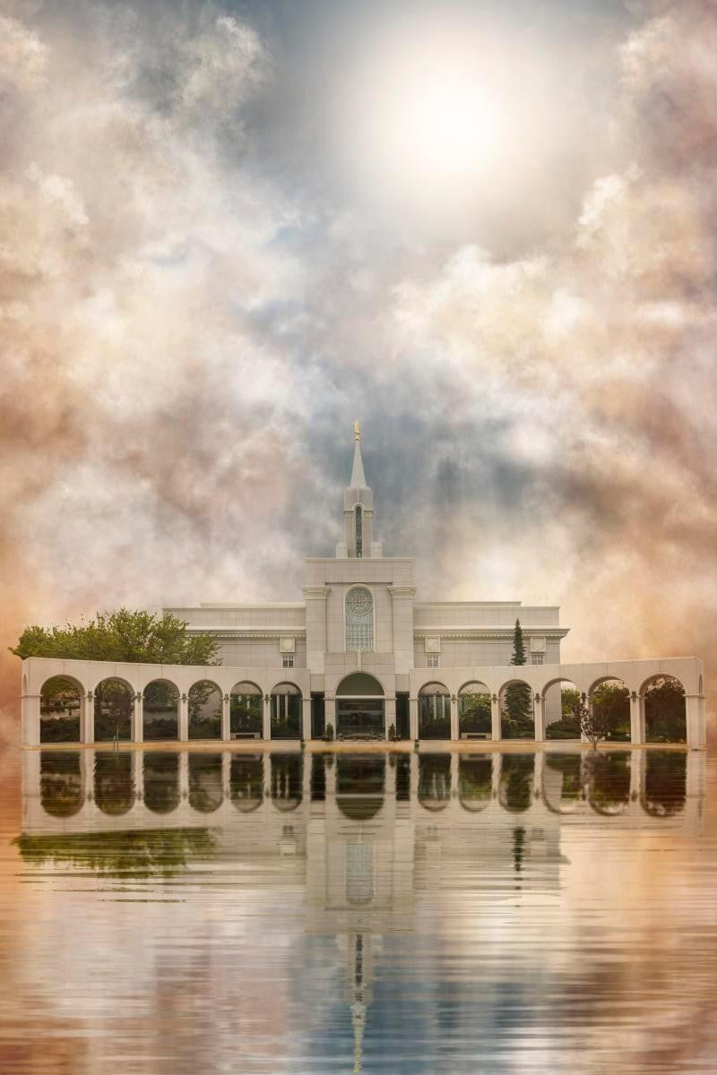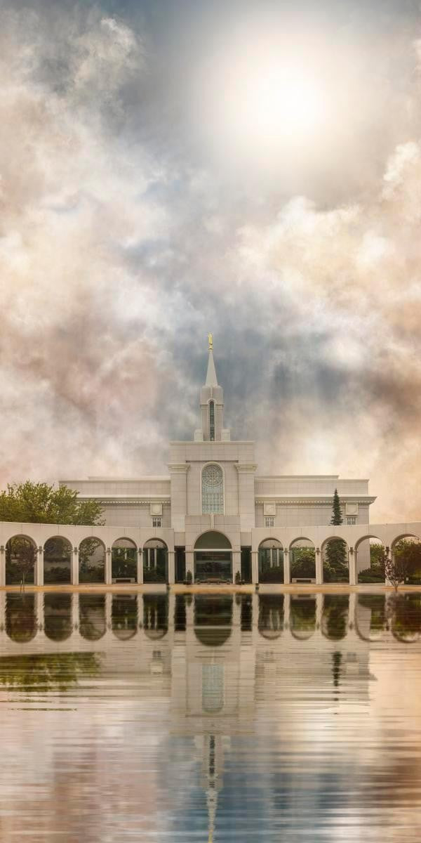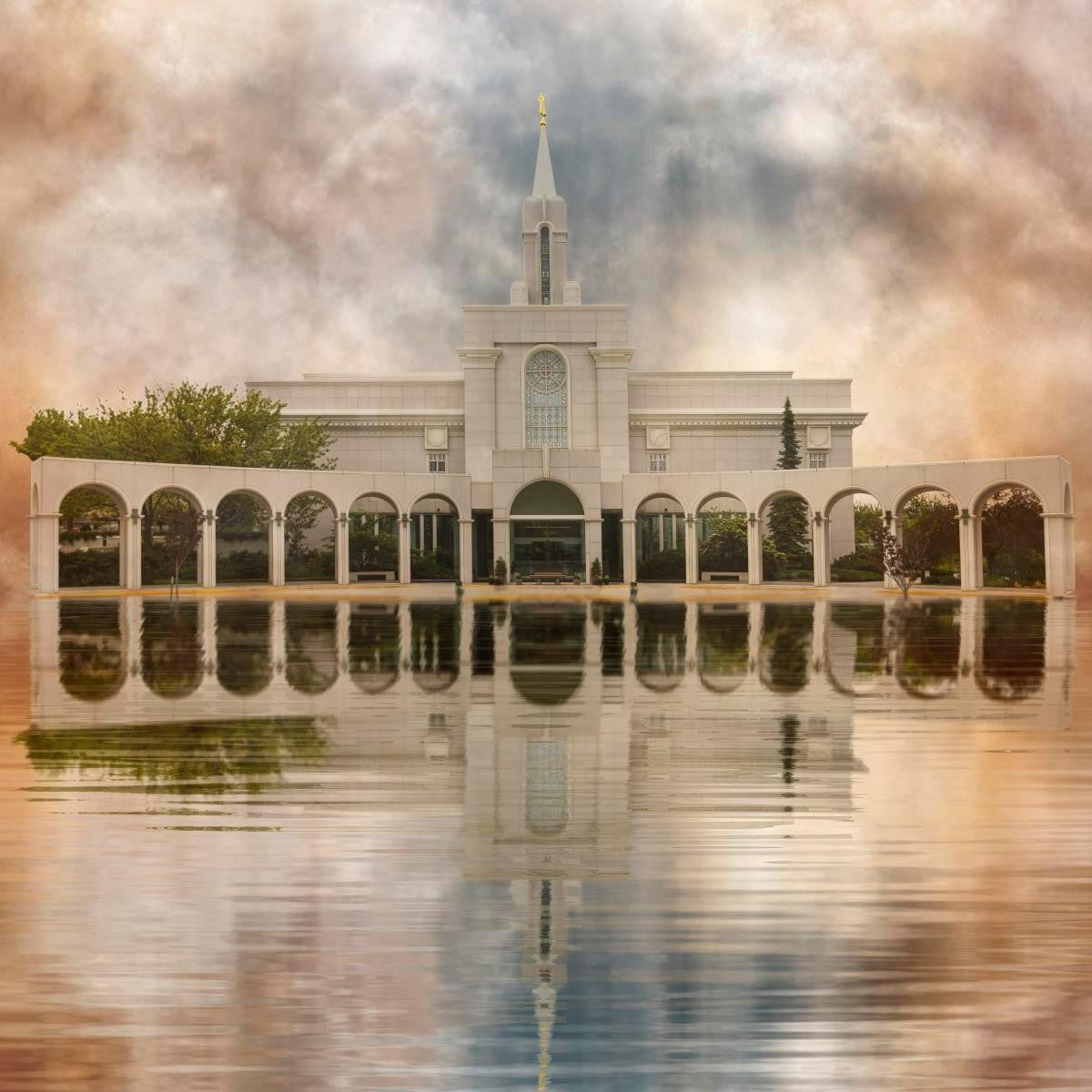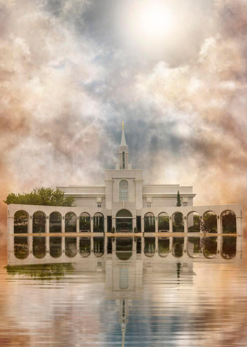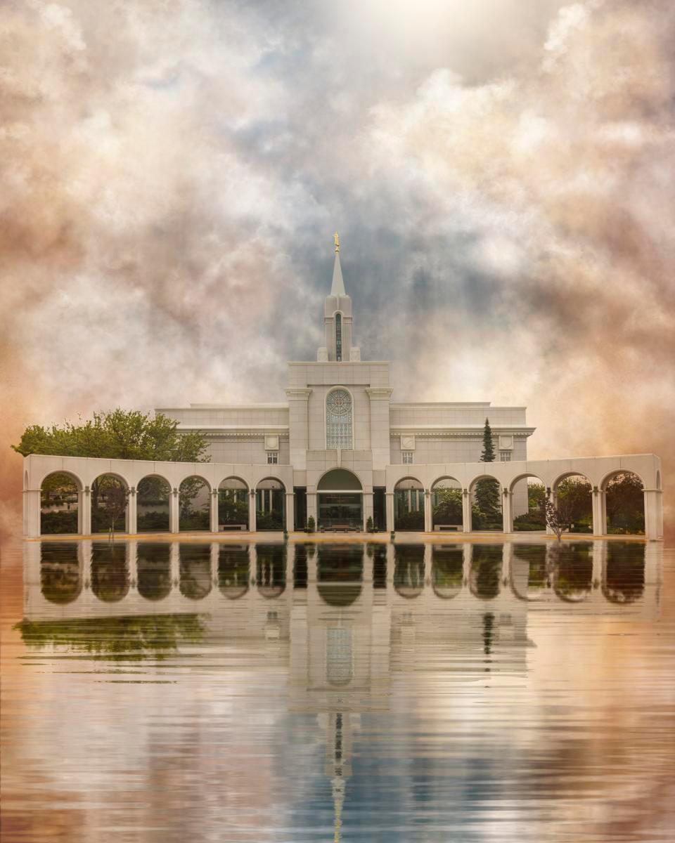Millennial reflection of the Bountiful Utah Temple with pastel clouds in the sky.