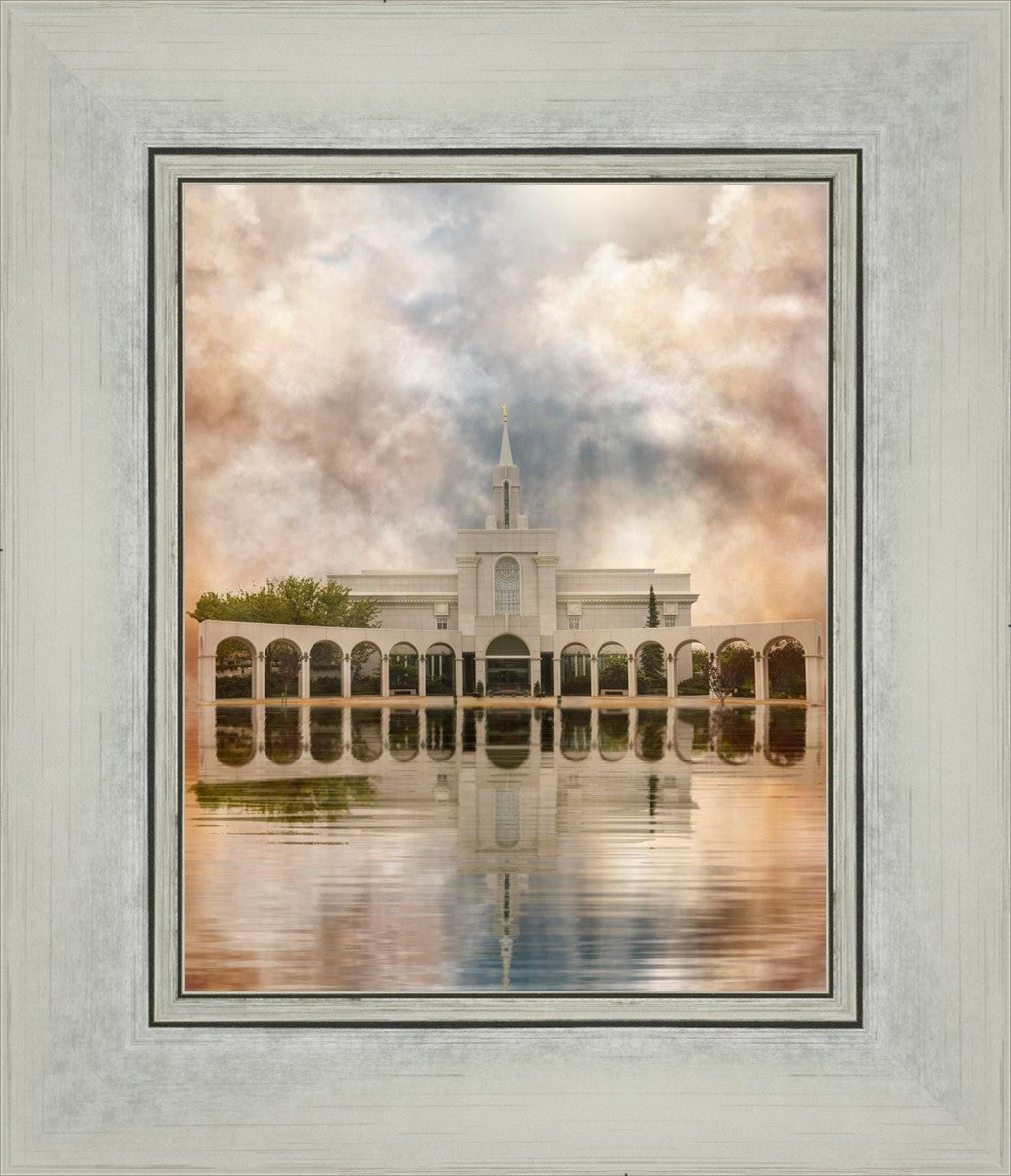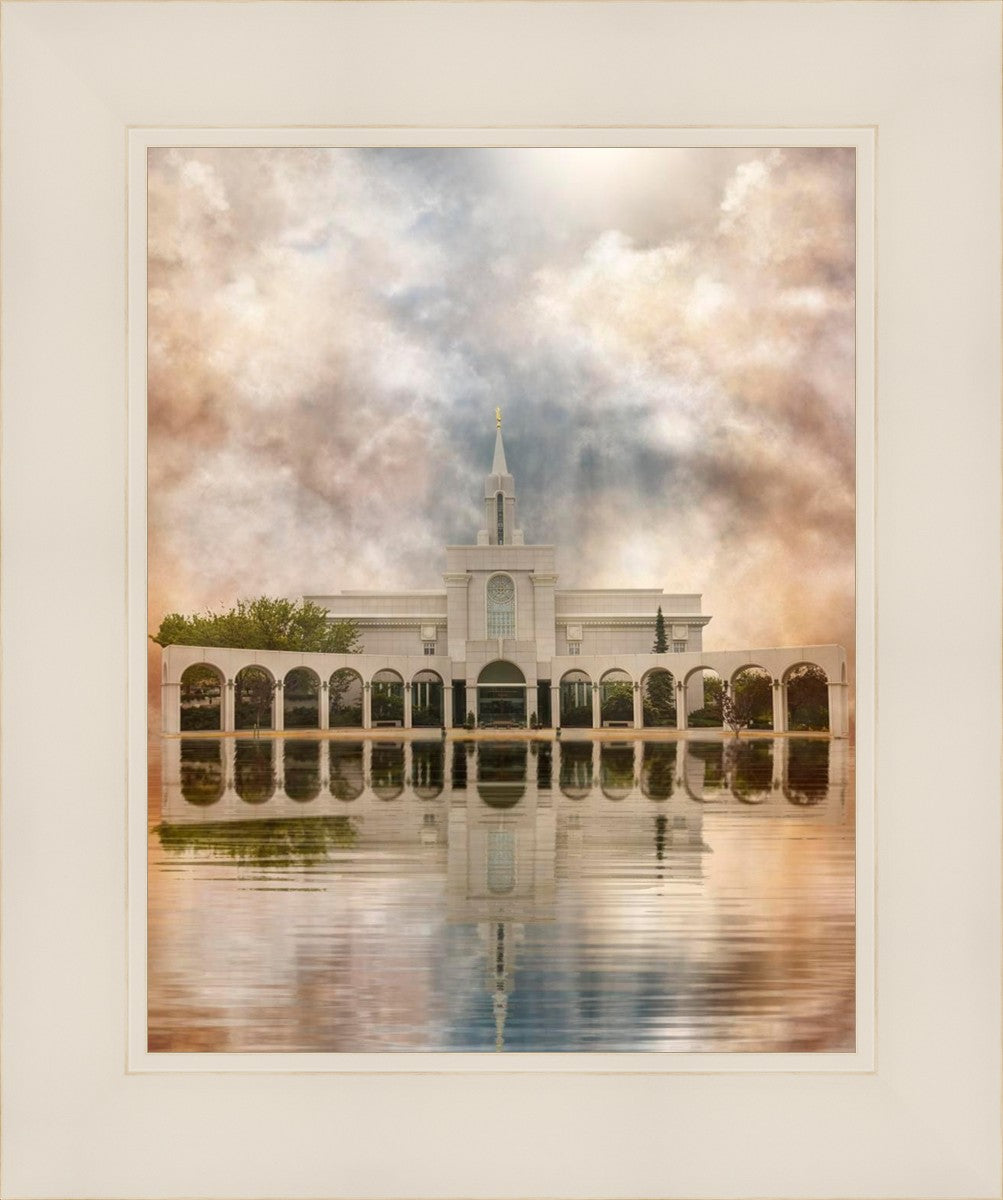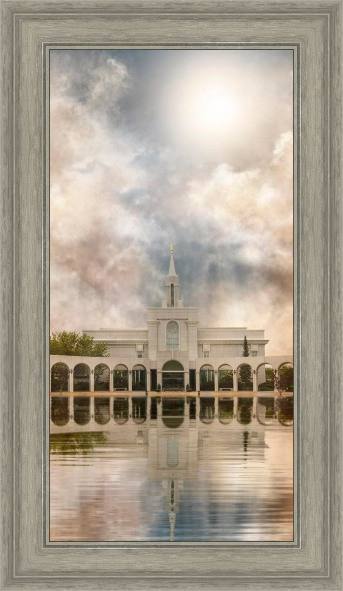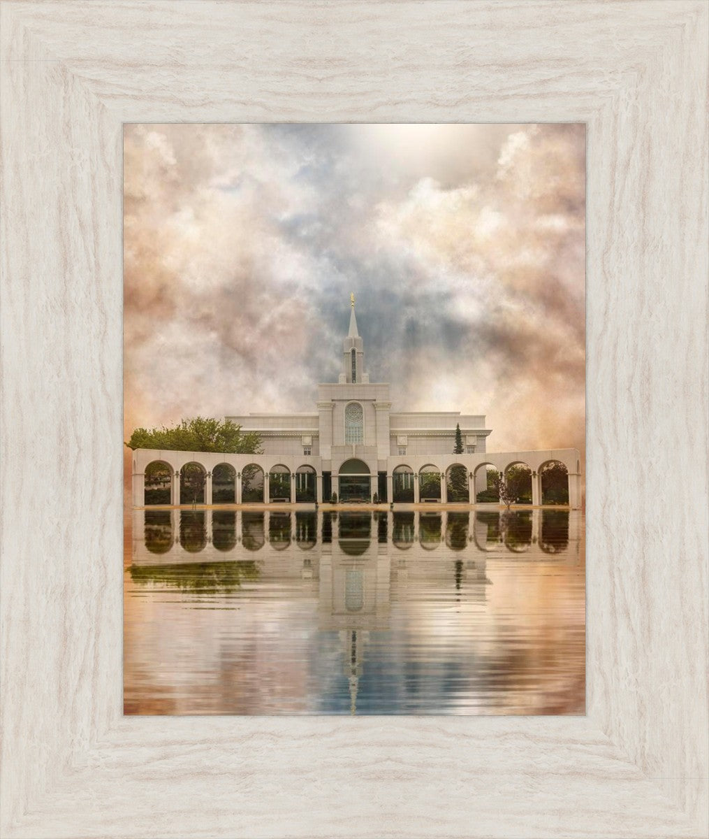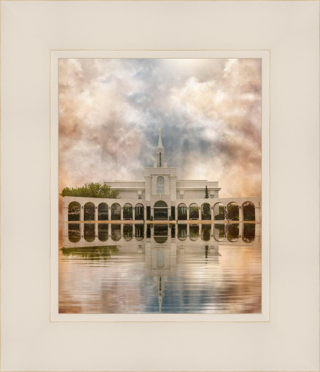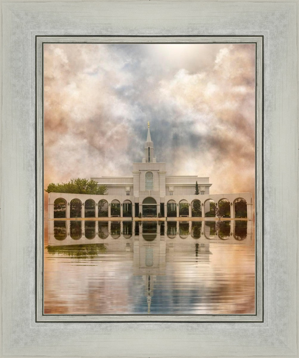Millennial reflection of the Bountiful Utah Temple with pastel clouds in the sky.