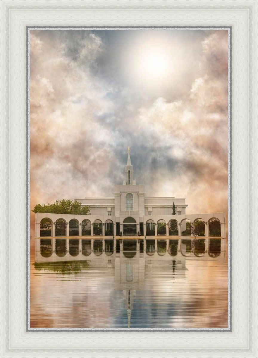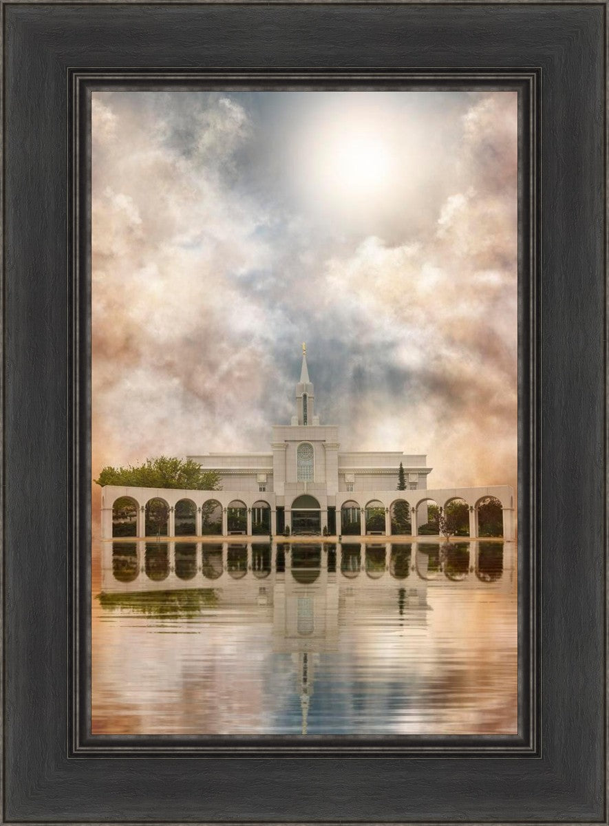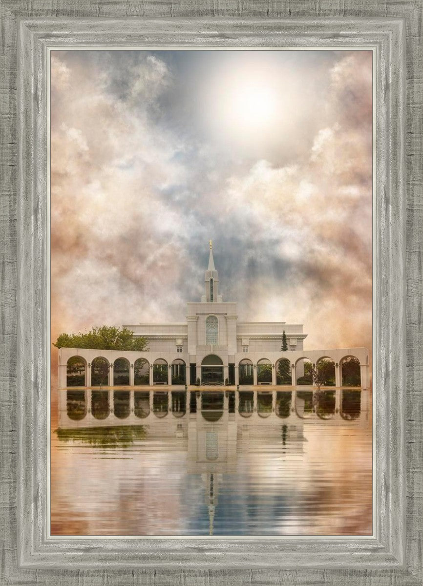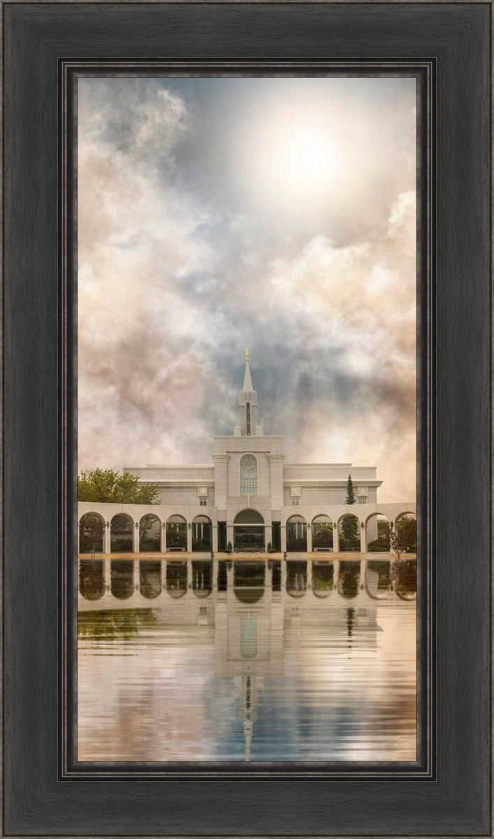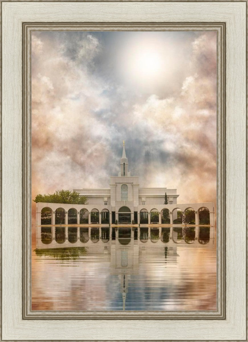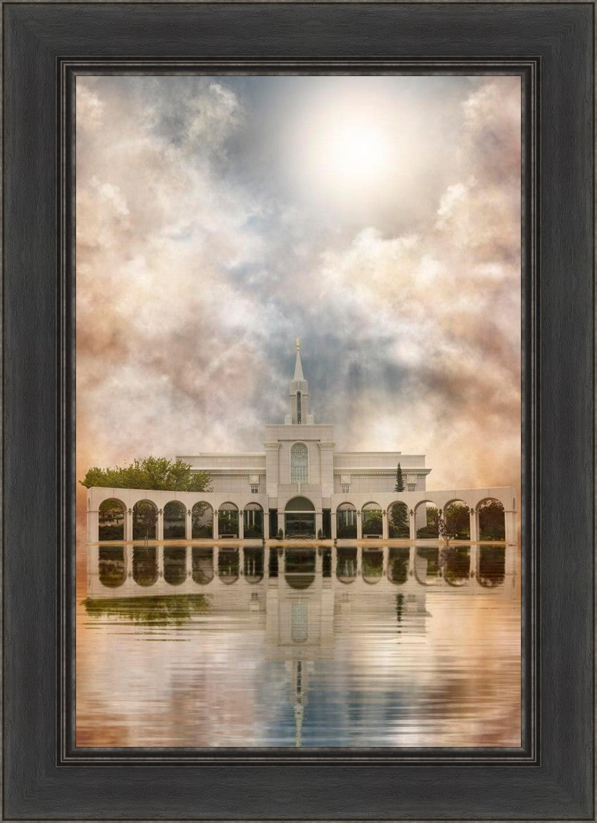 Millennial reflection of the Bountiful Utah Temple with pastel clouds in the sky.