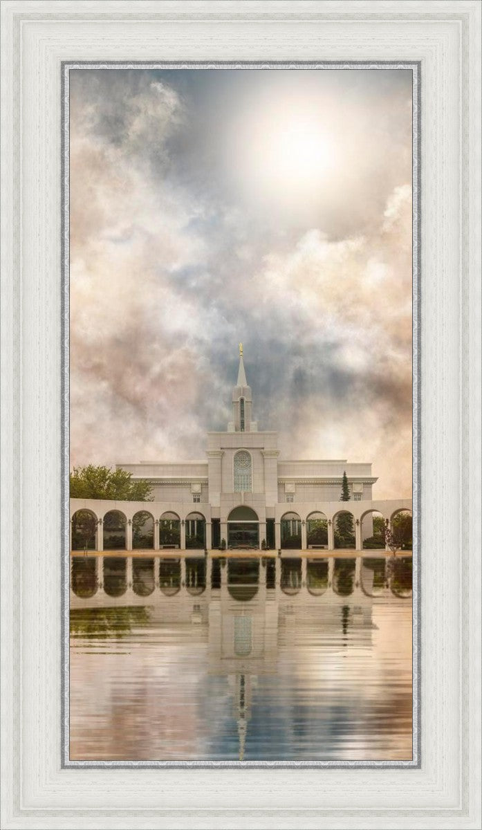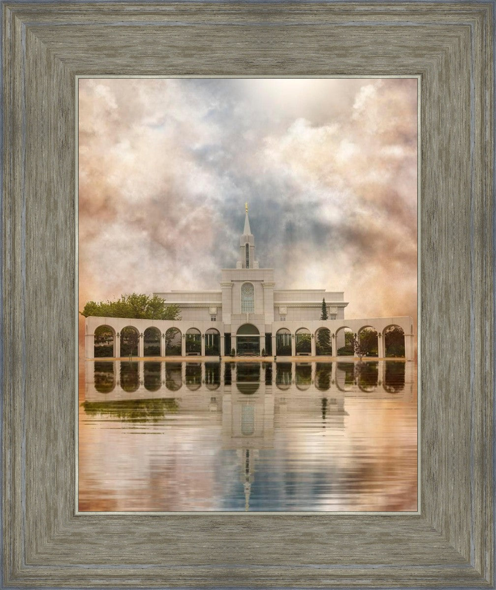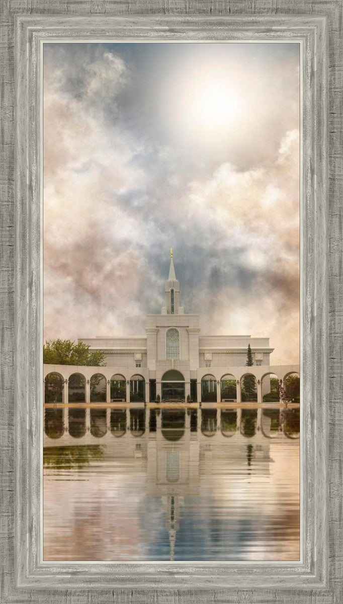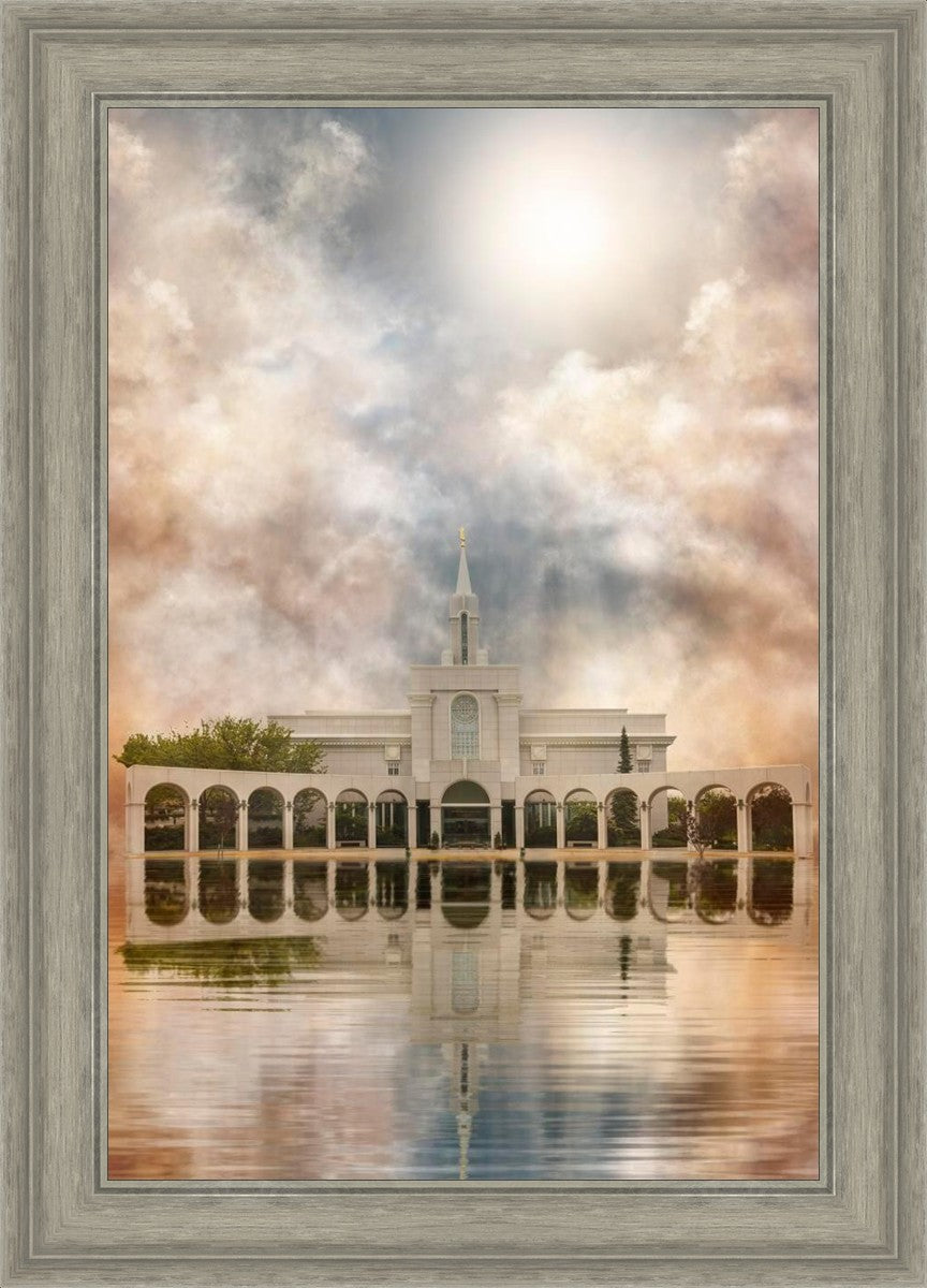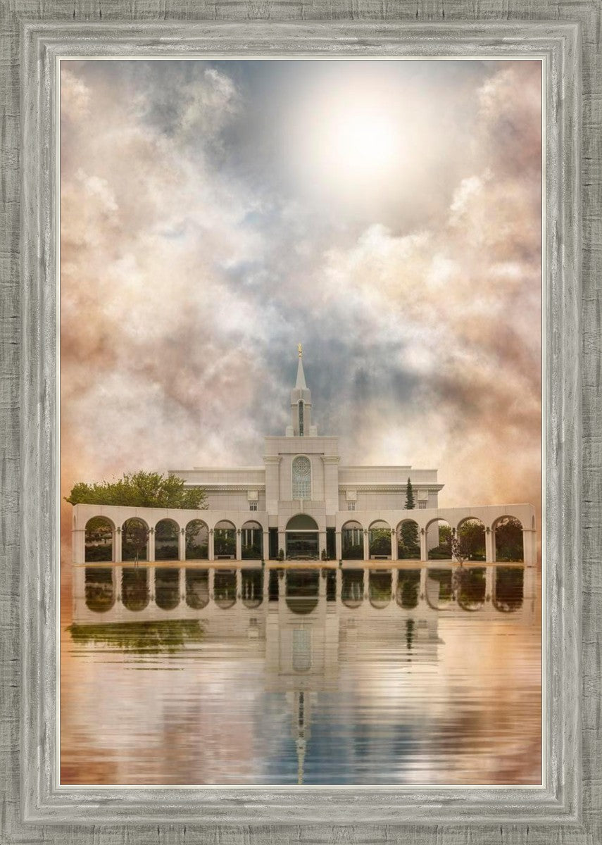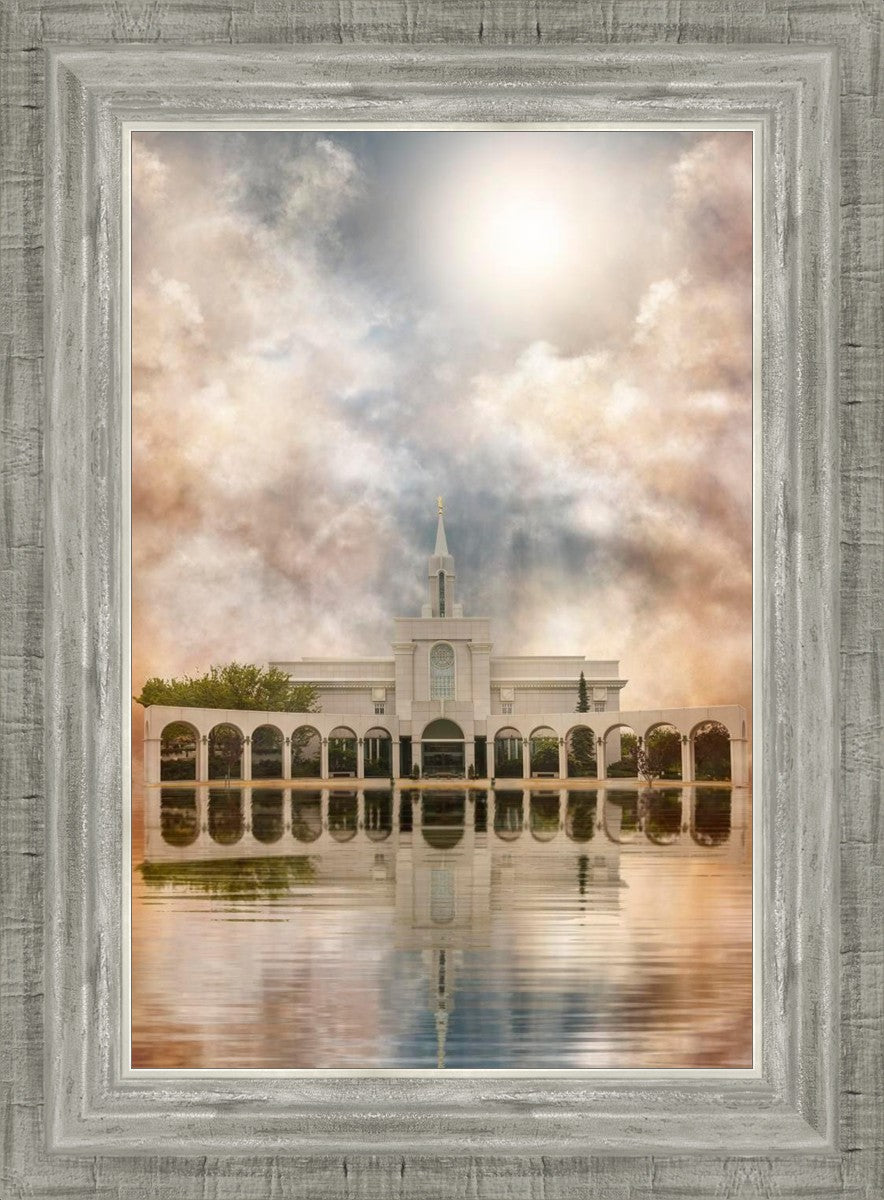 Millennial reflection of the Bountiful Utah Temple with pastel clouds in the sky.