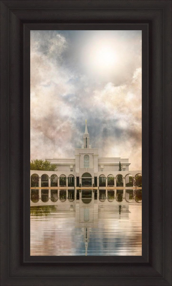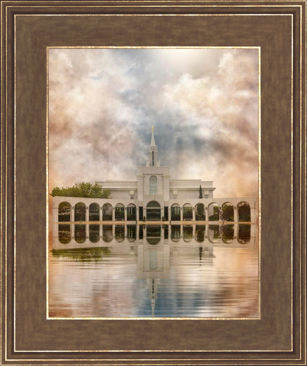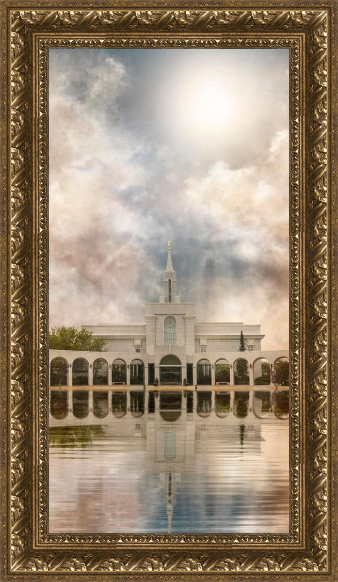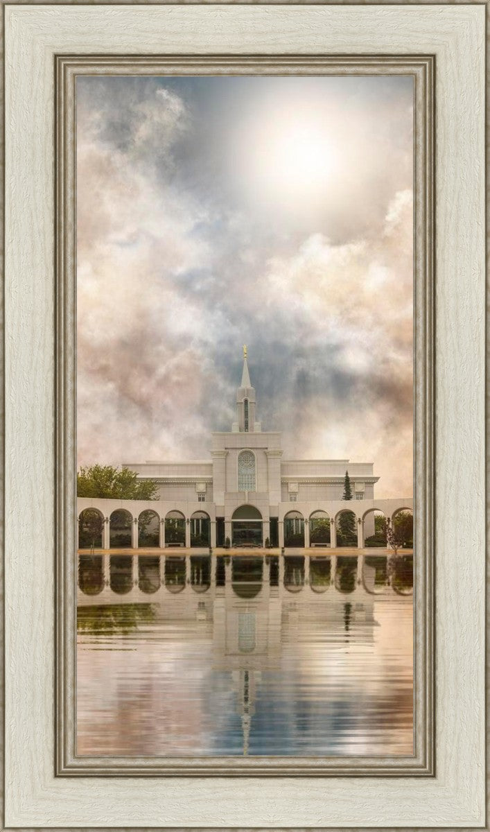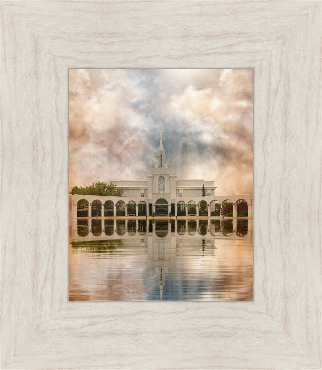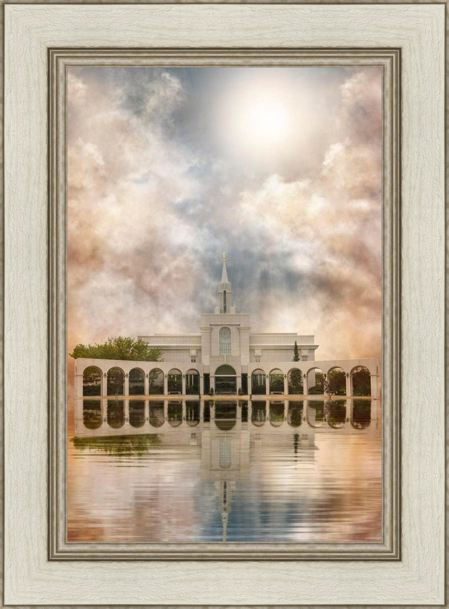 Millennial reflection of the Bountiful Utah Temple with pastel clouds in the sky.
