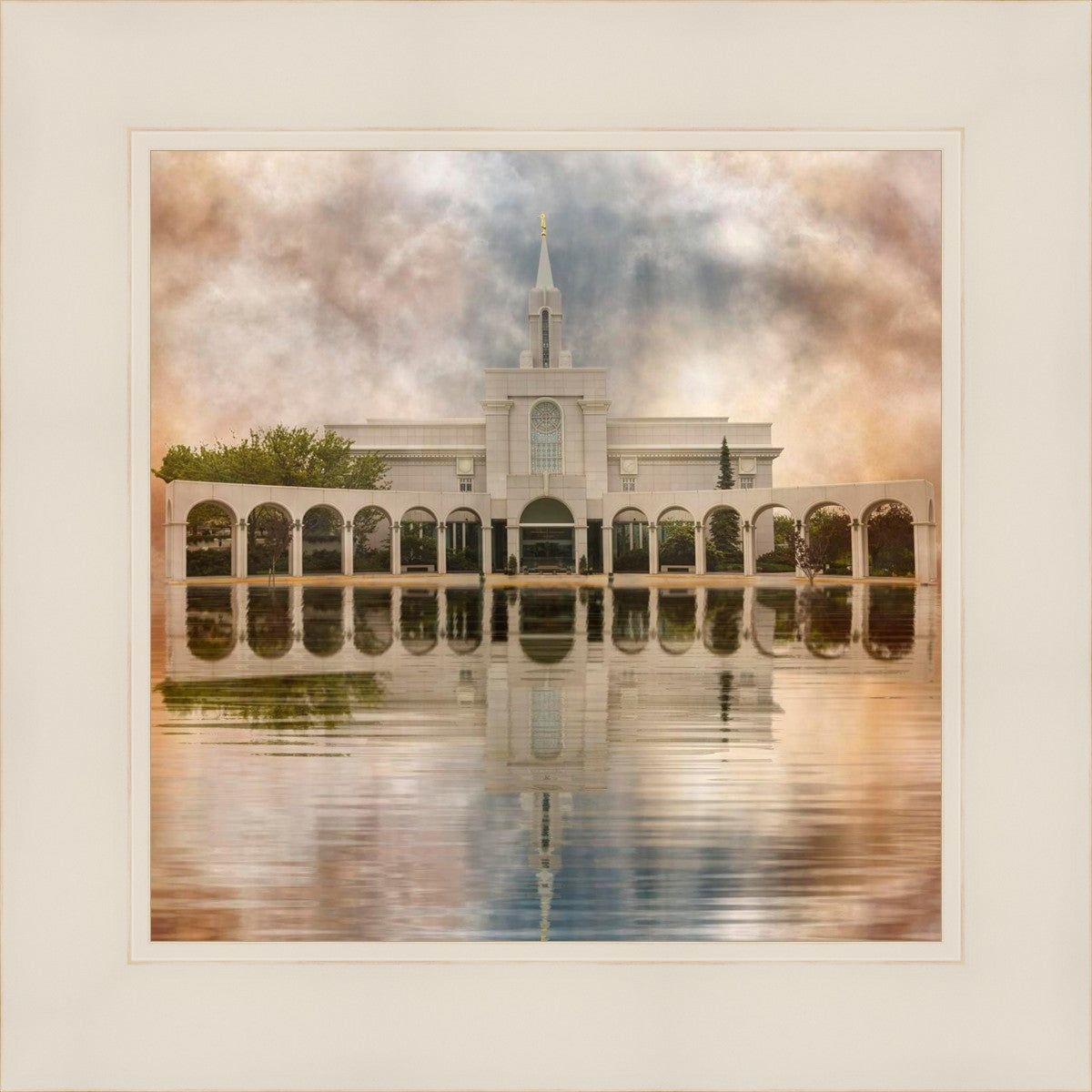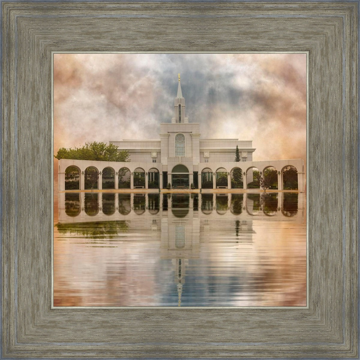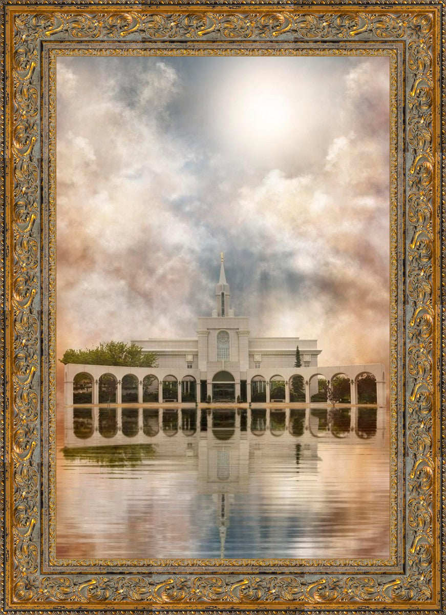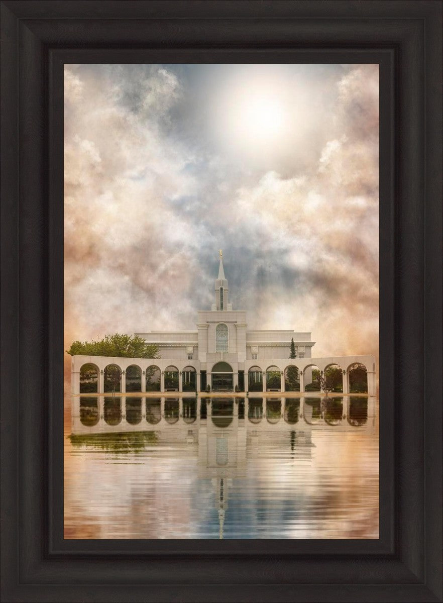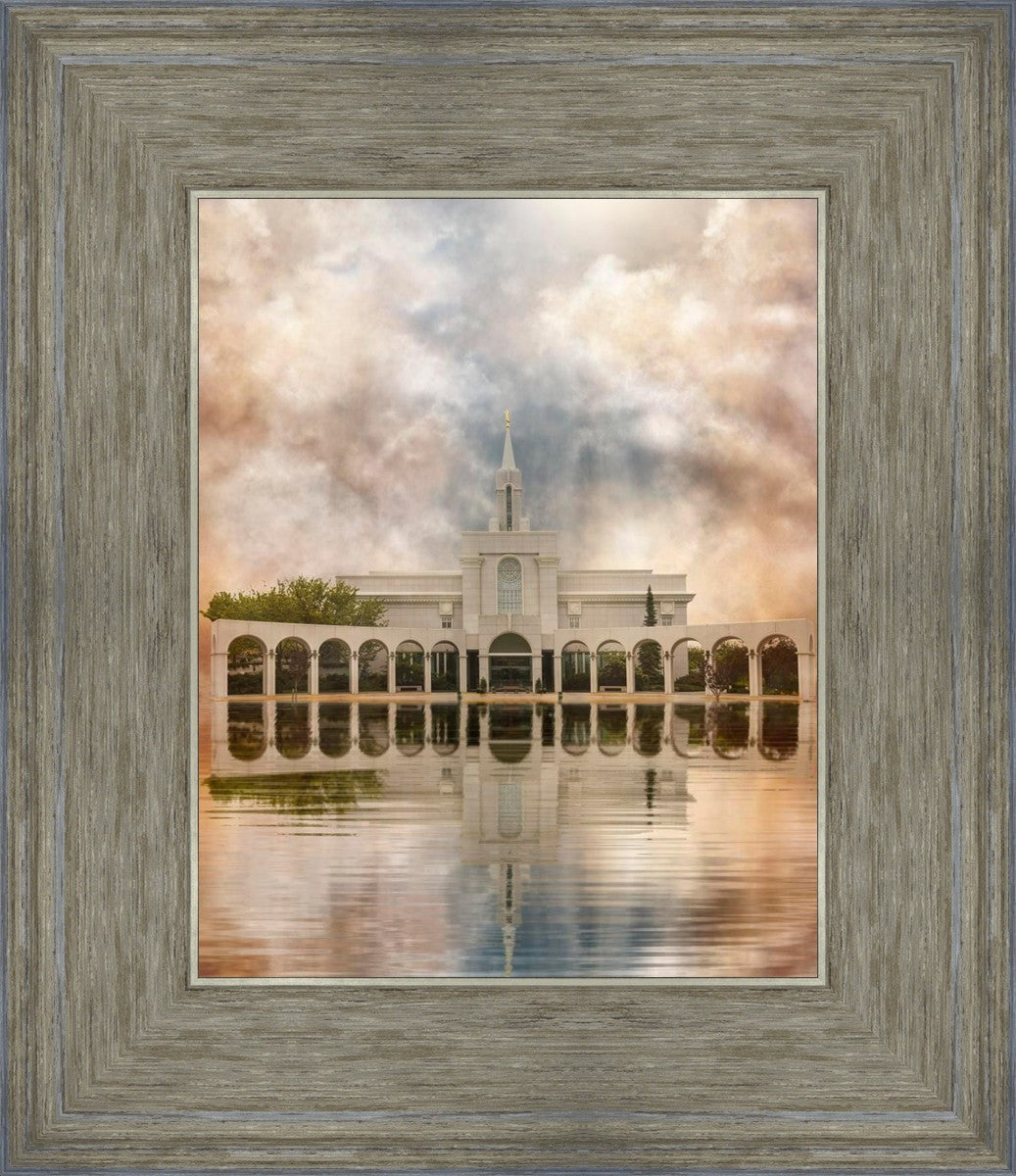 Millennial reflection of the Bountiful Utah Temple with pastel clouds in the sky.