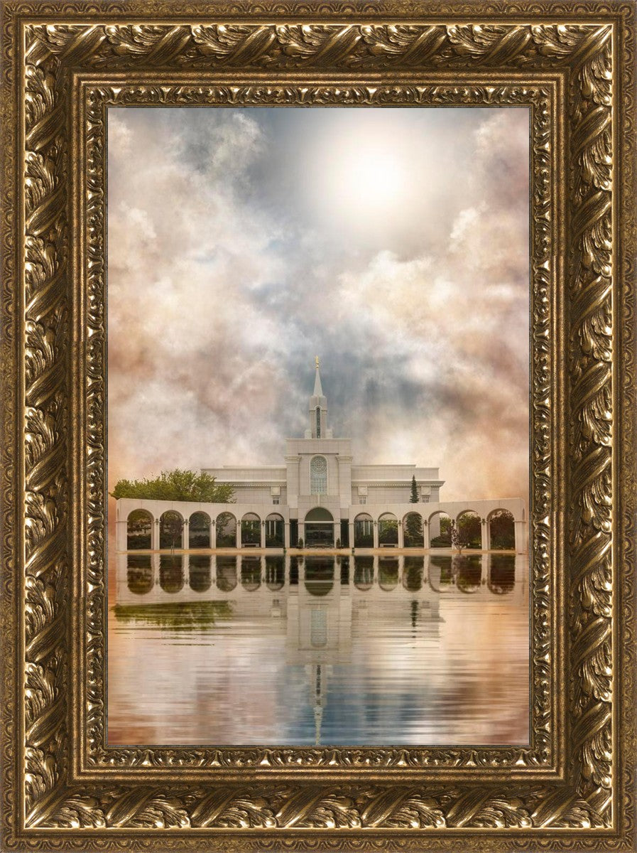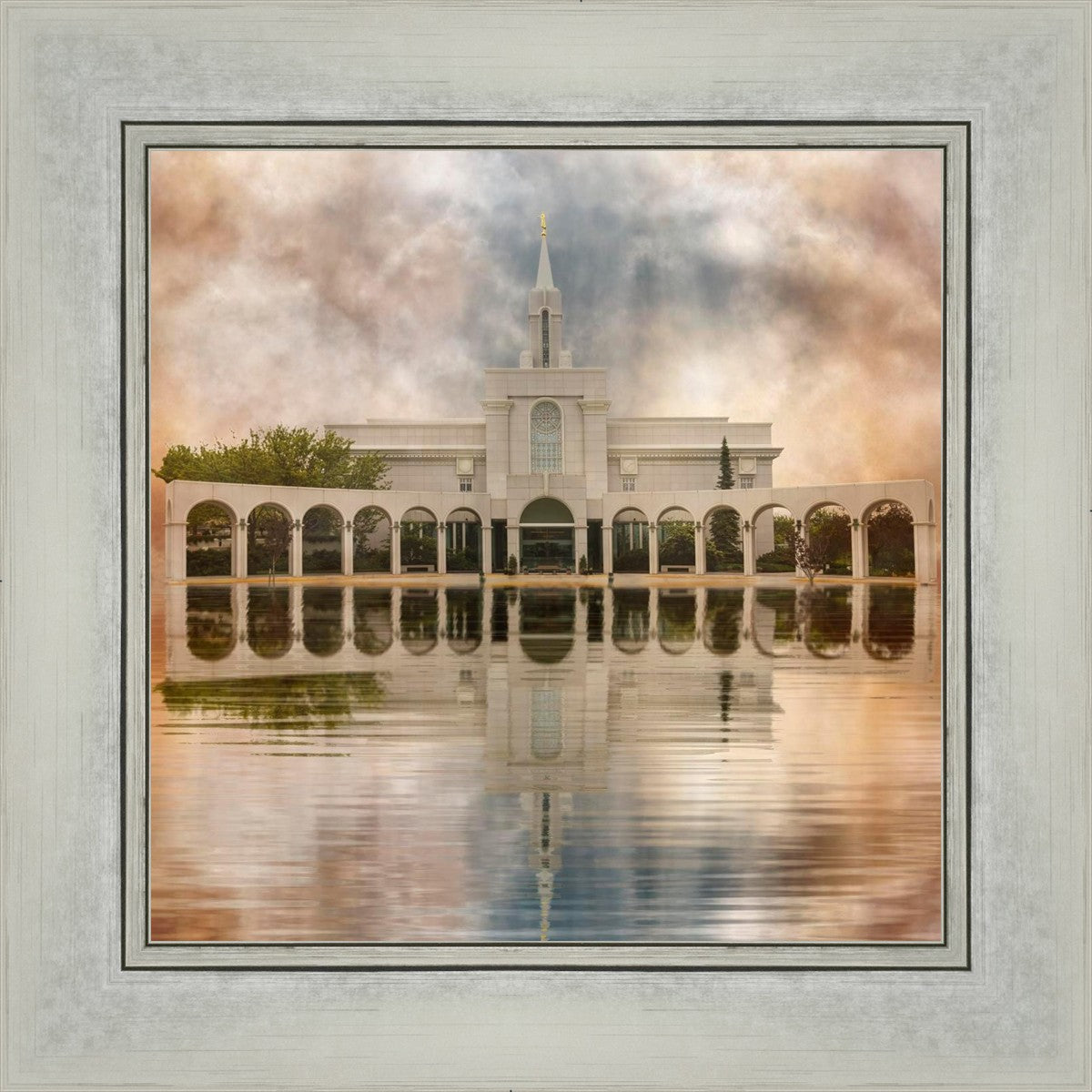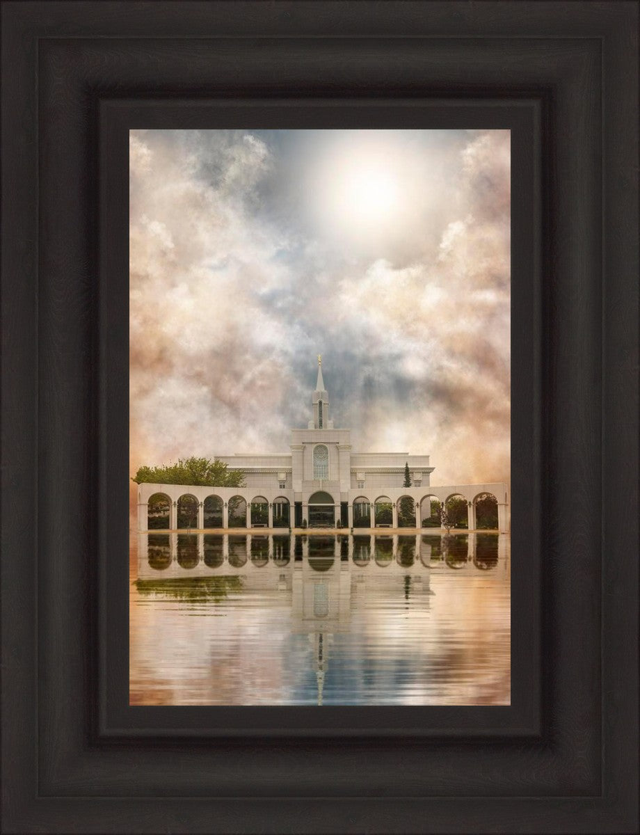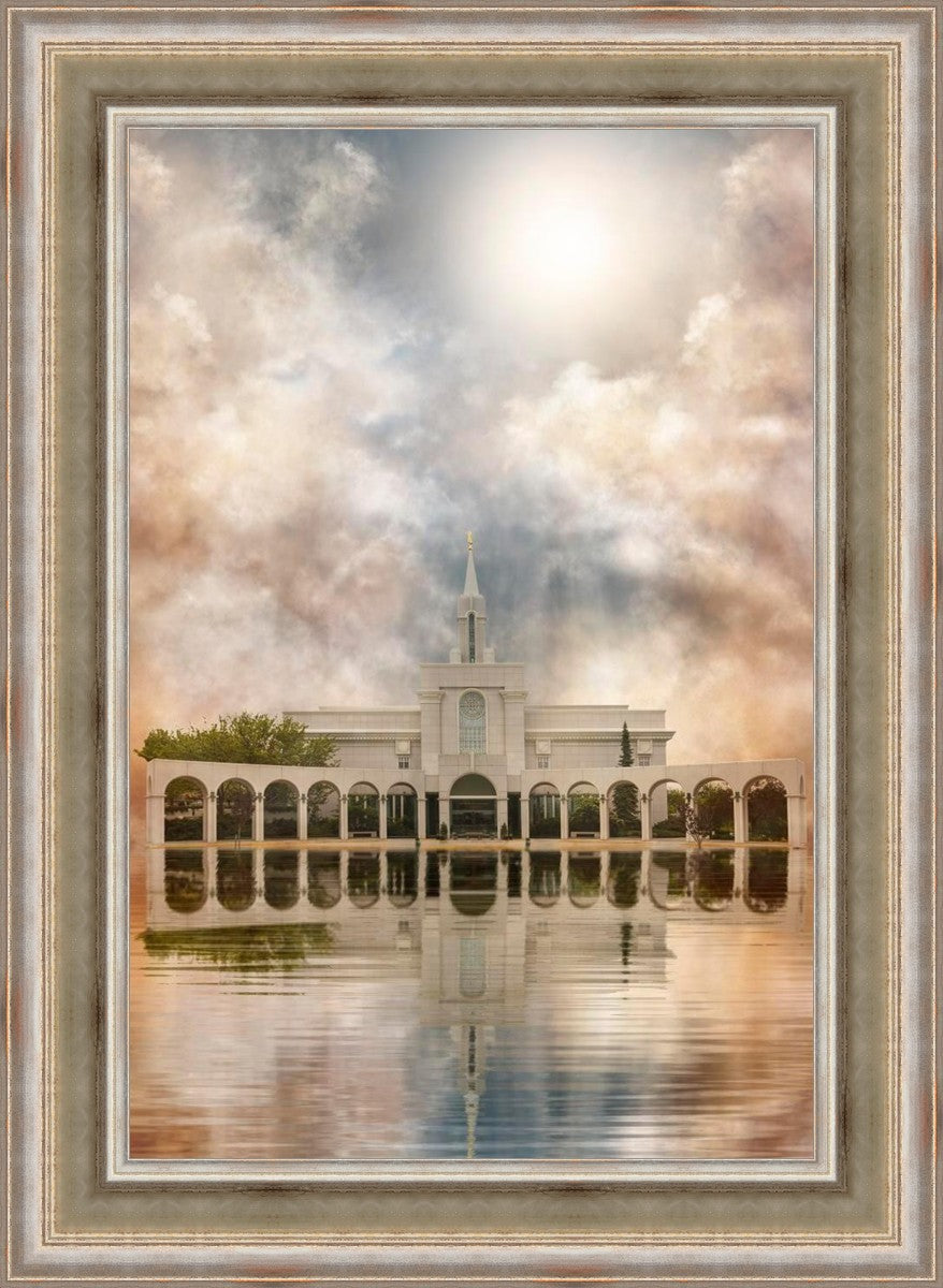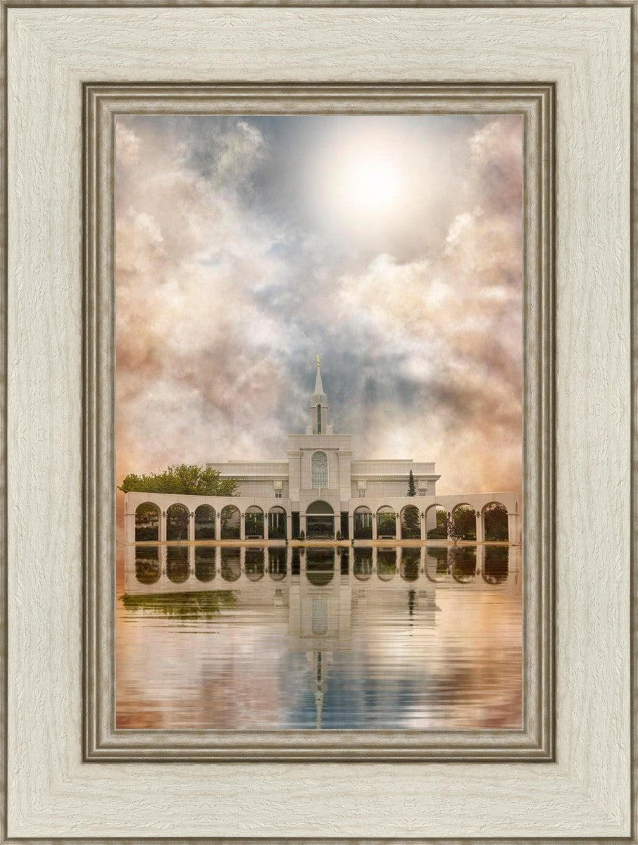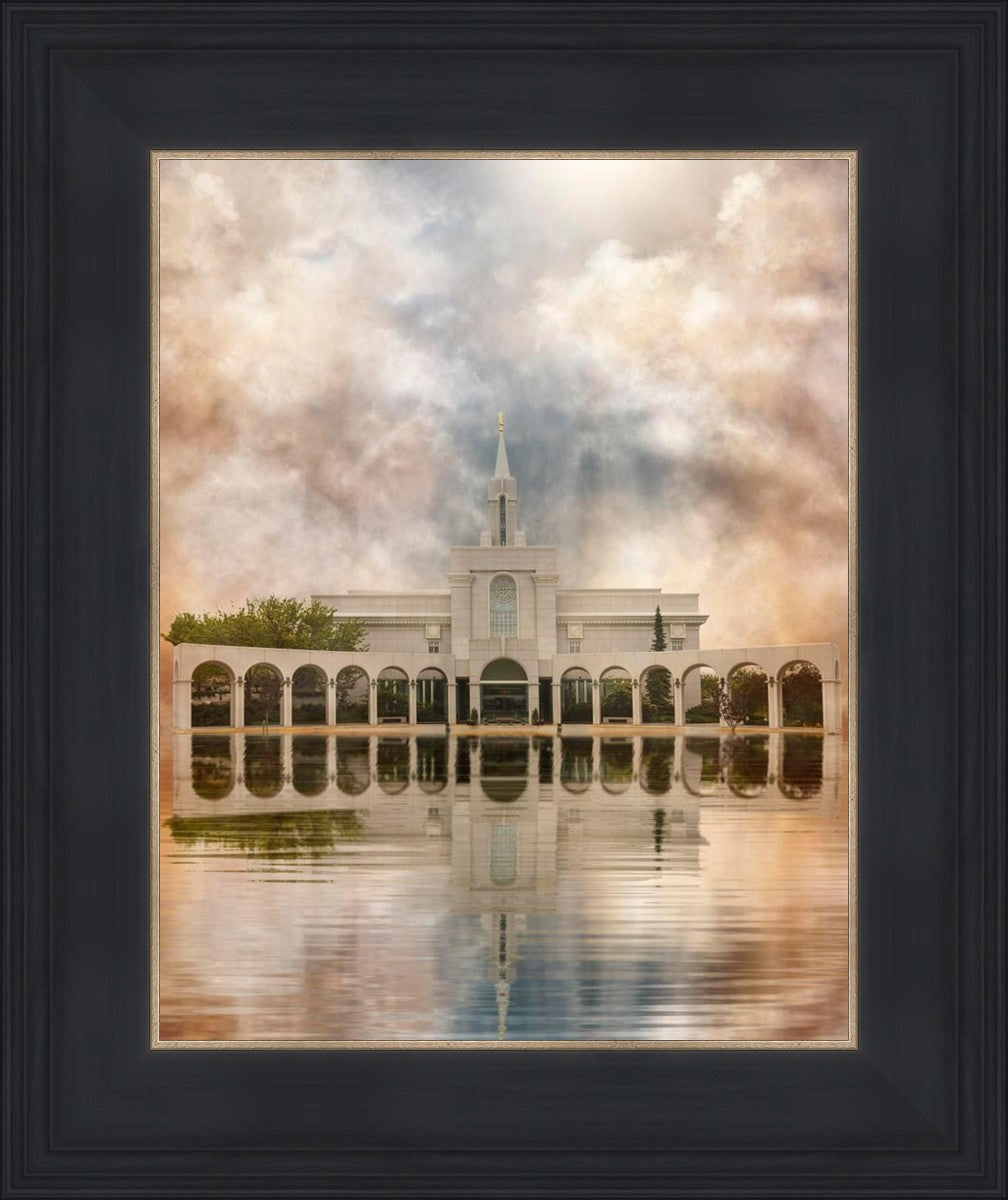 Millennial reflection of the Bountiful Utah Temple with pastel clouds in the sky.