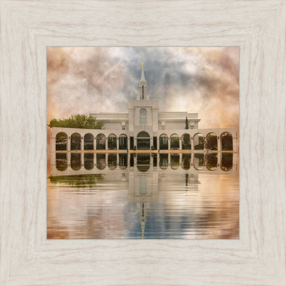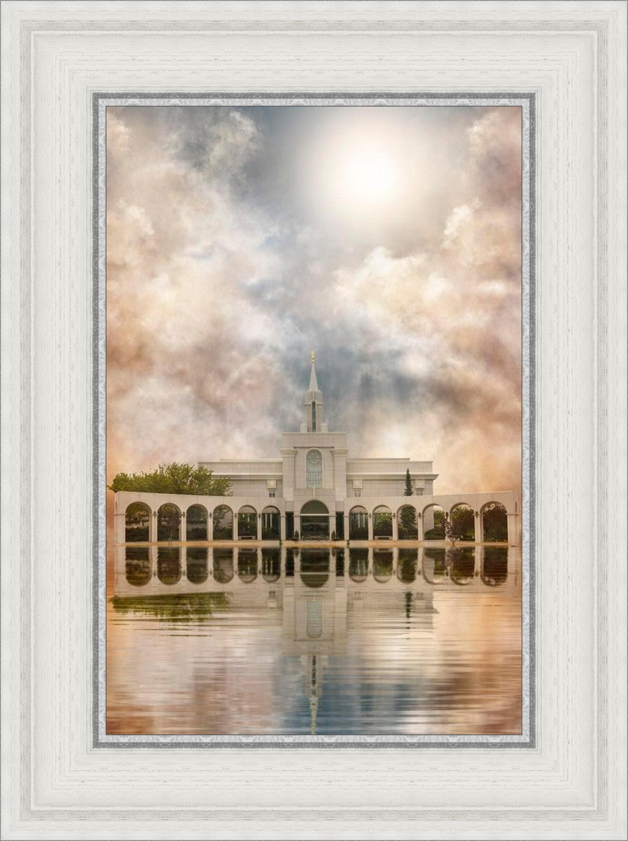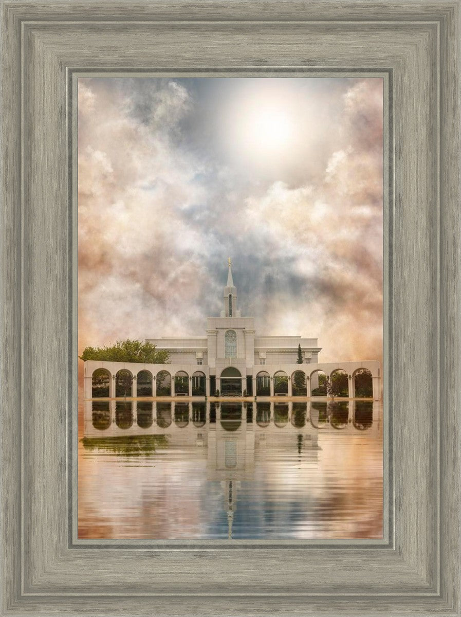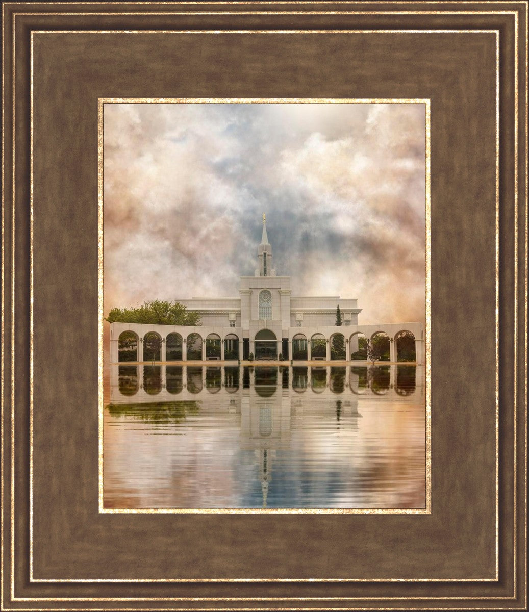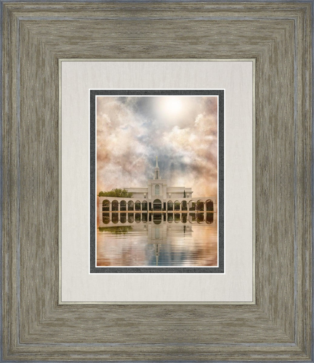 Millennial reflection of the Bountiful Utah Temple with pastel clouds in the sky.