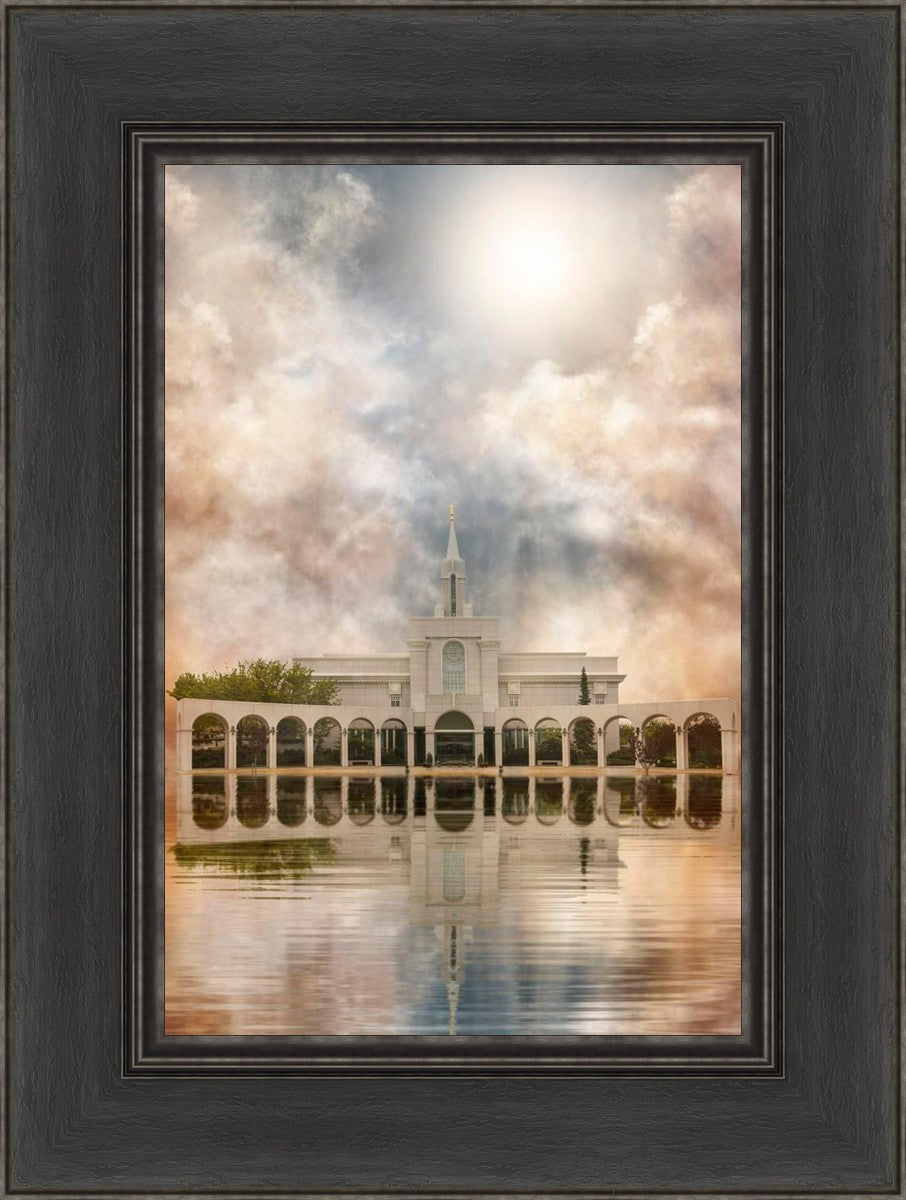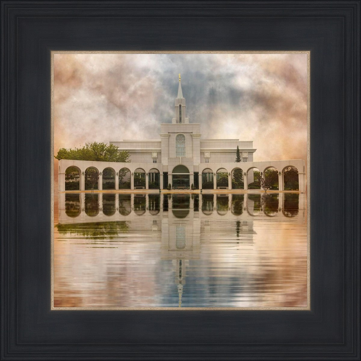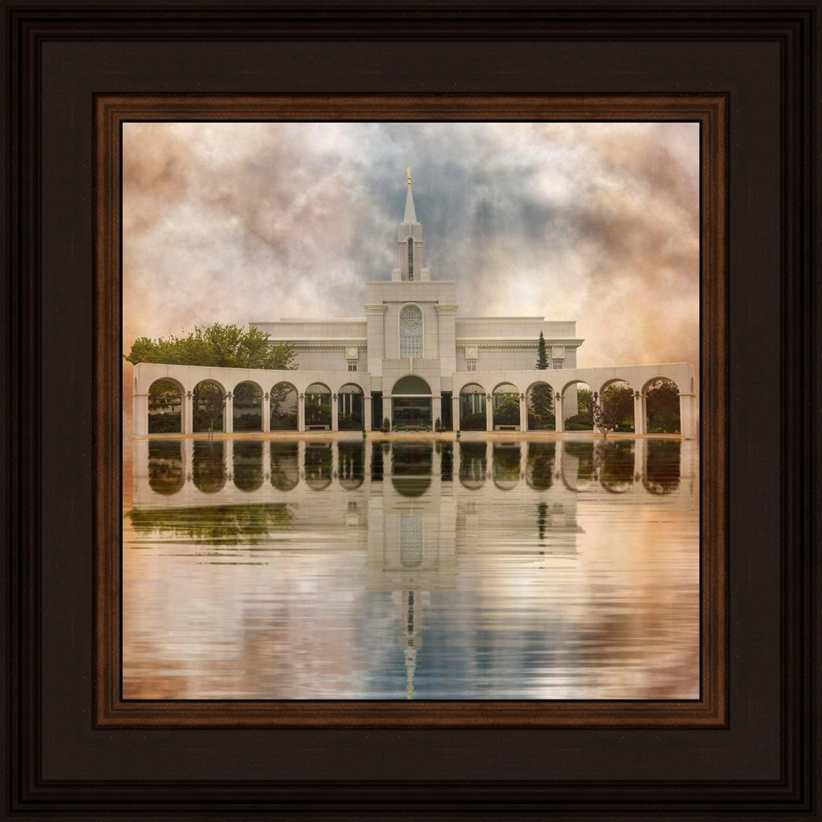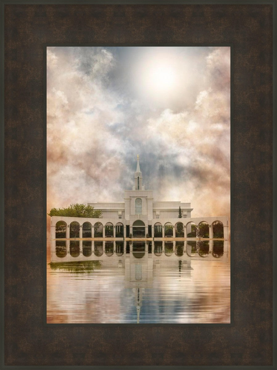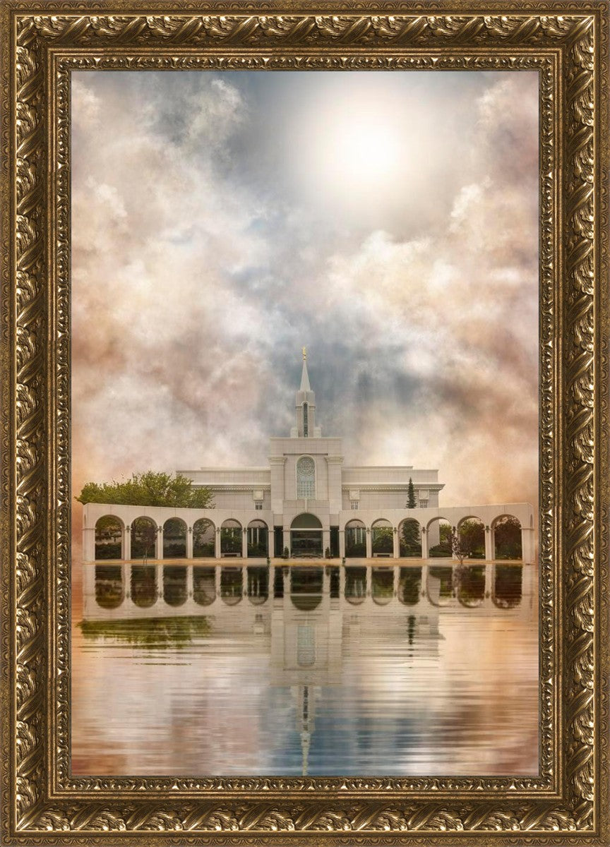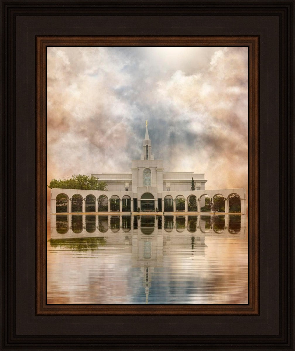 Millennial reflection of the Bountiful Utah Temple with pastel clouds in the sky.