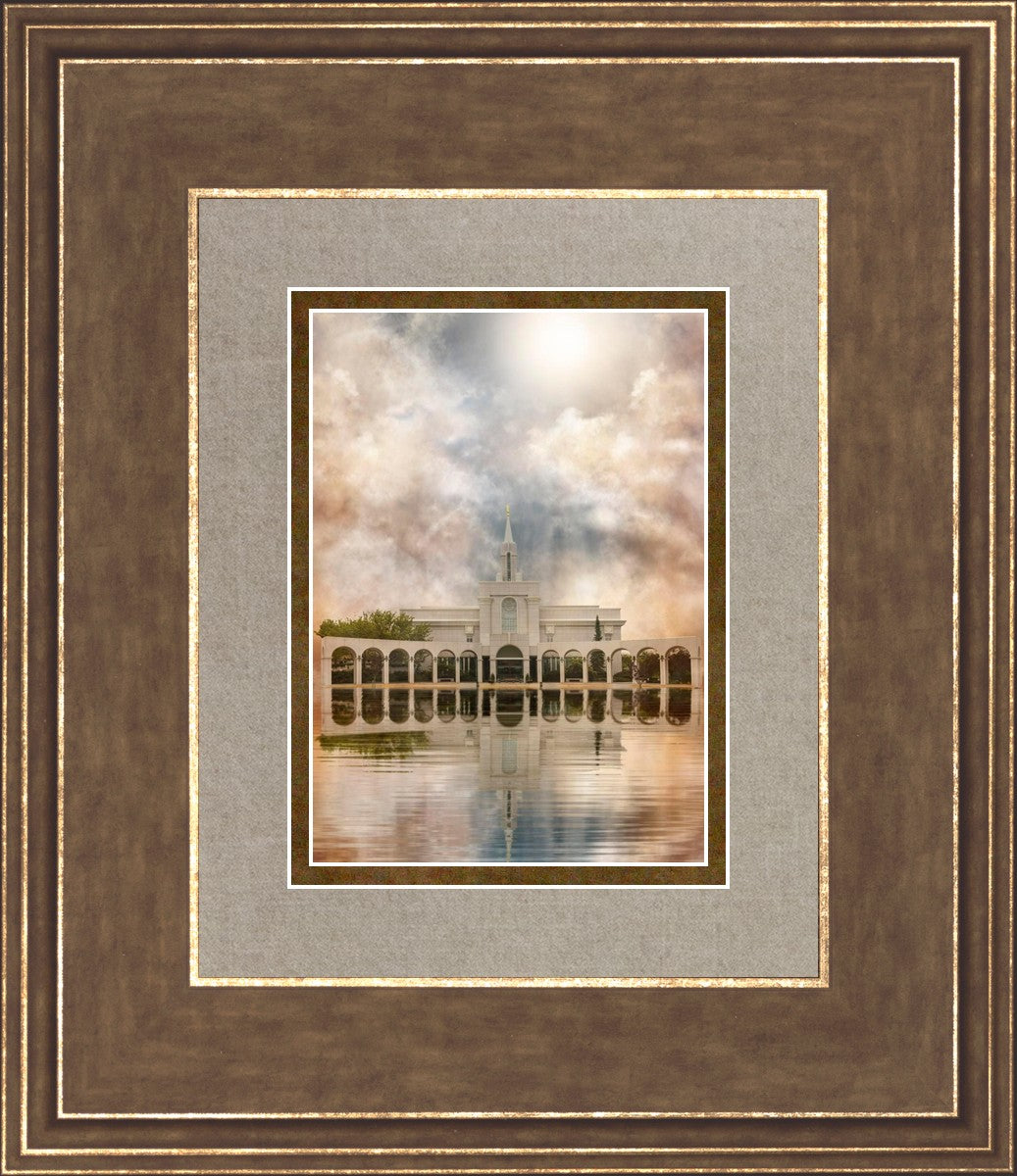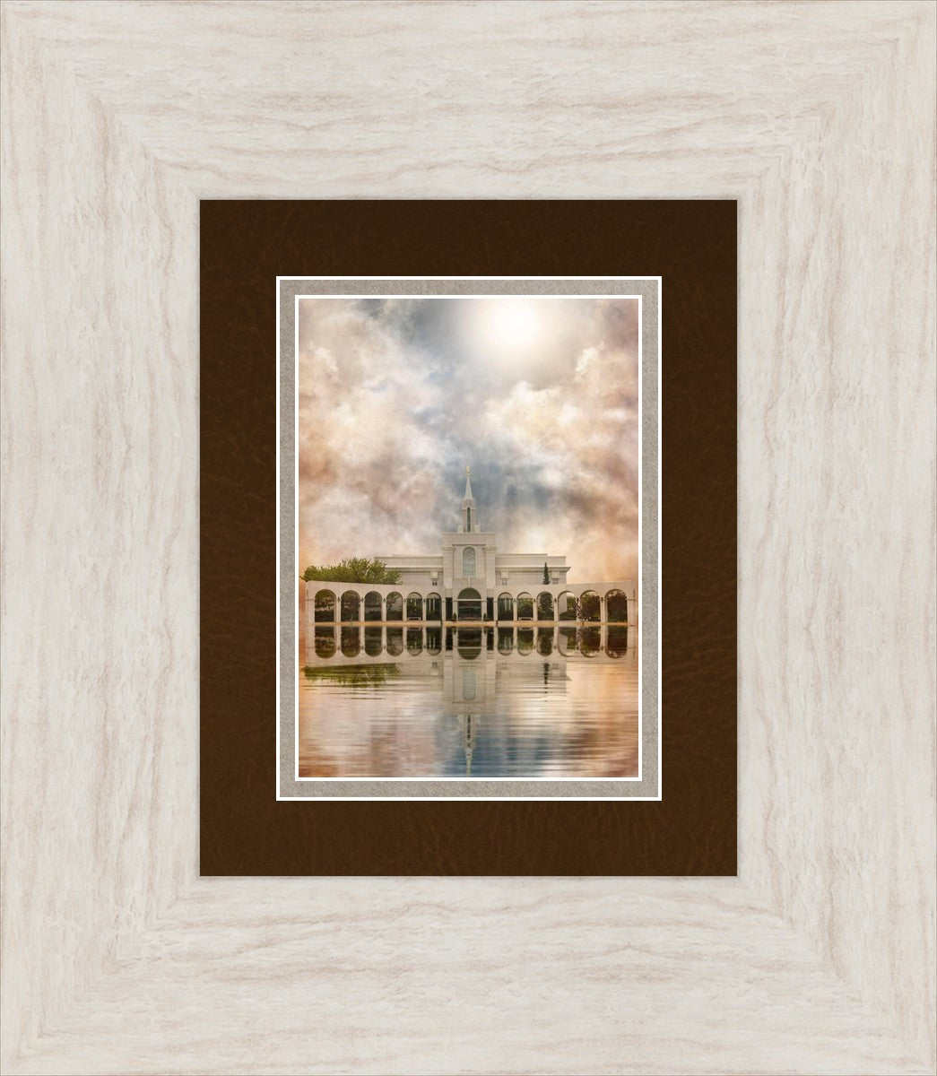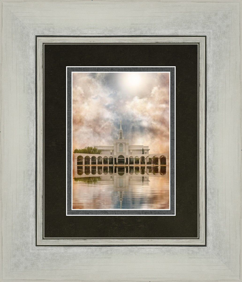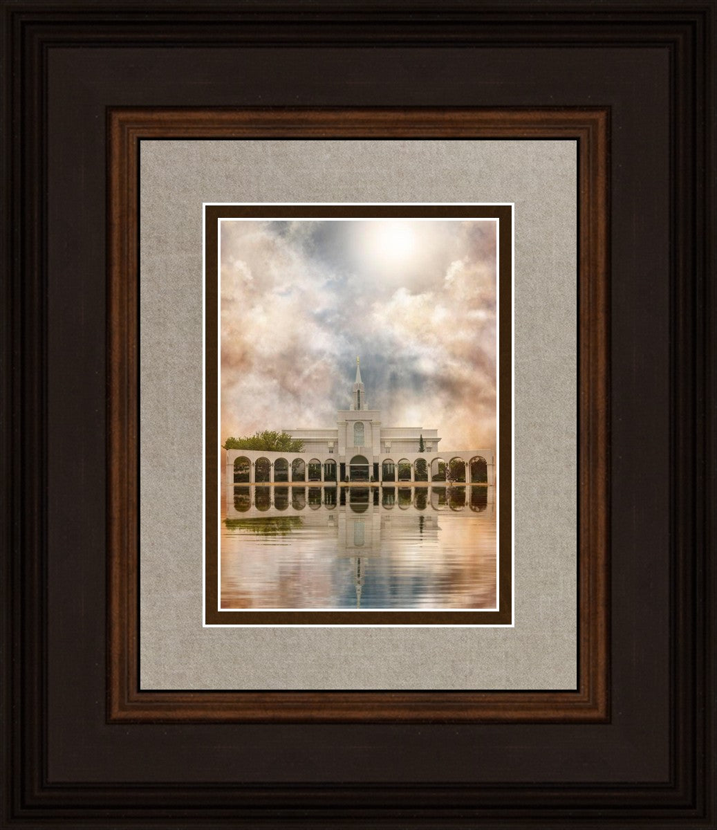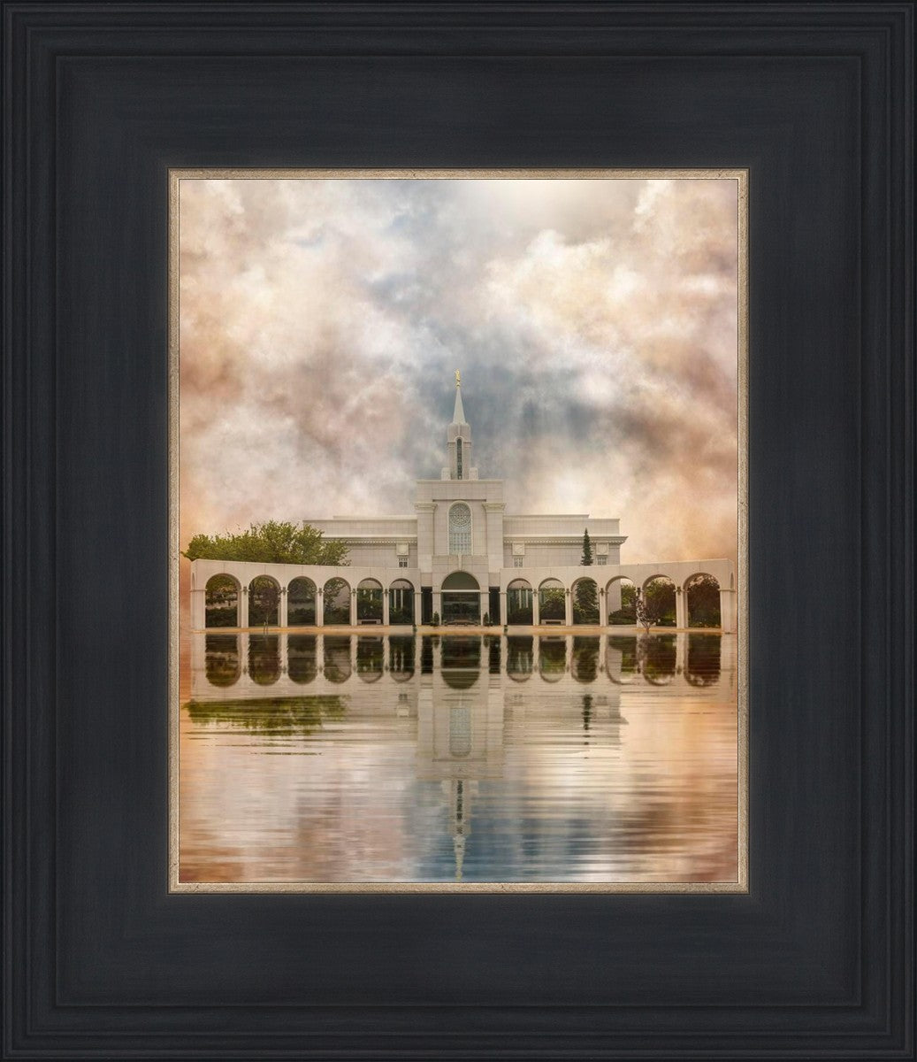 Millennial reflection of the Bountiful Utah Temple with pastel clouds in the sky.
