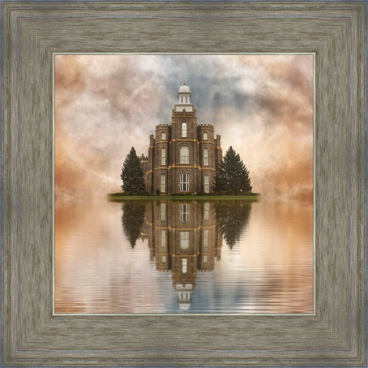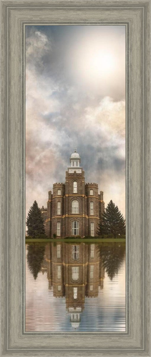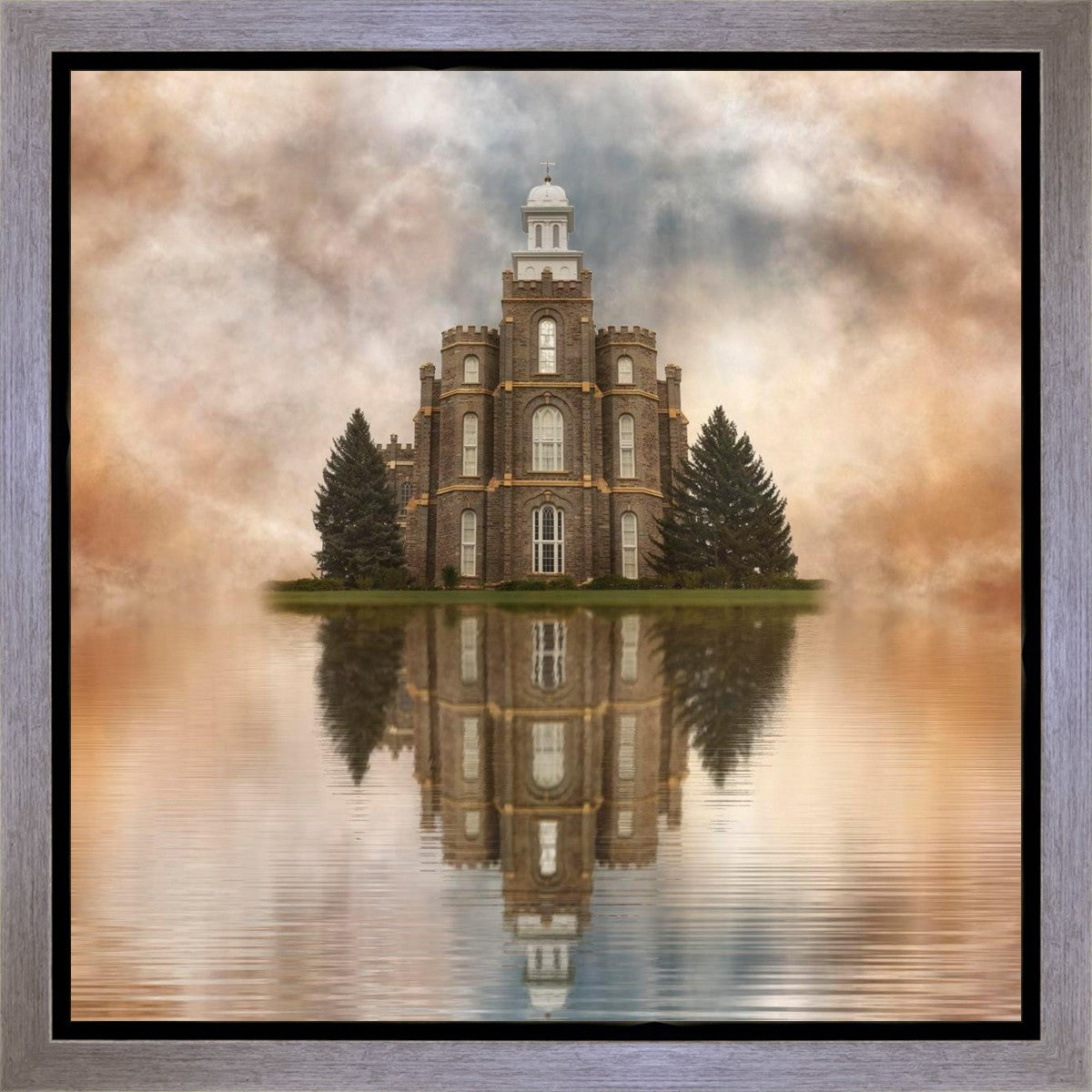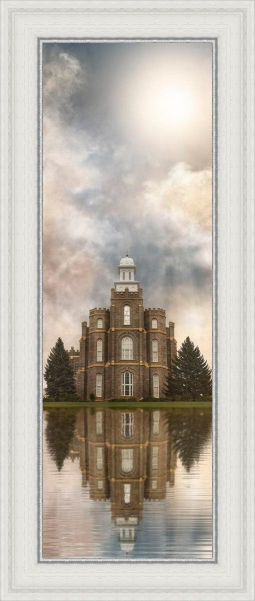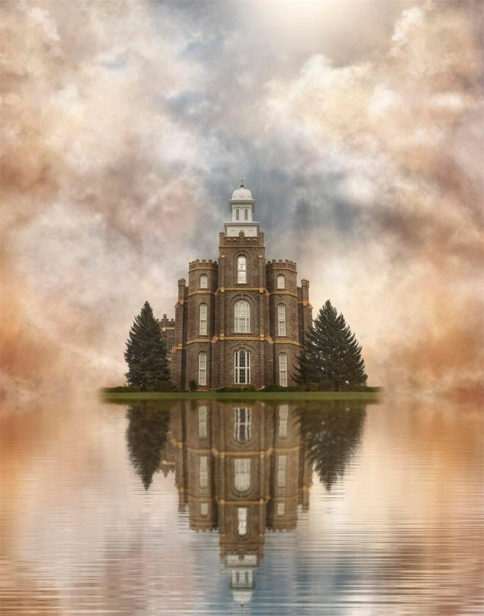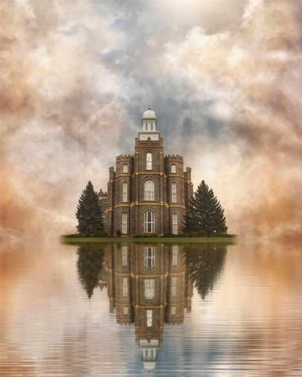 Millennial reflection of the Logan Utah Temple with pastel clouds in the sky.