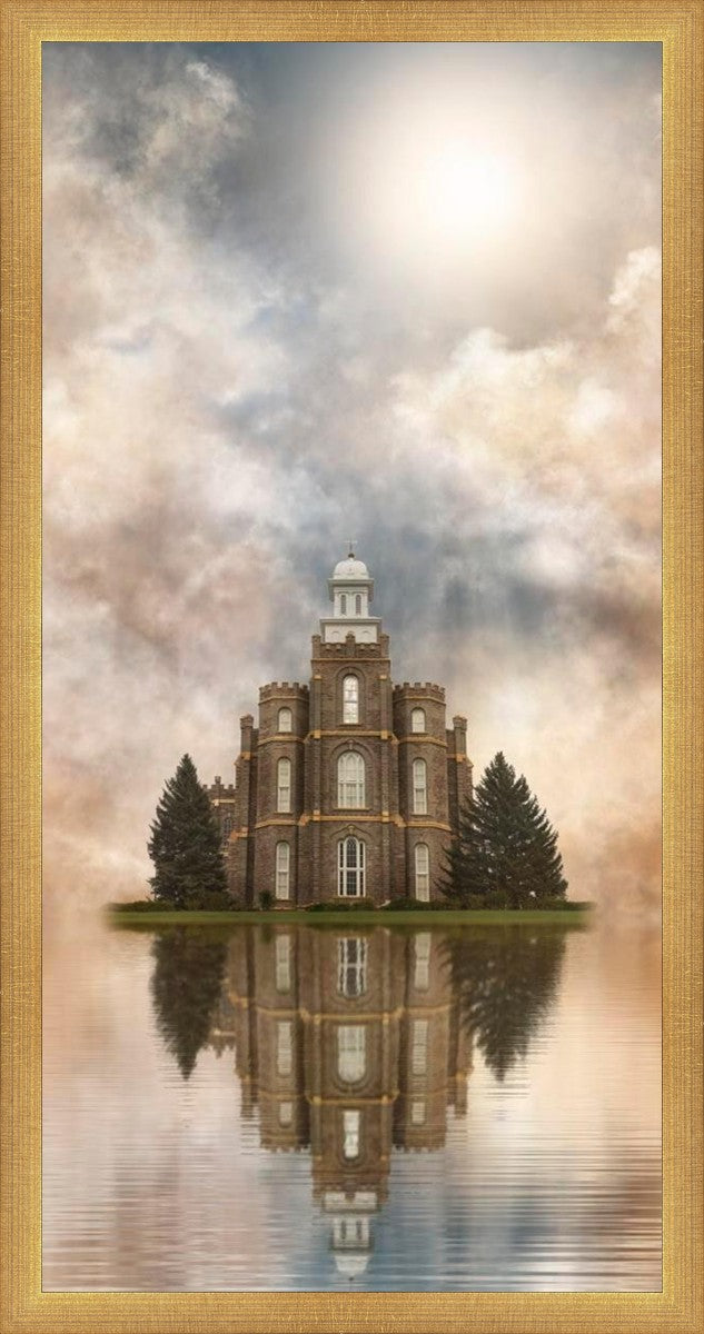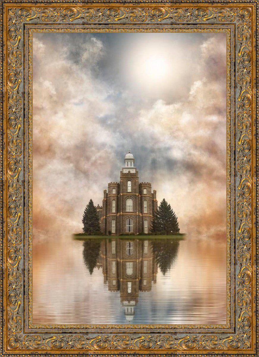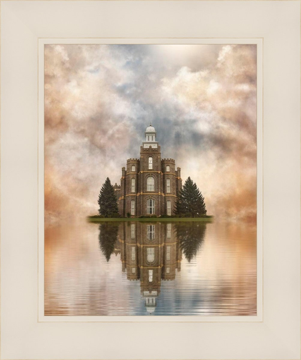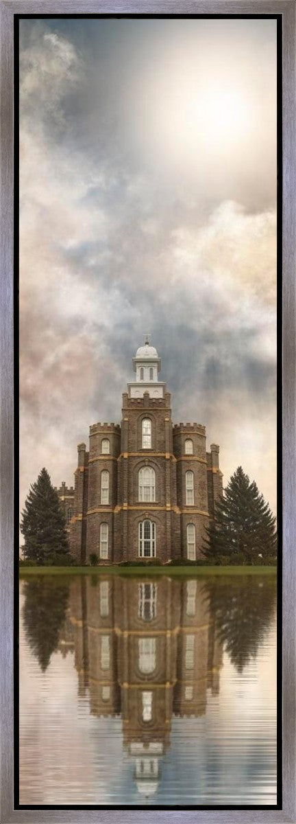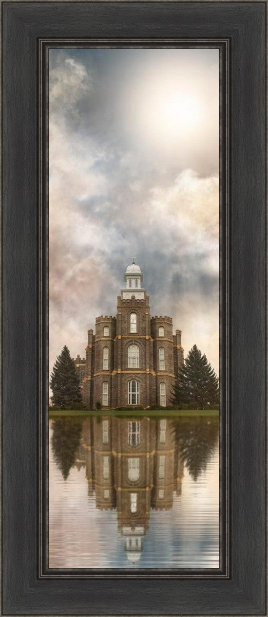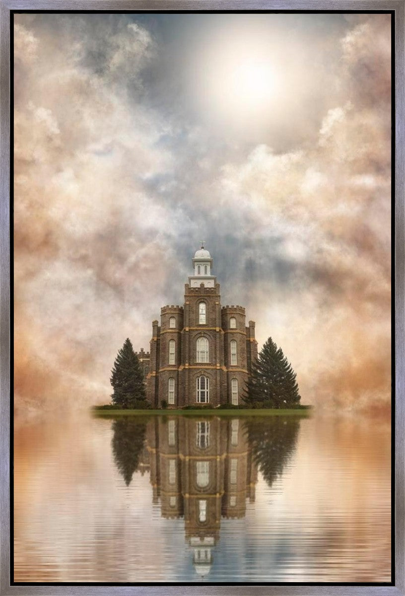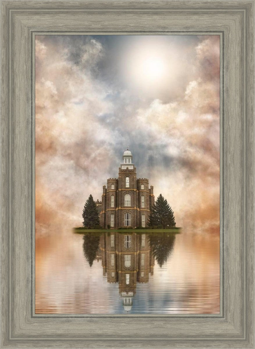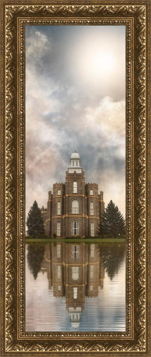 Millennial reflection of the Logan Utah Temple with pastel clouds in the sky.