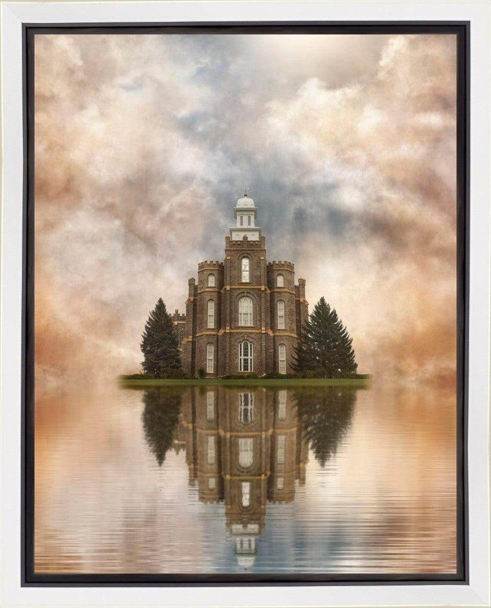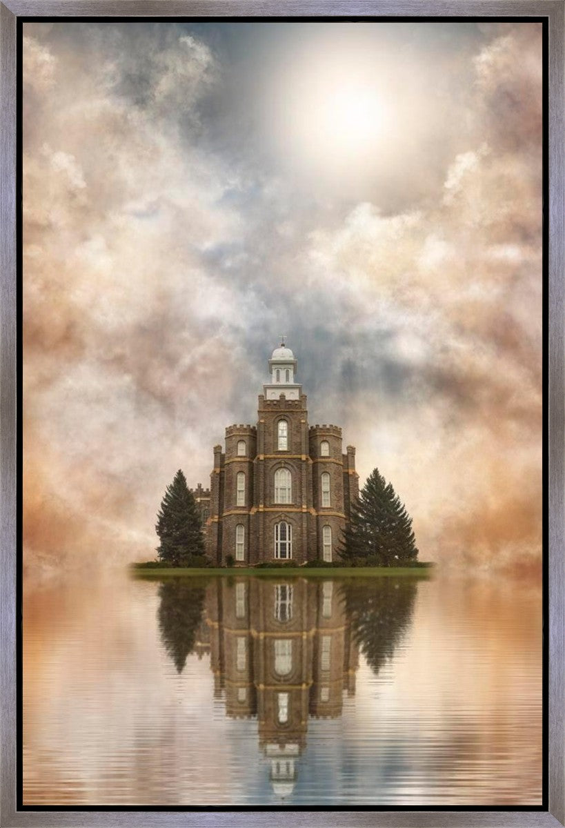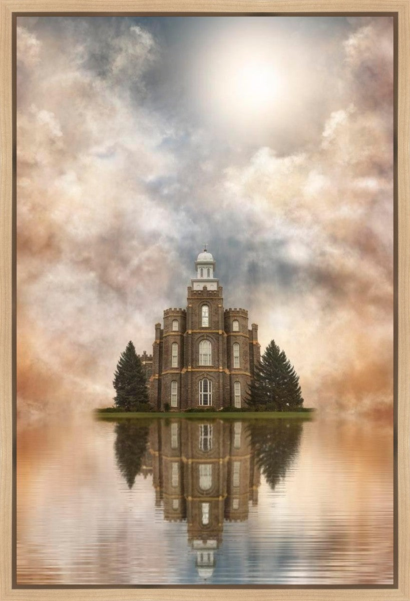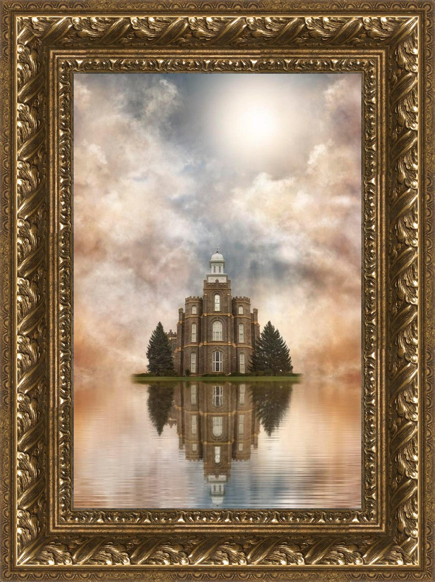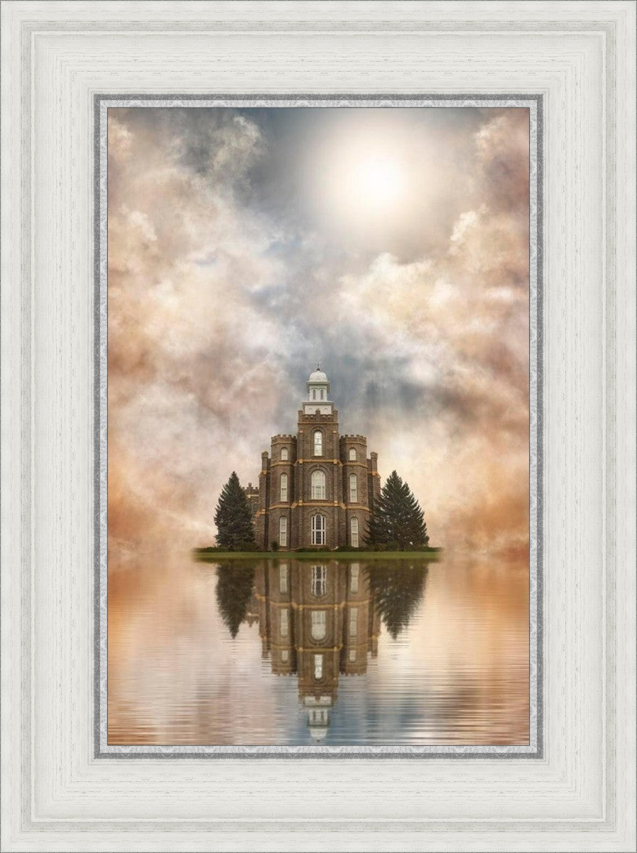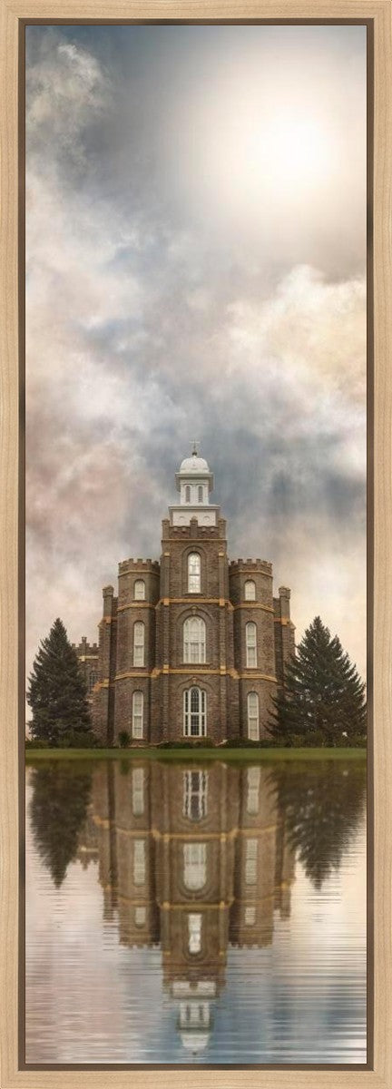 Millennial reflection of the Logan Utah Temple with pastel clouds in the sky.