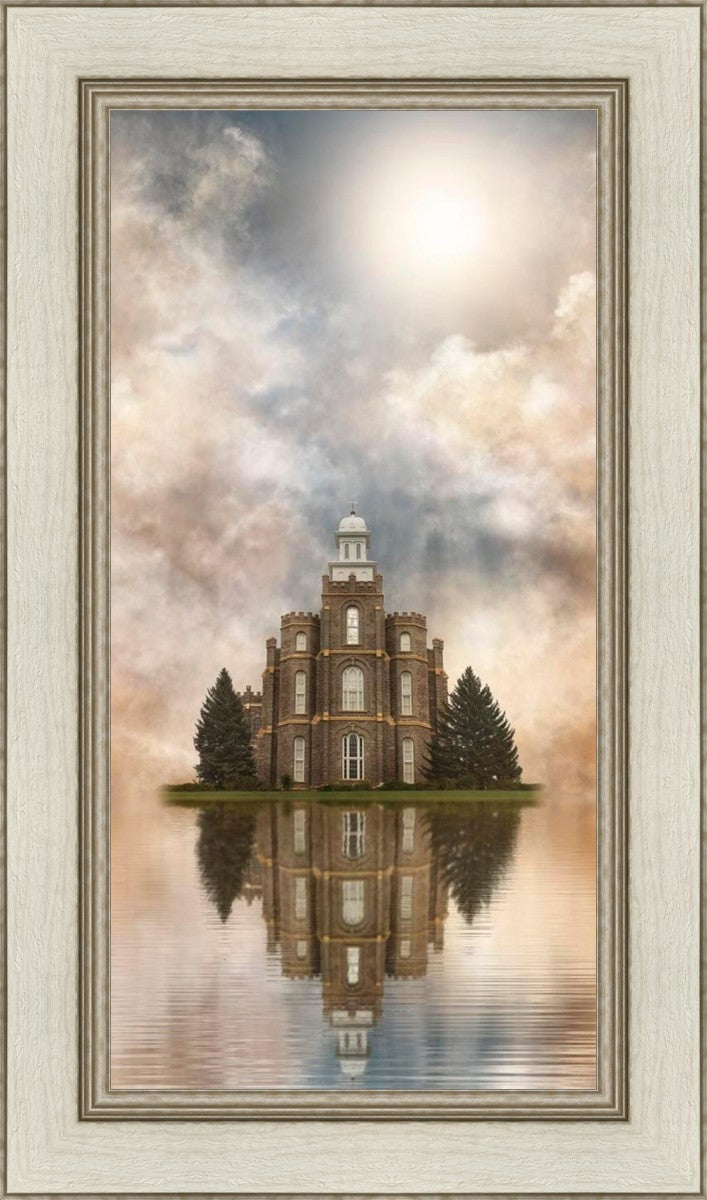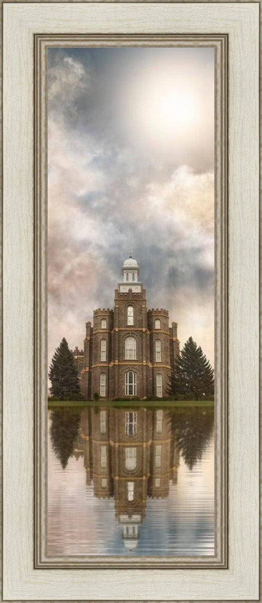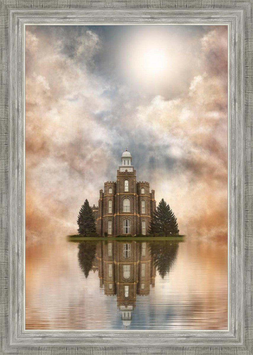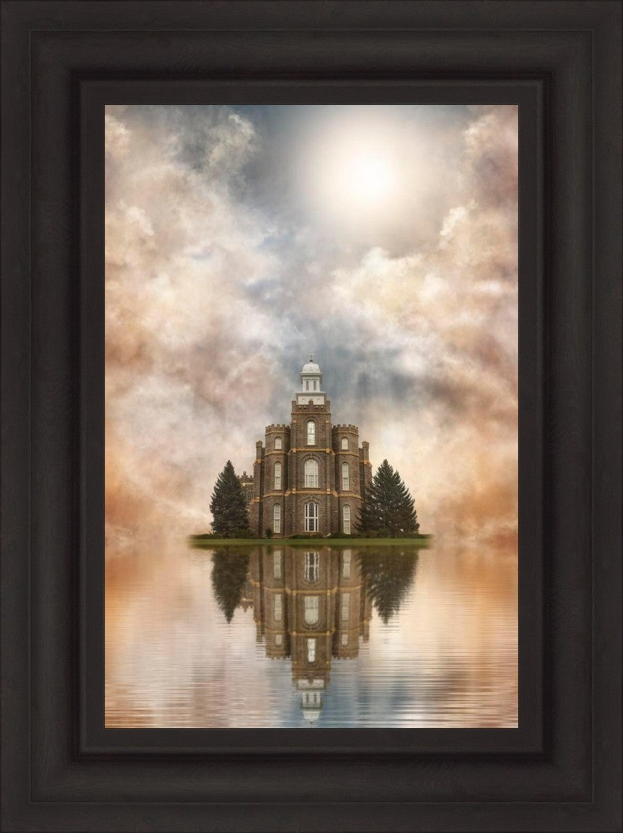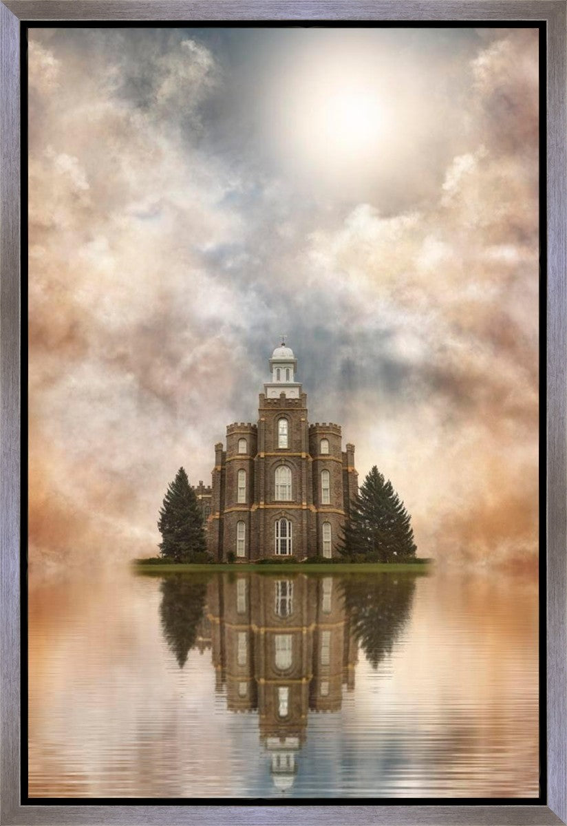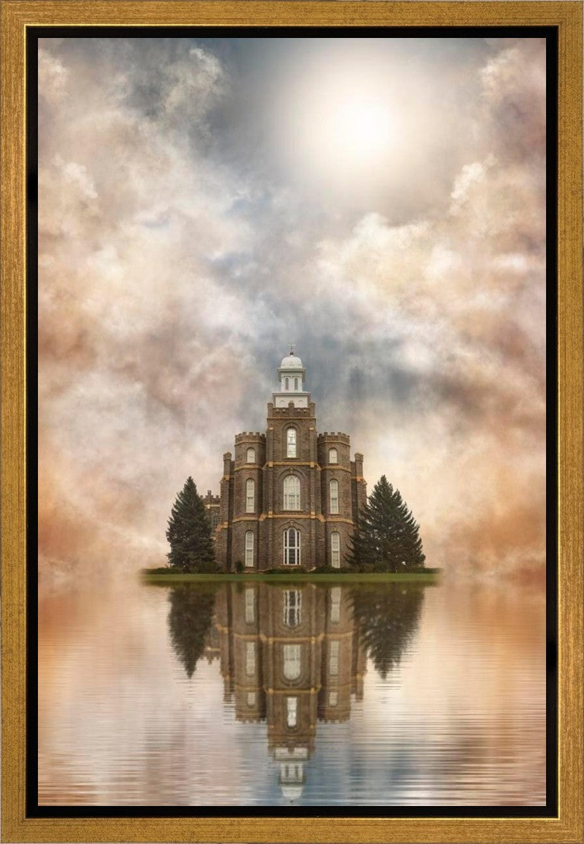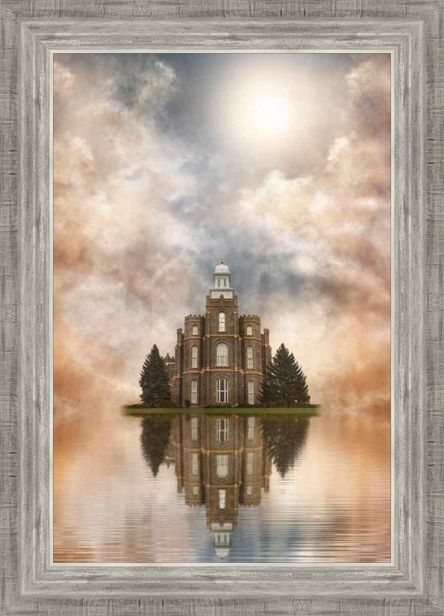 Millennial reflection of the Logan Utah Temple with pastel clouds in the sky.