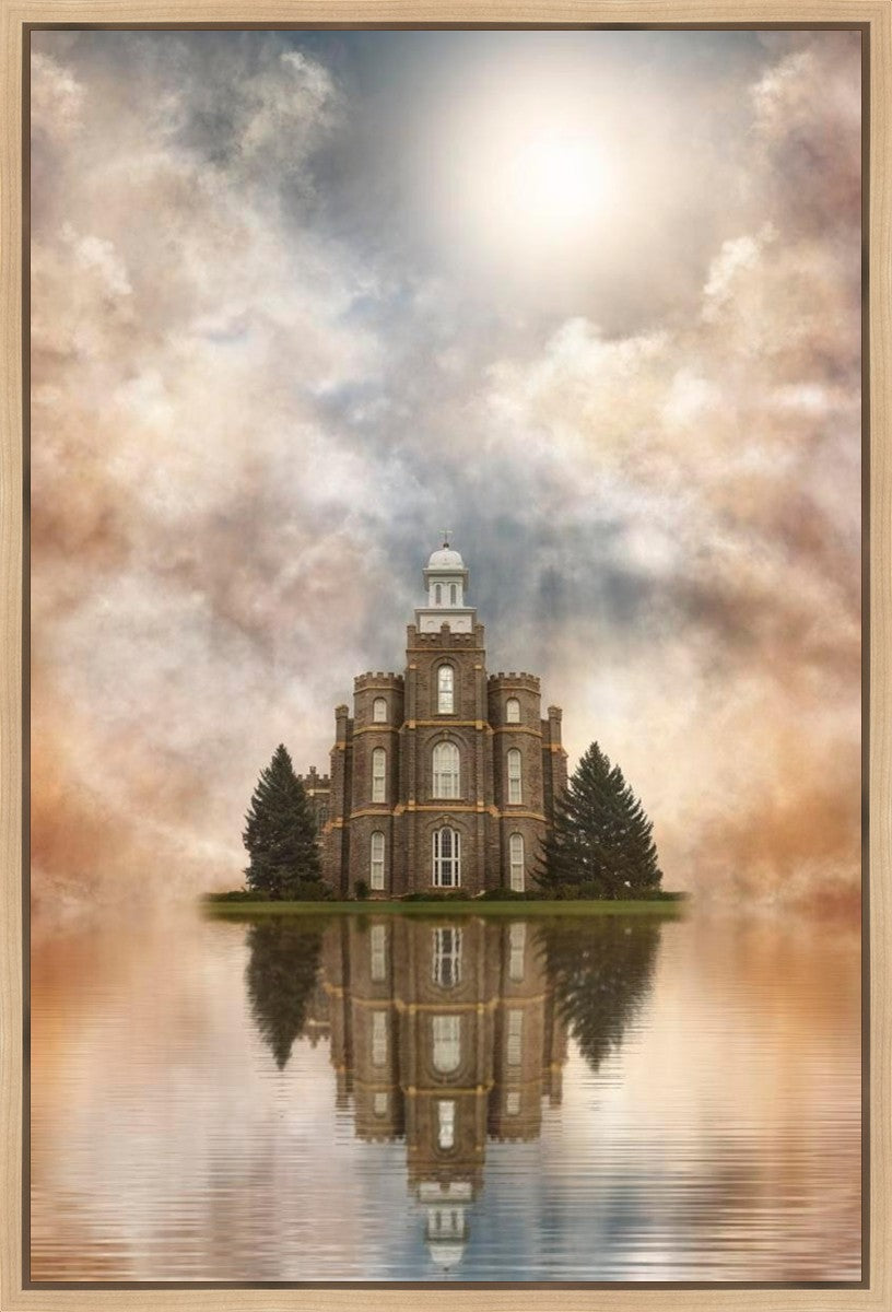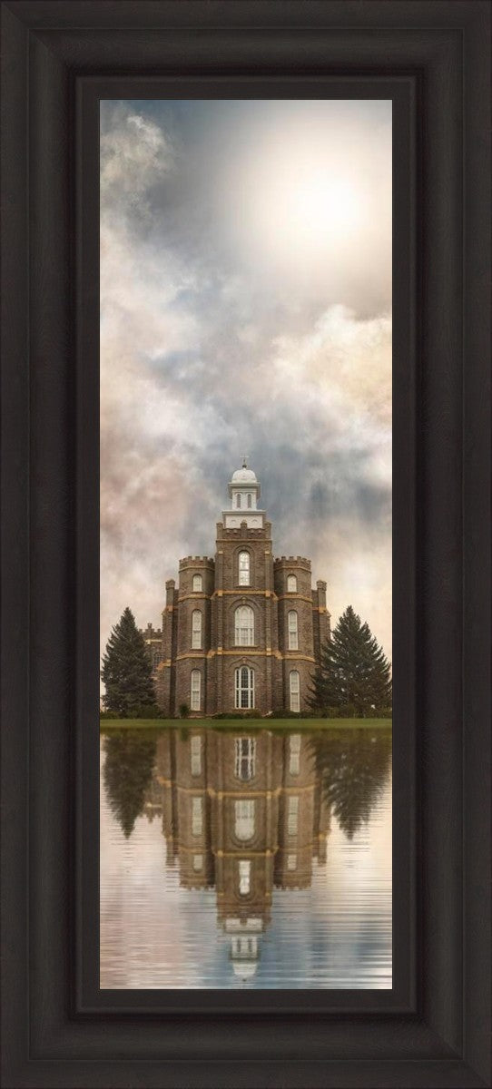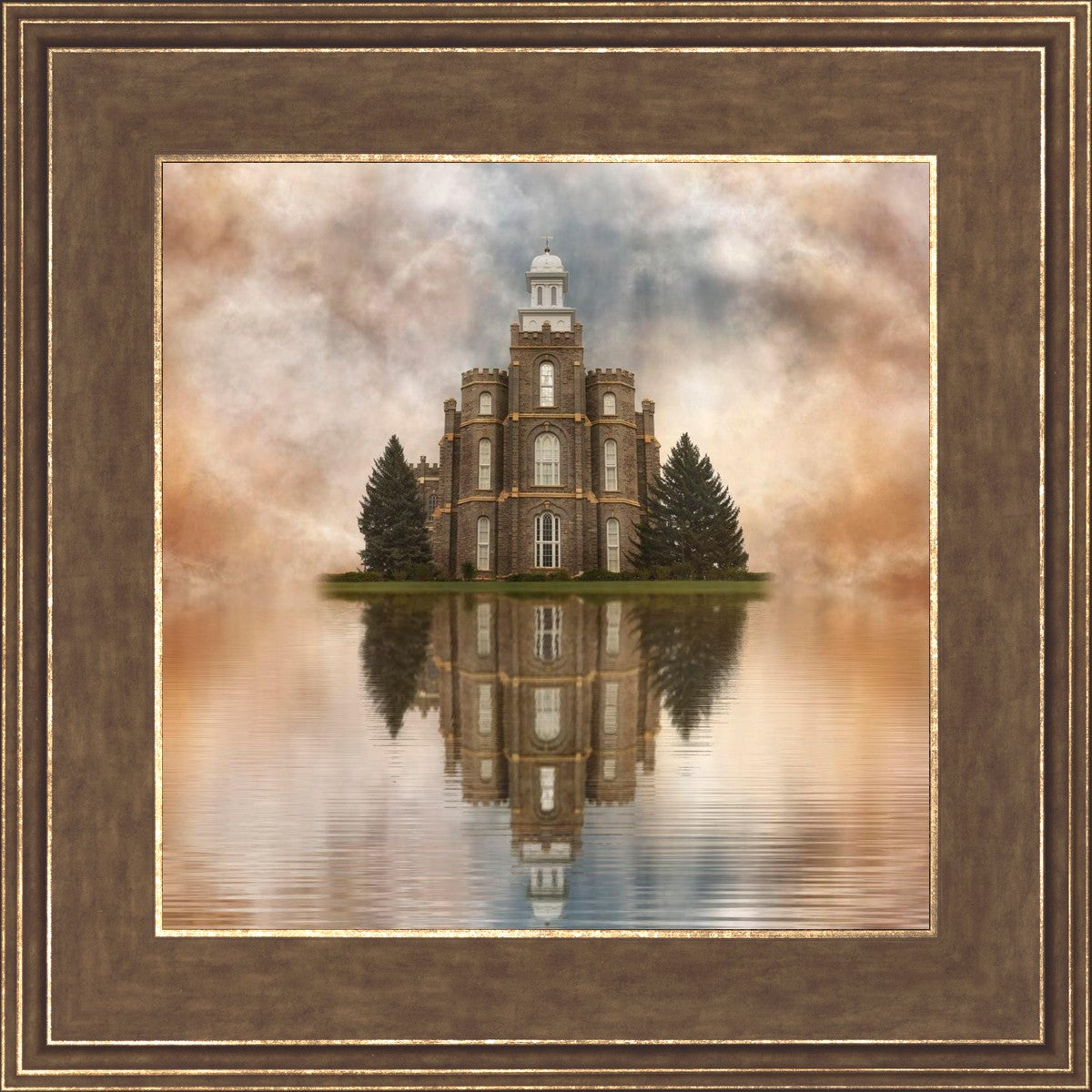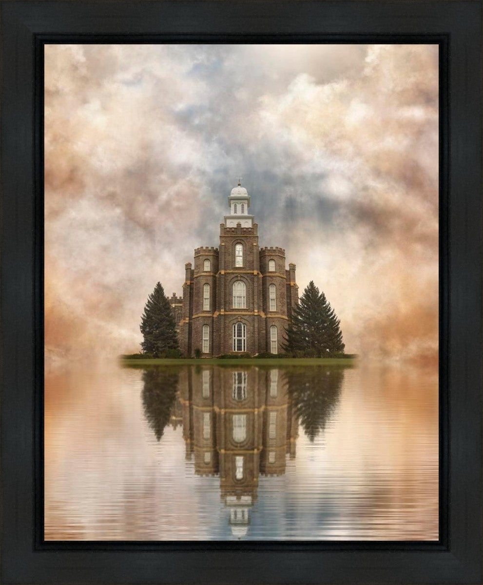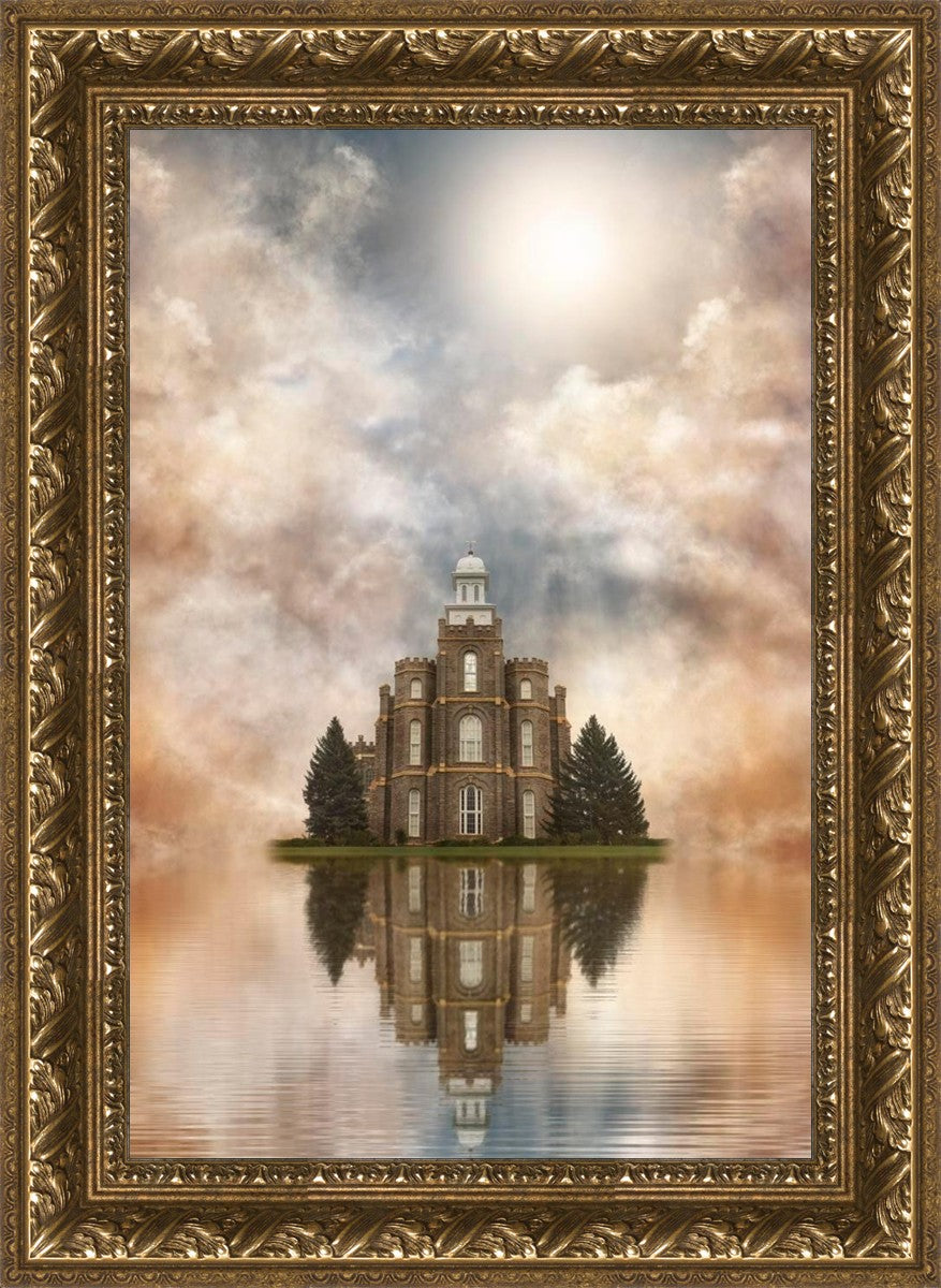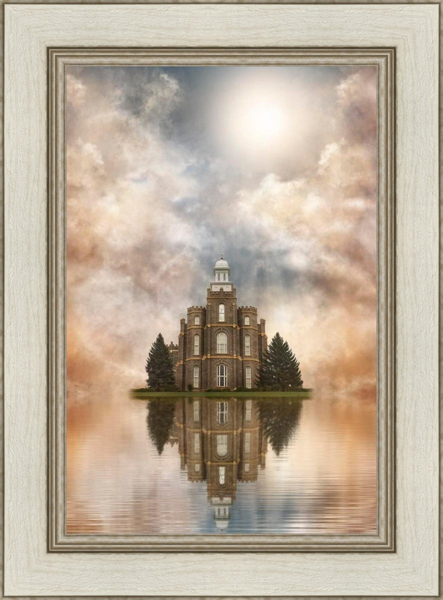 Millennial reflection of the Logan Utah Temple with pastel clouds in the sky.