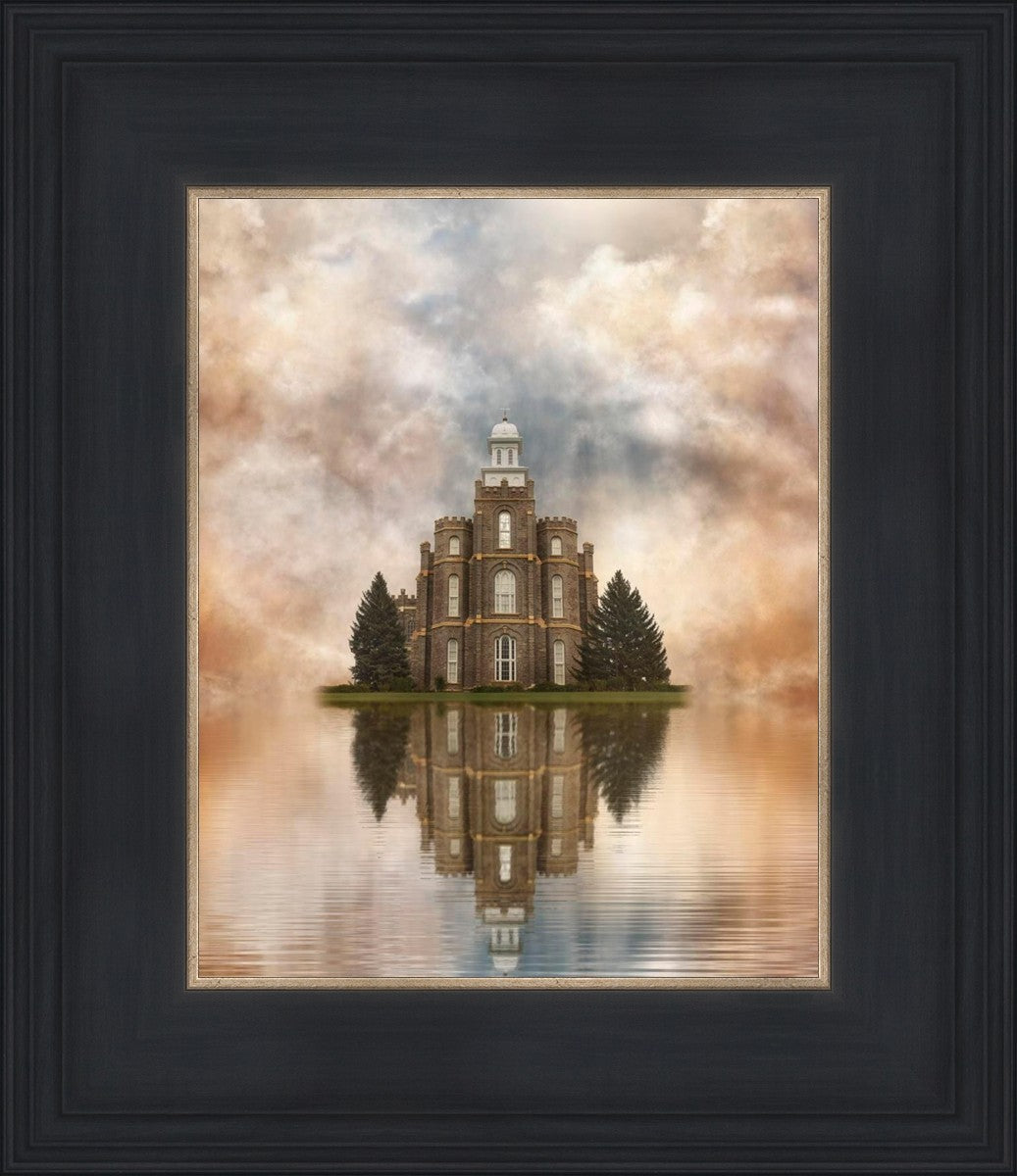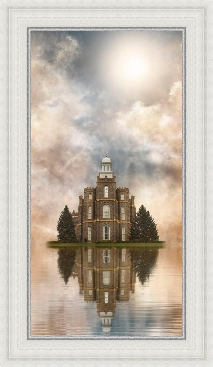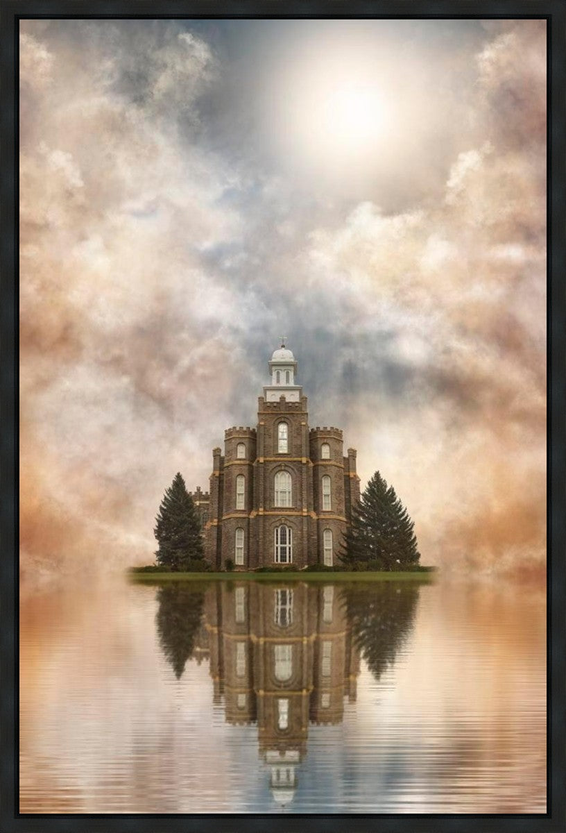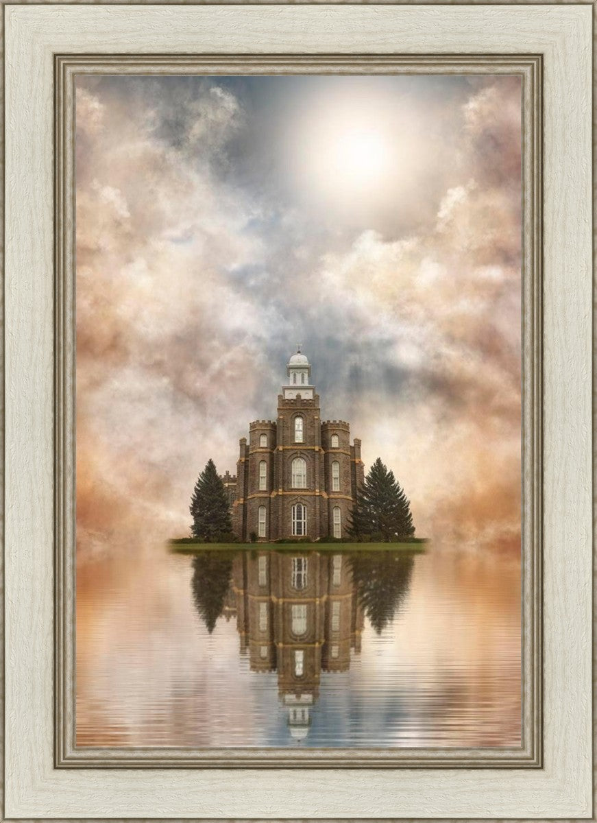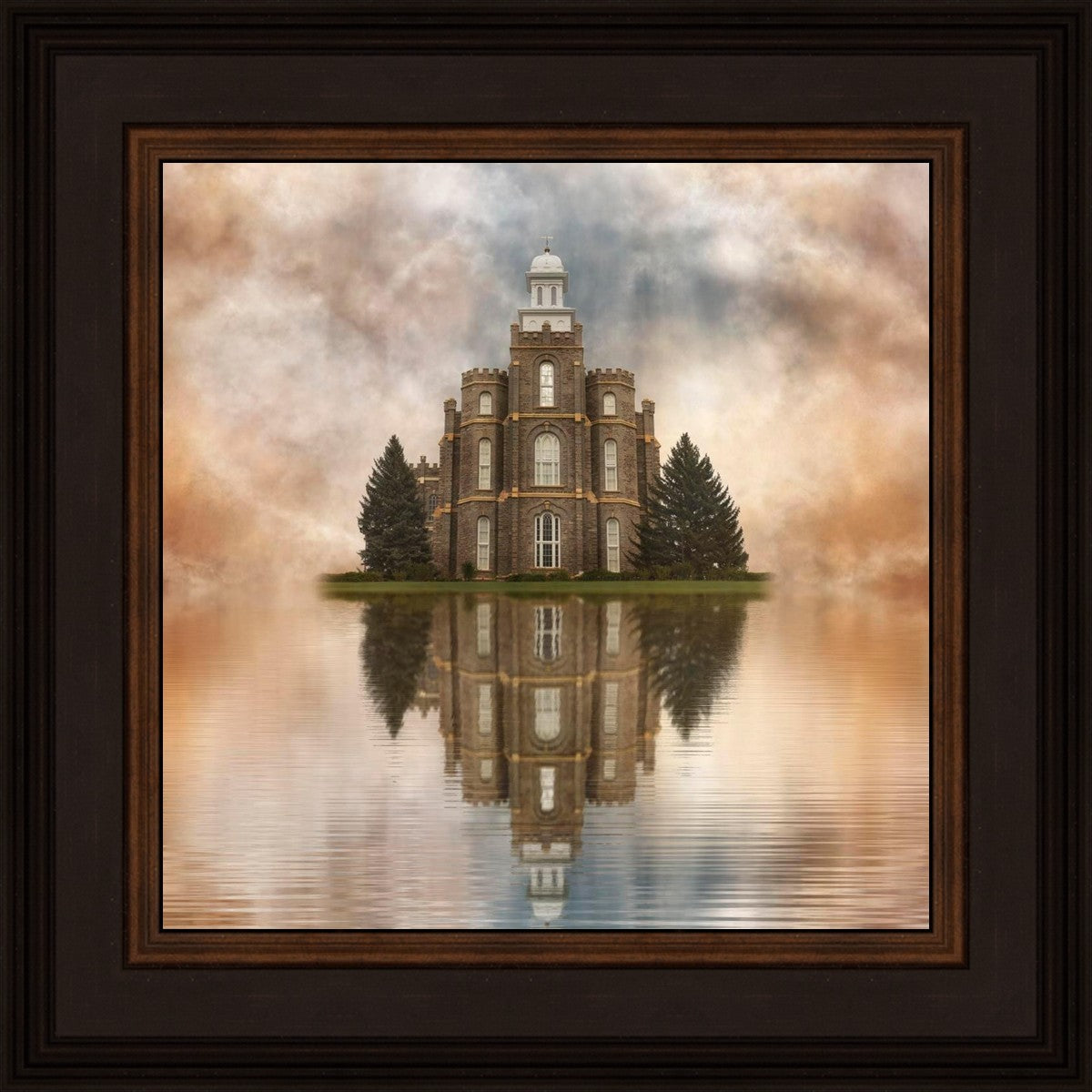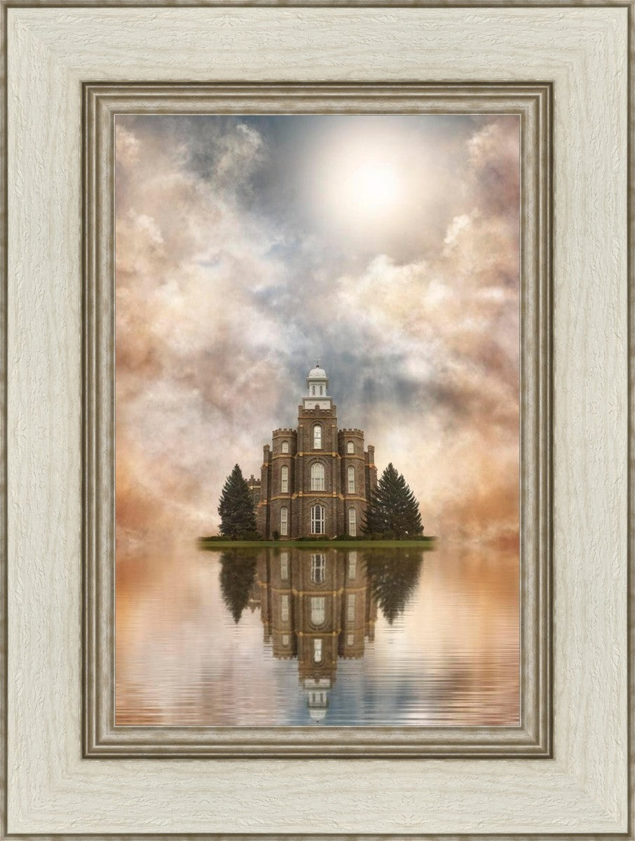 Millennial reflection of the Logan Utah Temple with pastel clouds in the sky.
