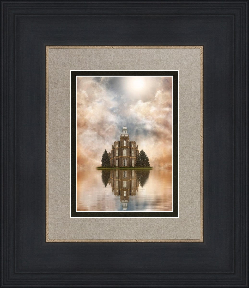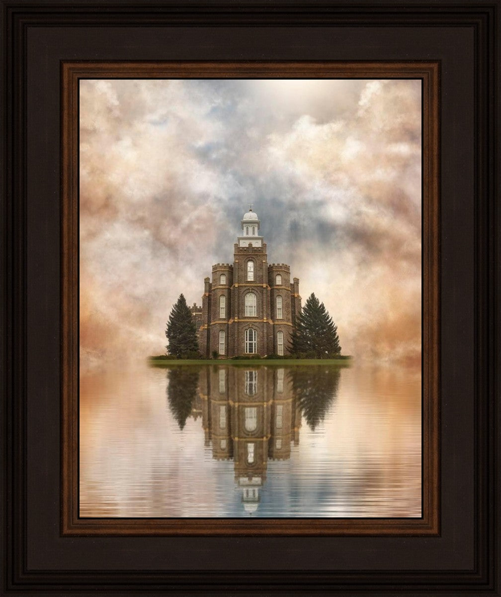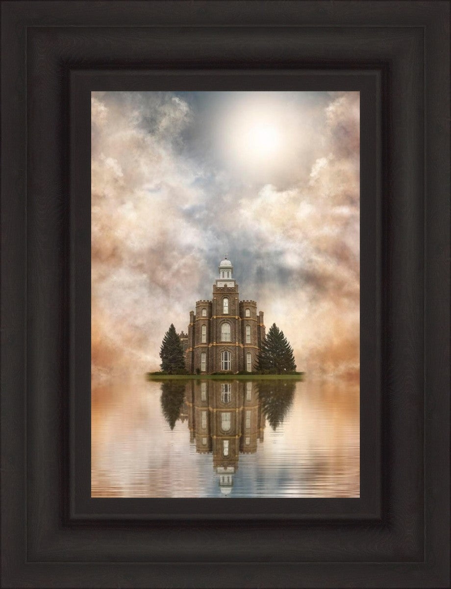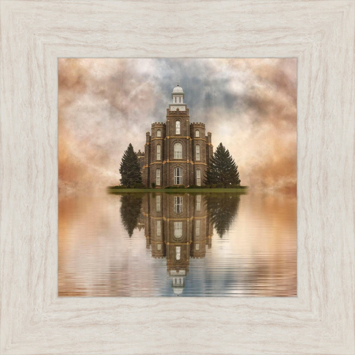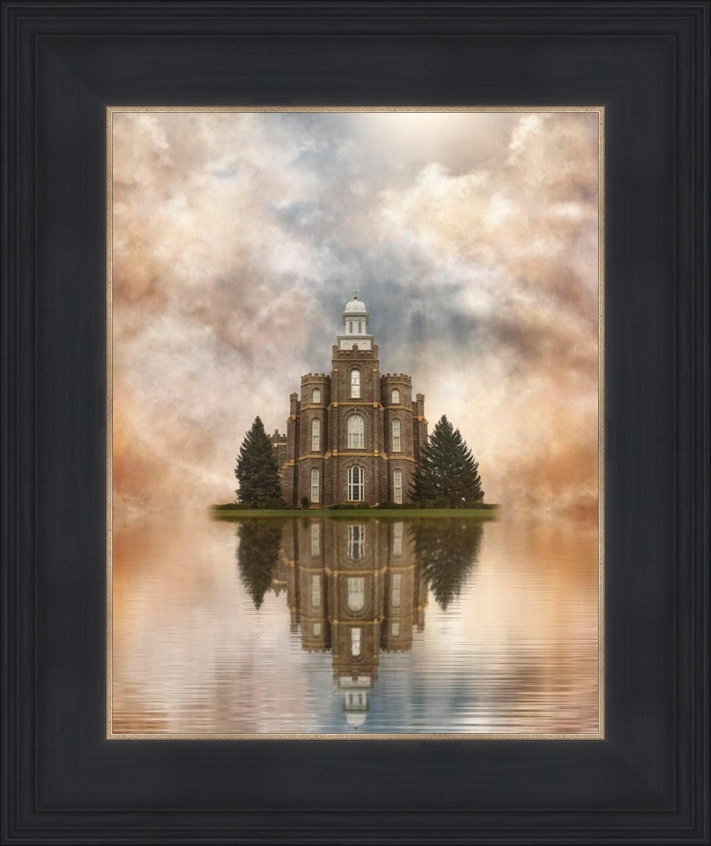 Millennial reflection of the Logan Utah Temple with pastel clouds in the sky.