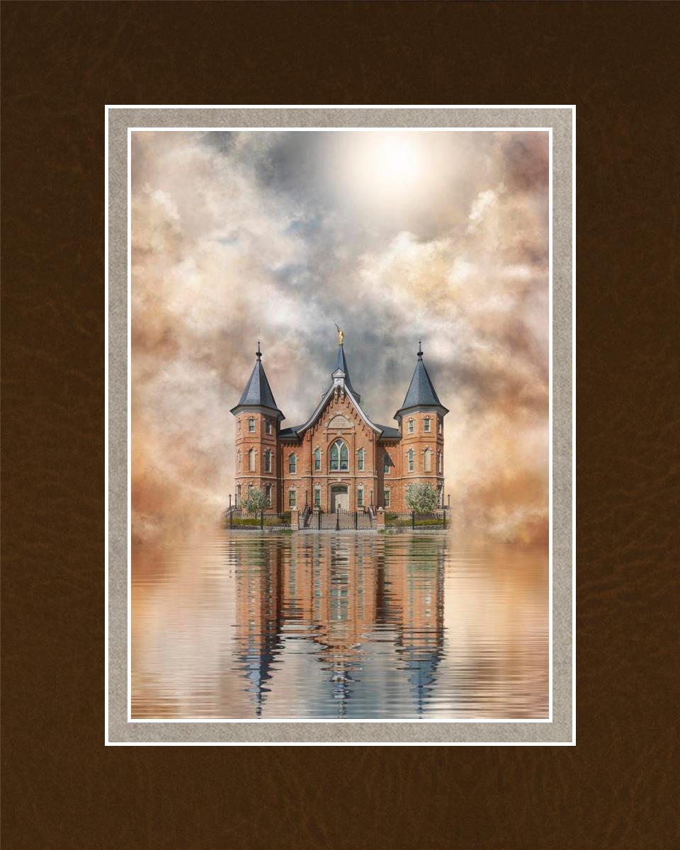 Reflection of the Provo City Center Temple with pastel clouds in the sky.