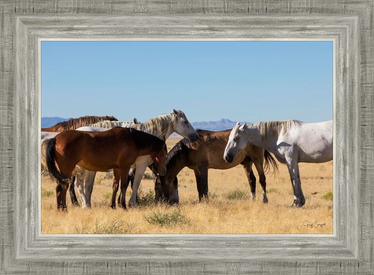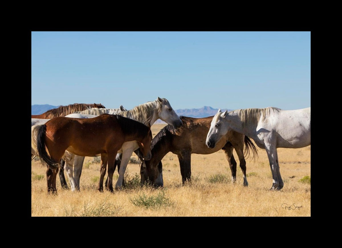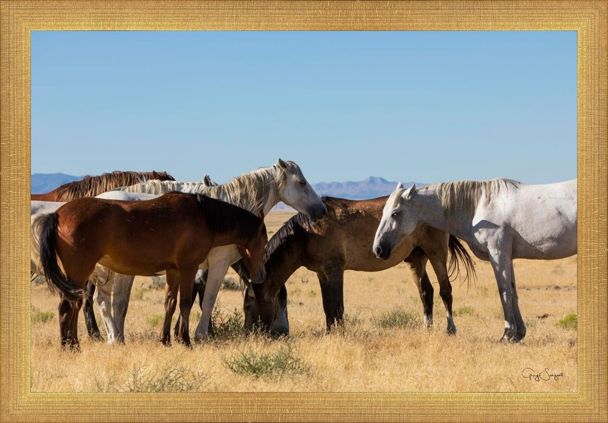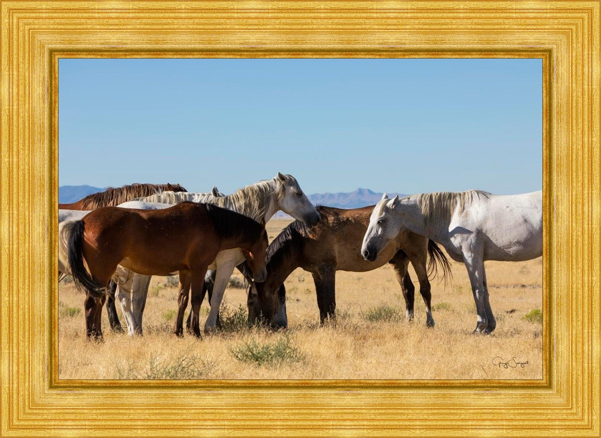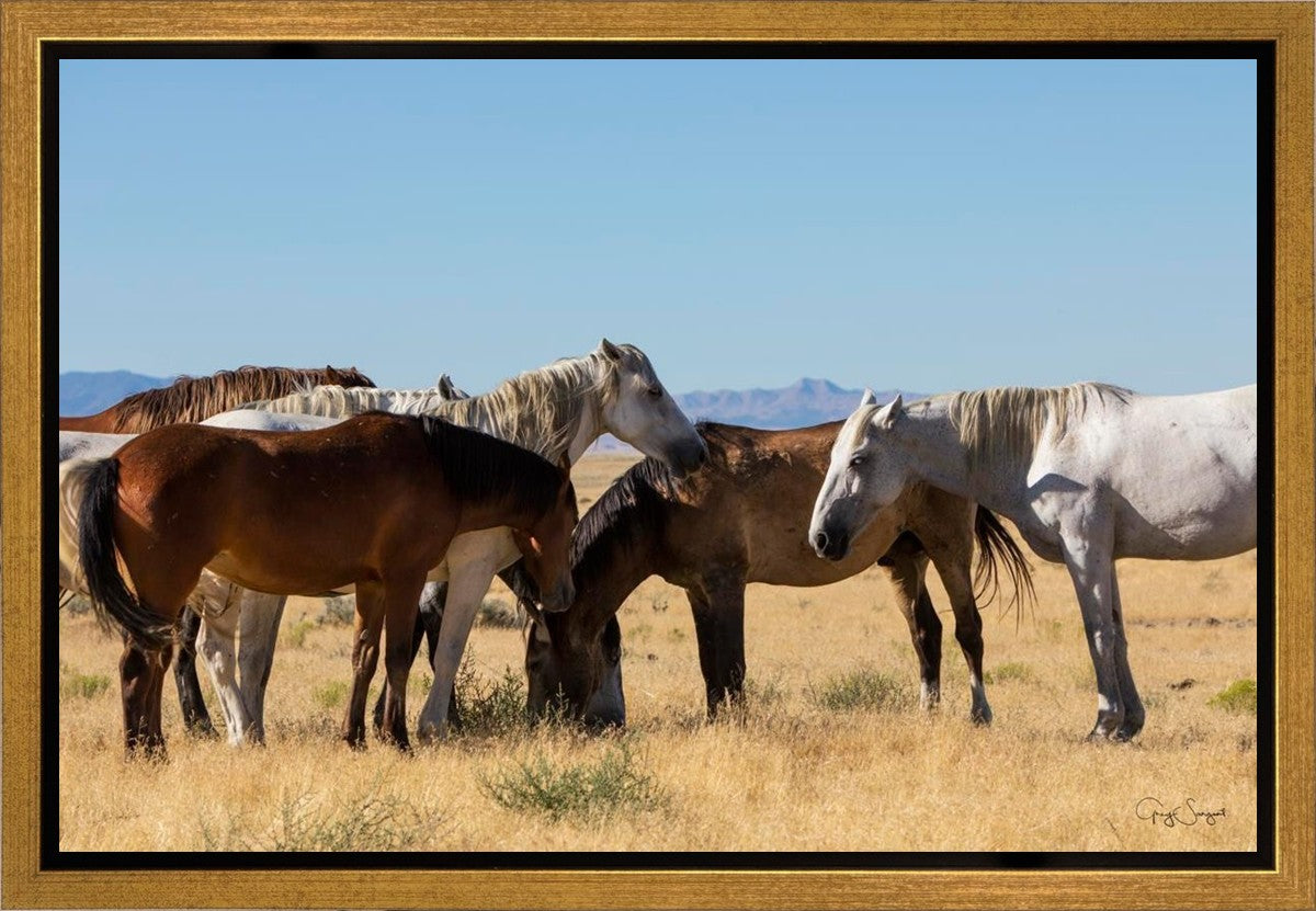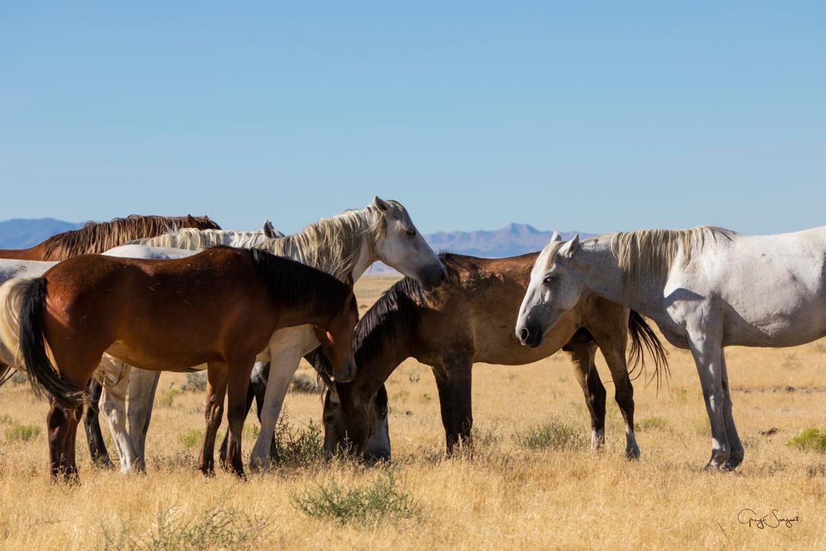 Wild horses gather in a group under the hot sun of the western desert.