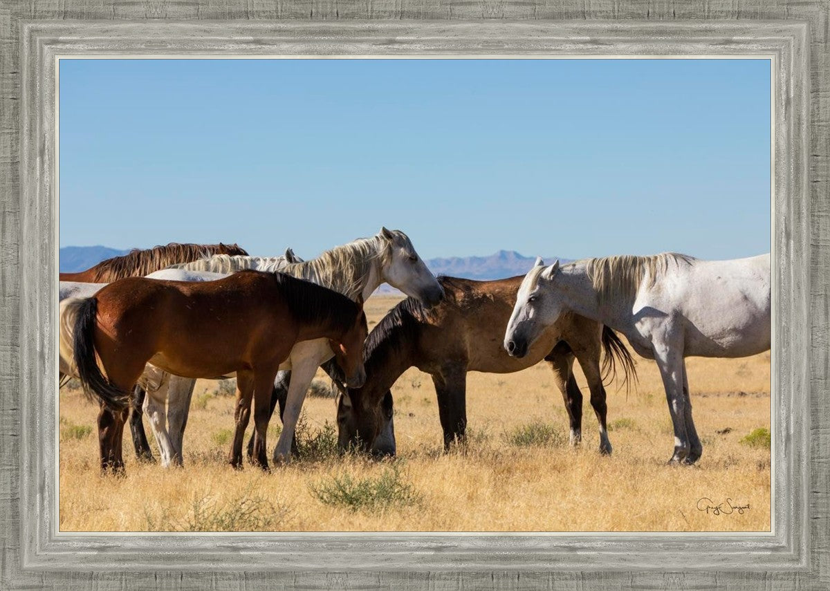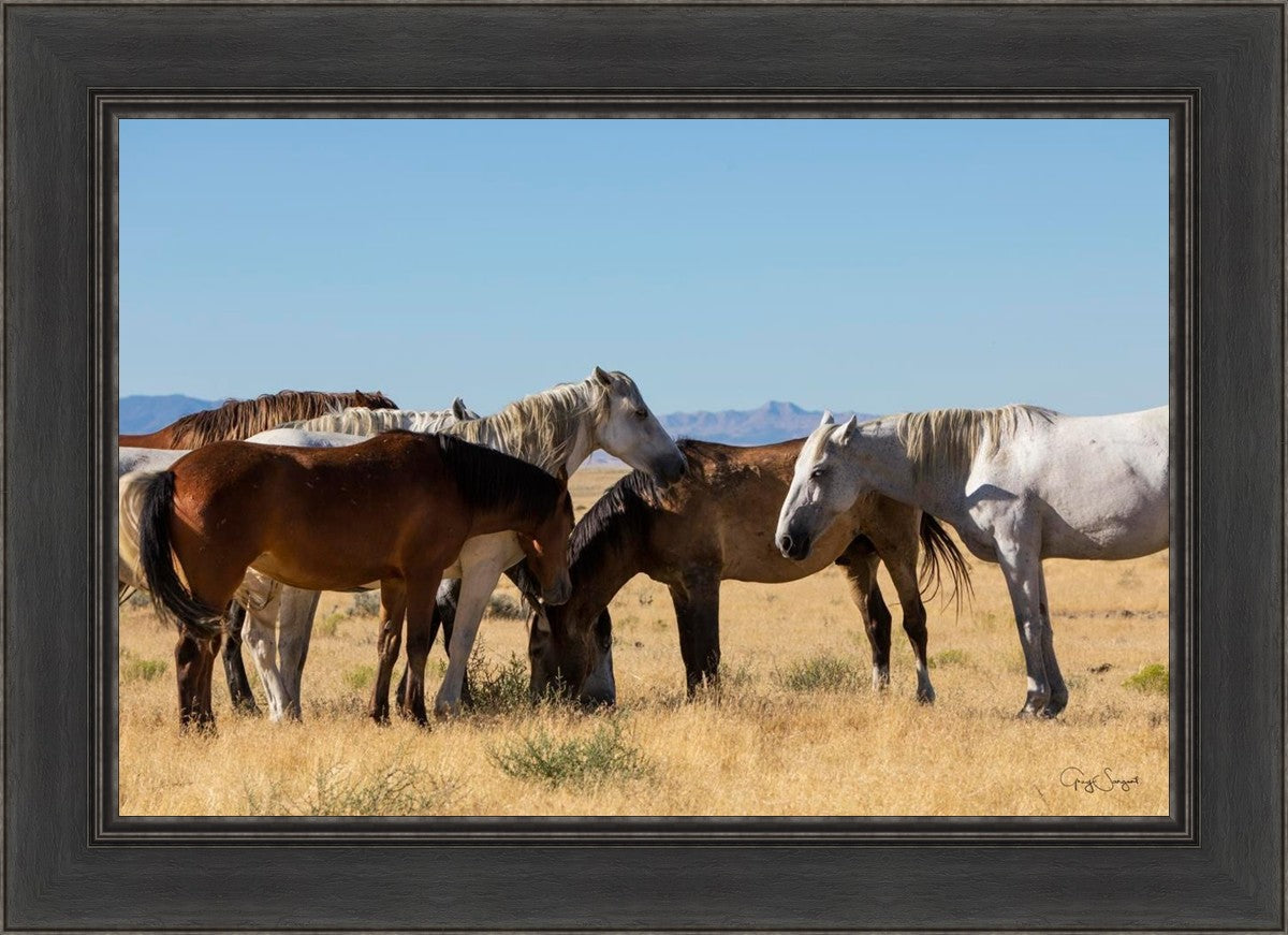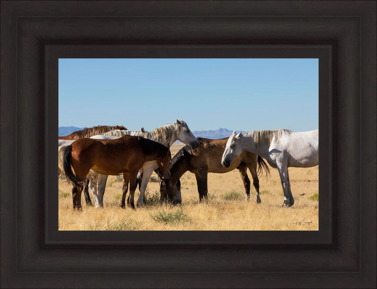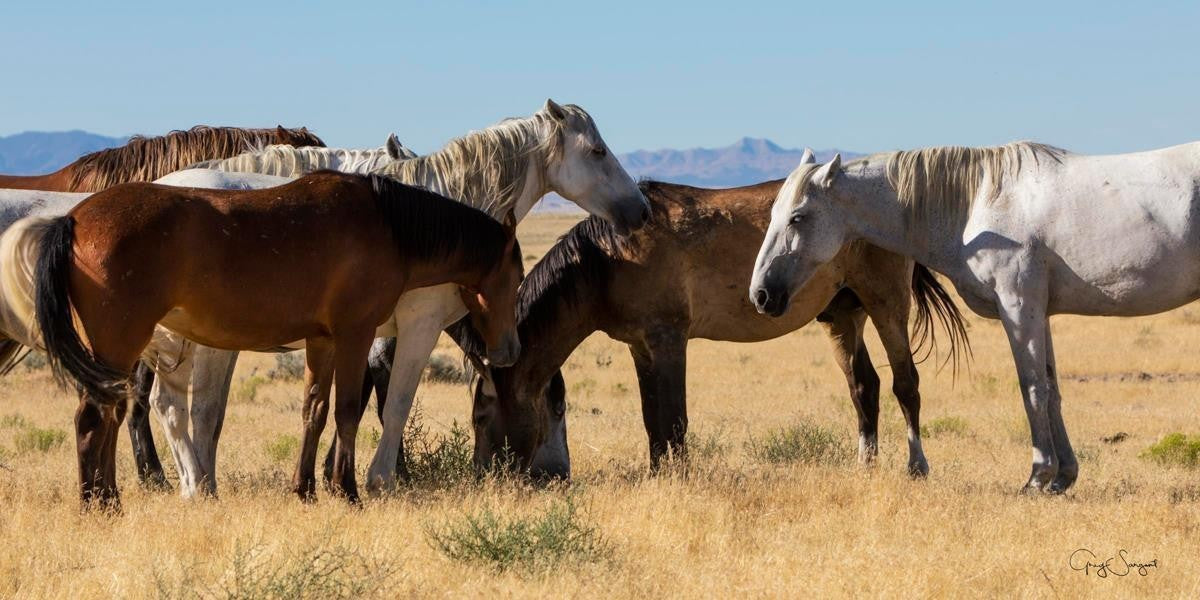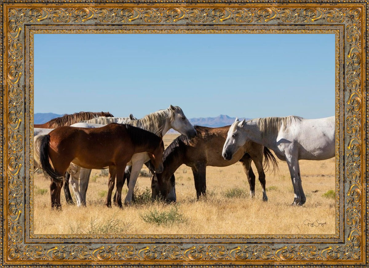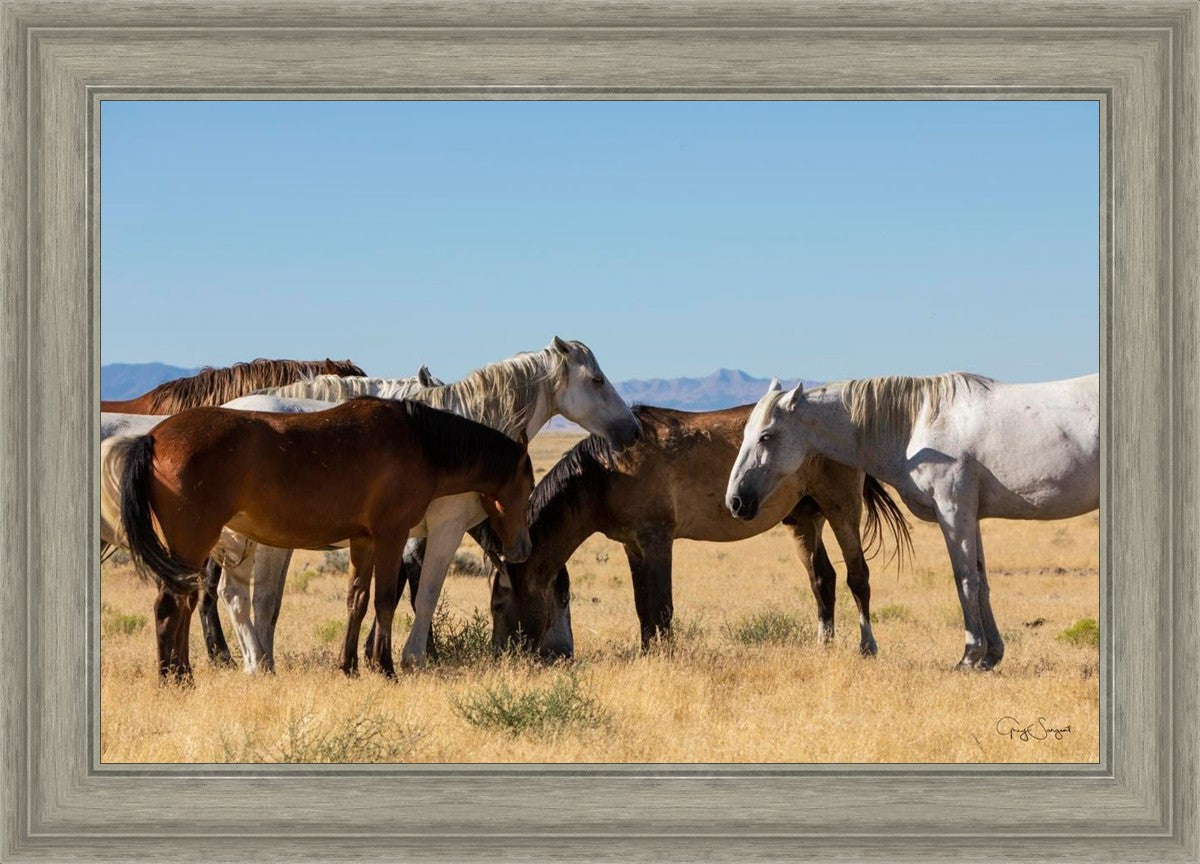 Wild horses gather in a group under the hot sun of the western desert.