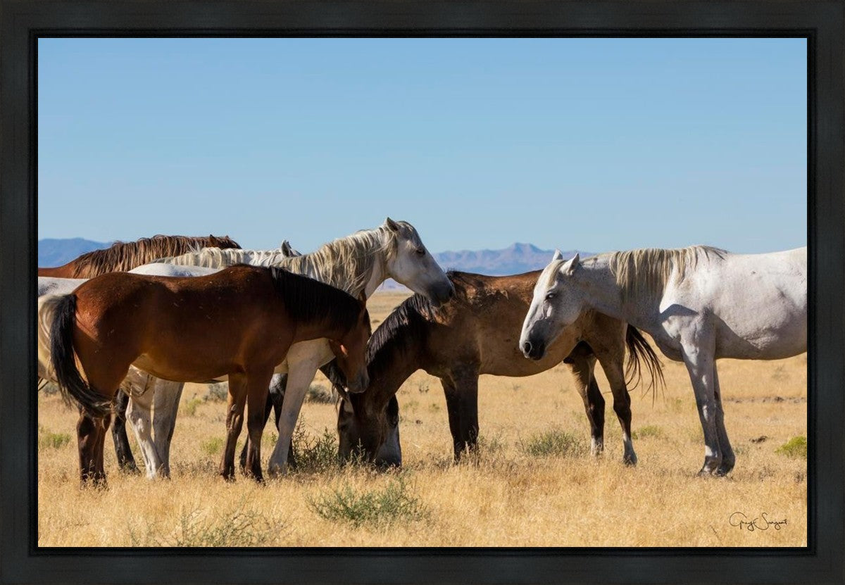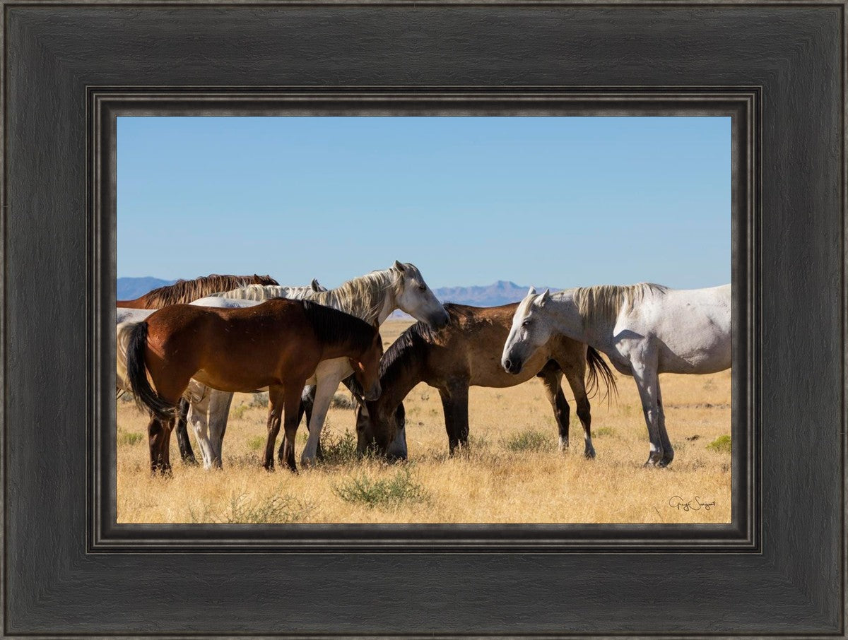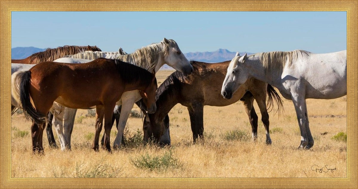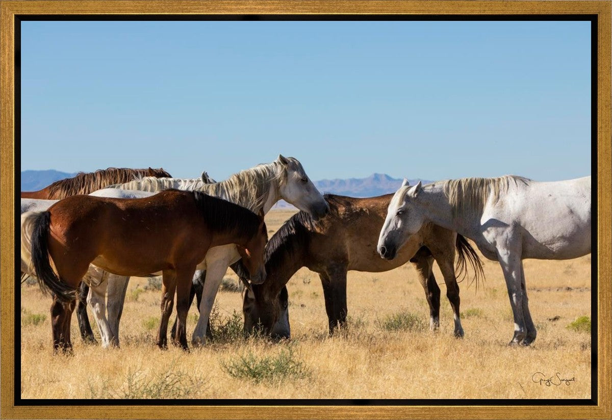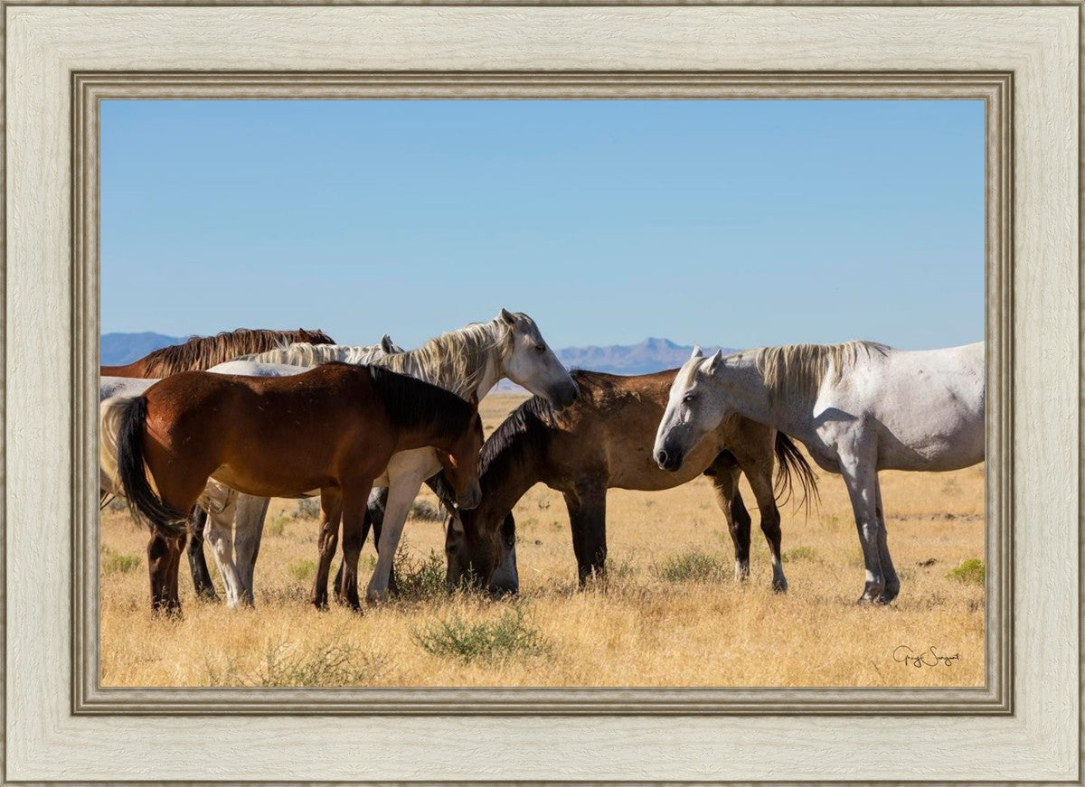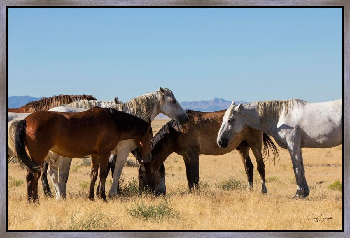 Wild horses gather in a group under the hot sun of the western desert.