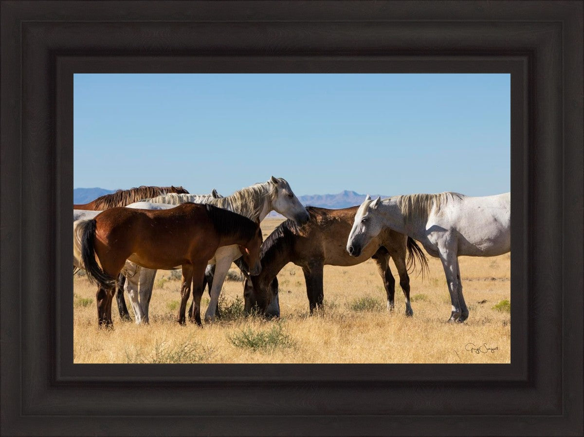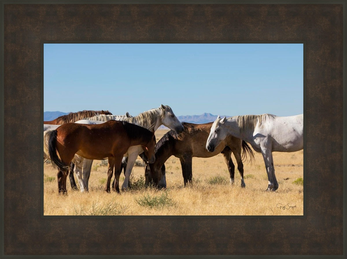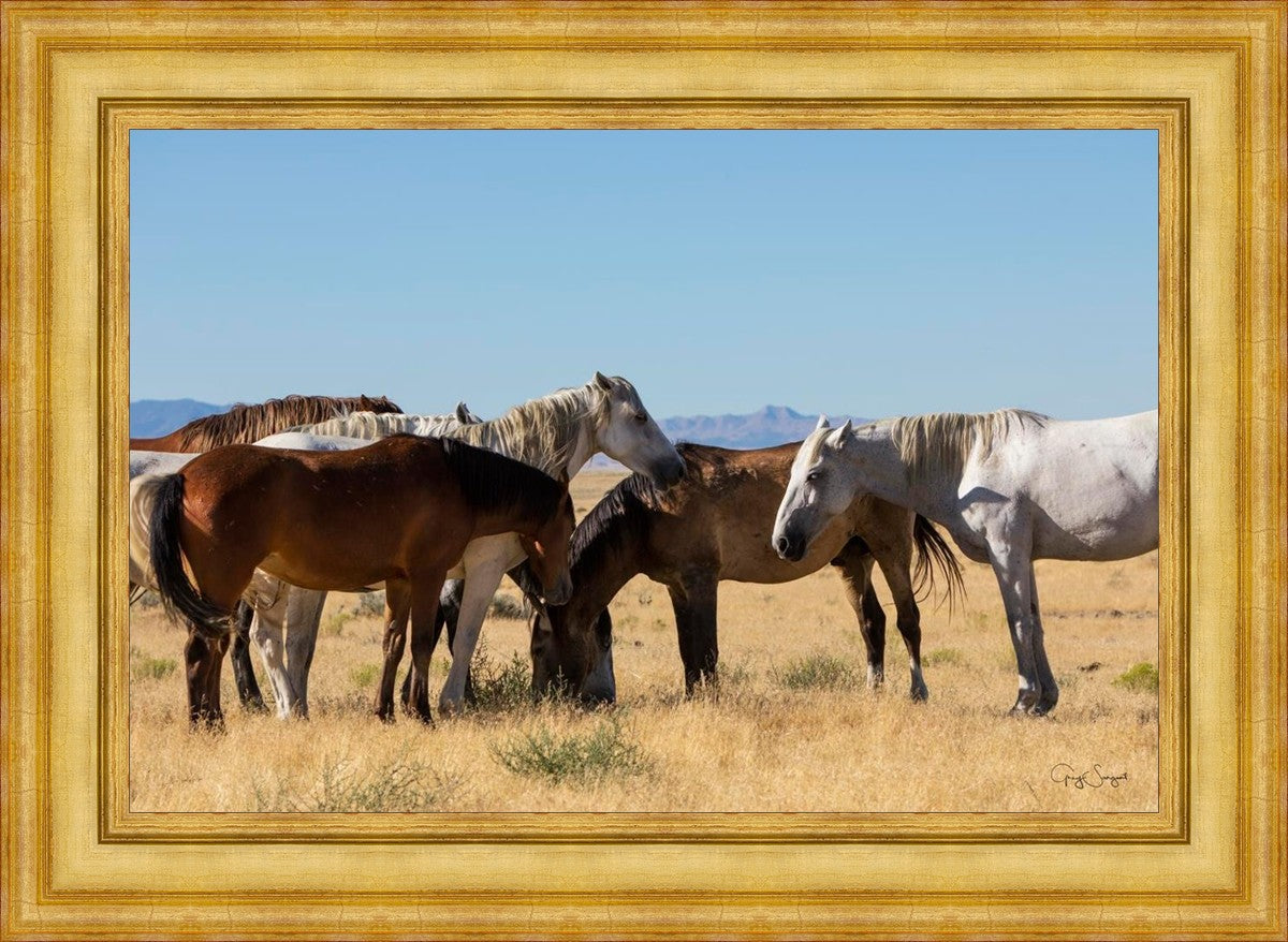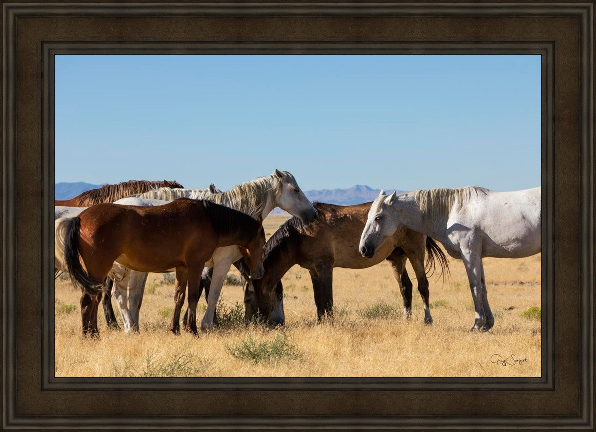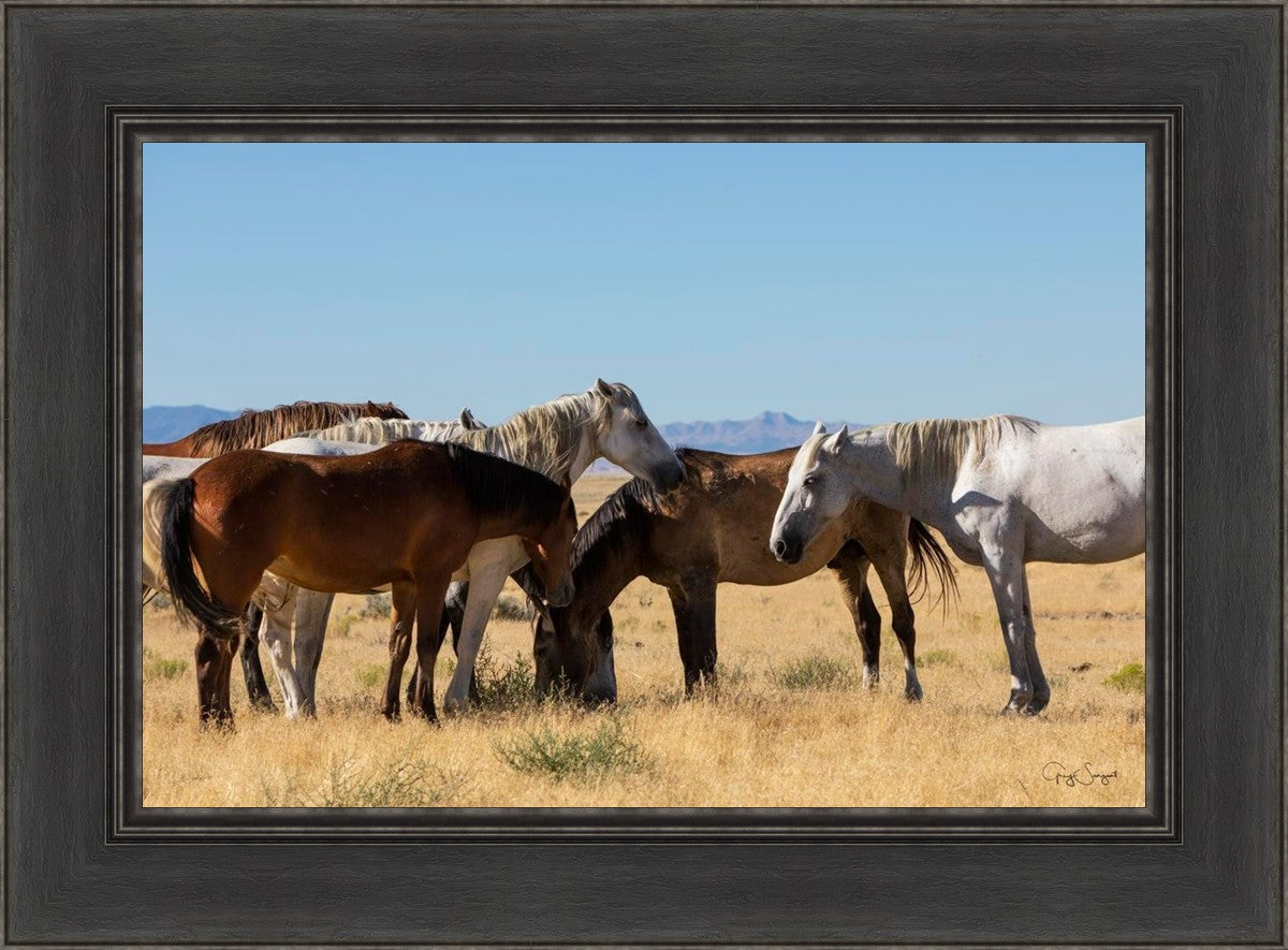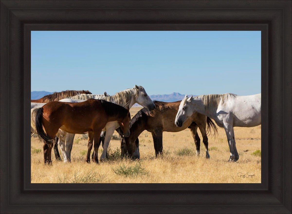 Wild horses gather in a group under the hot sun of the western desert.