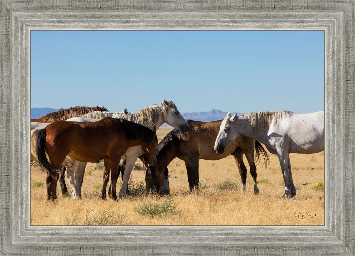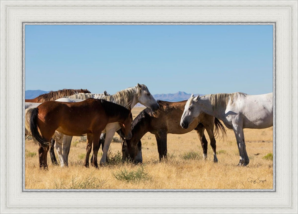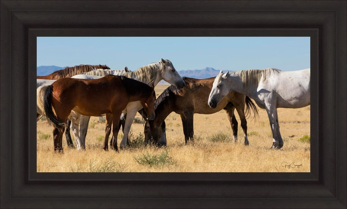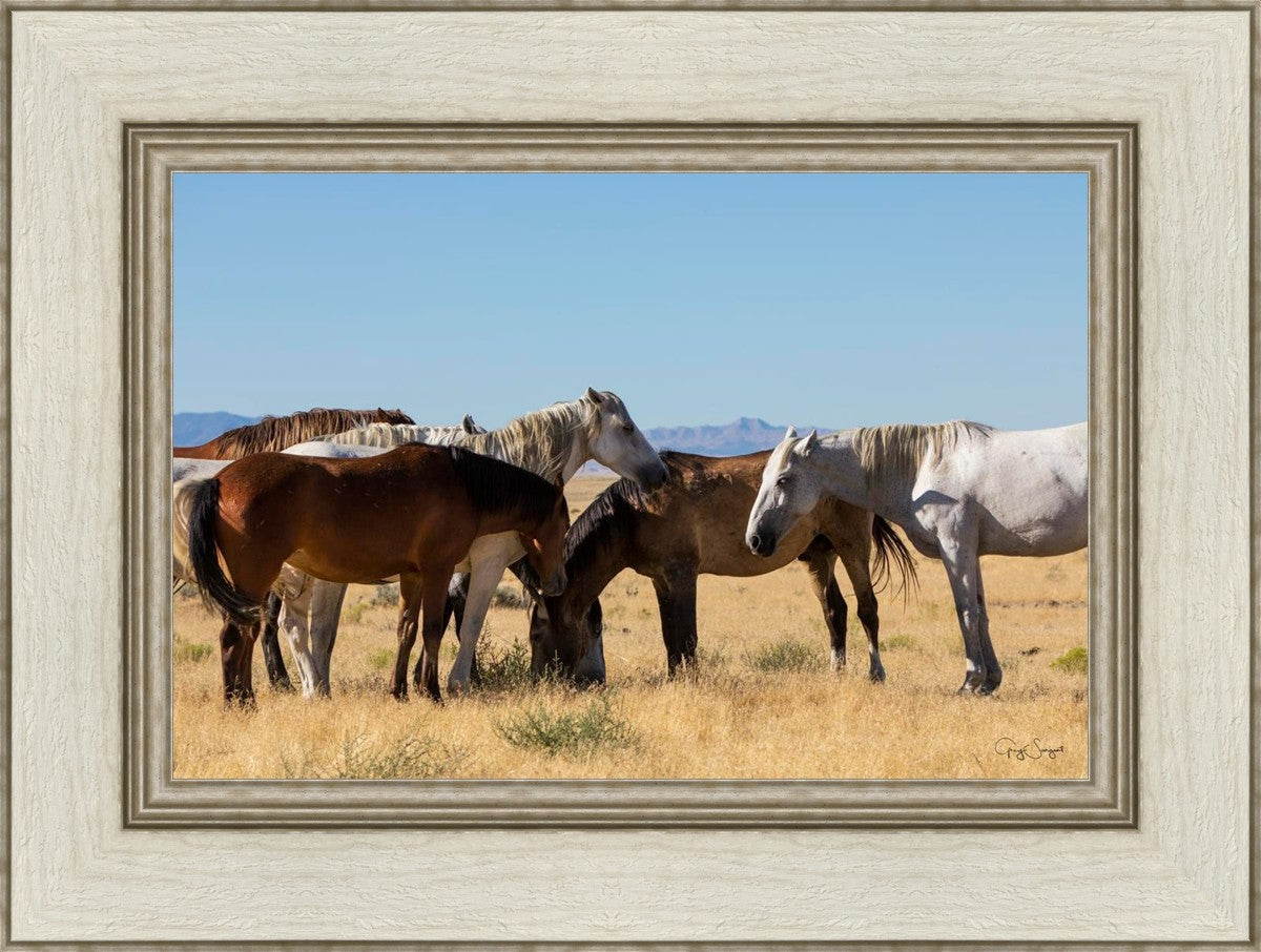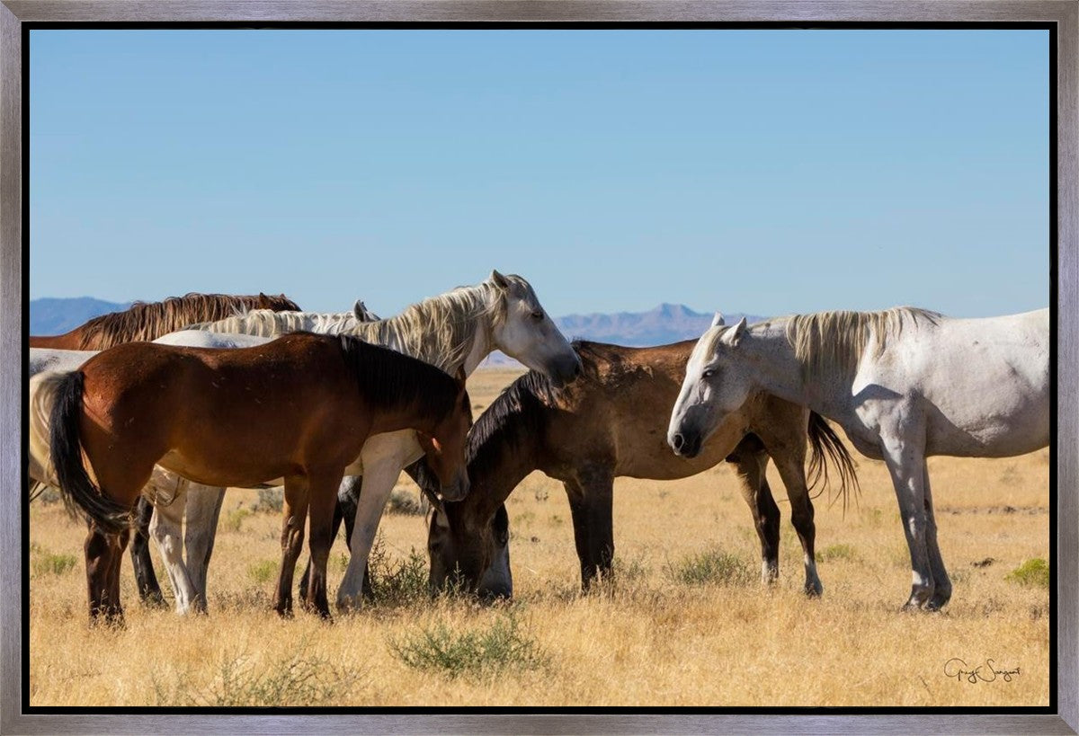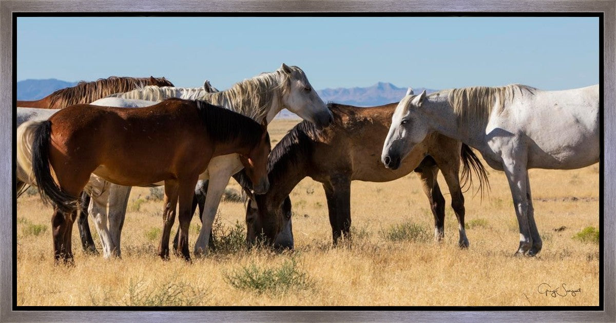 Wild horses gather in a group under the hot sun of the western desert.
