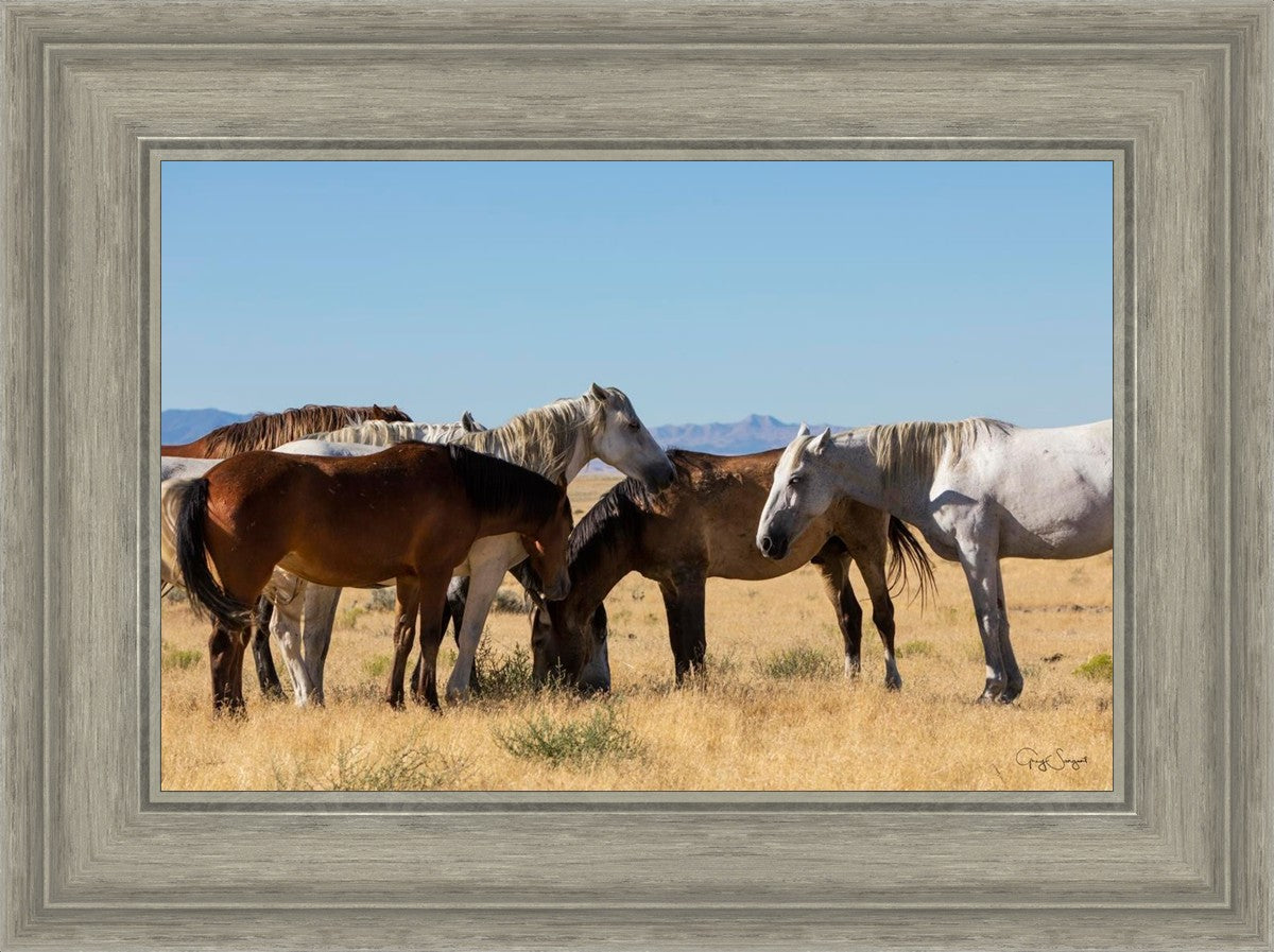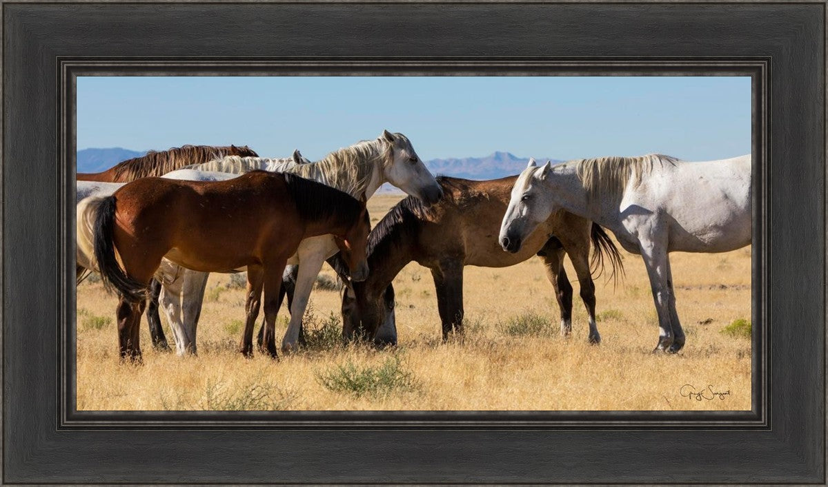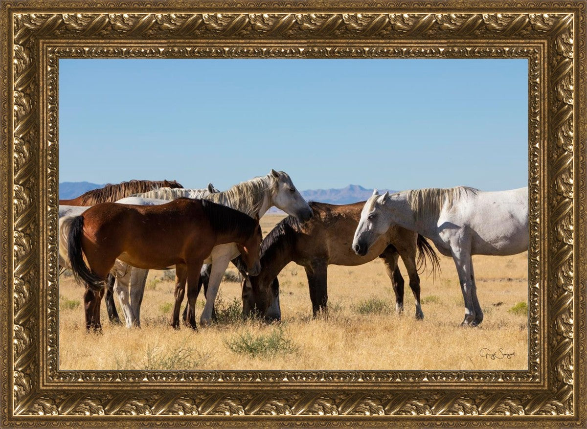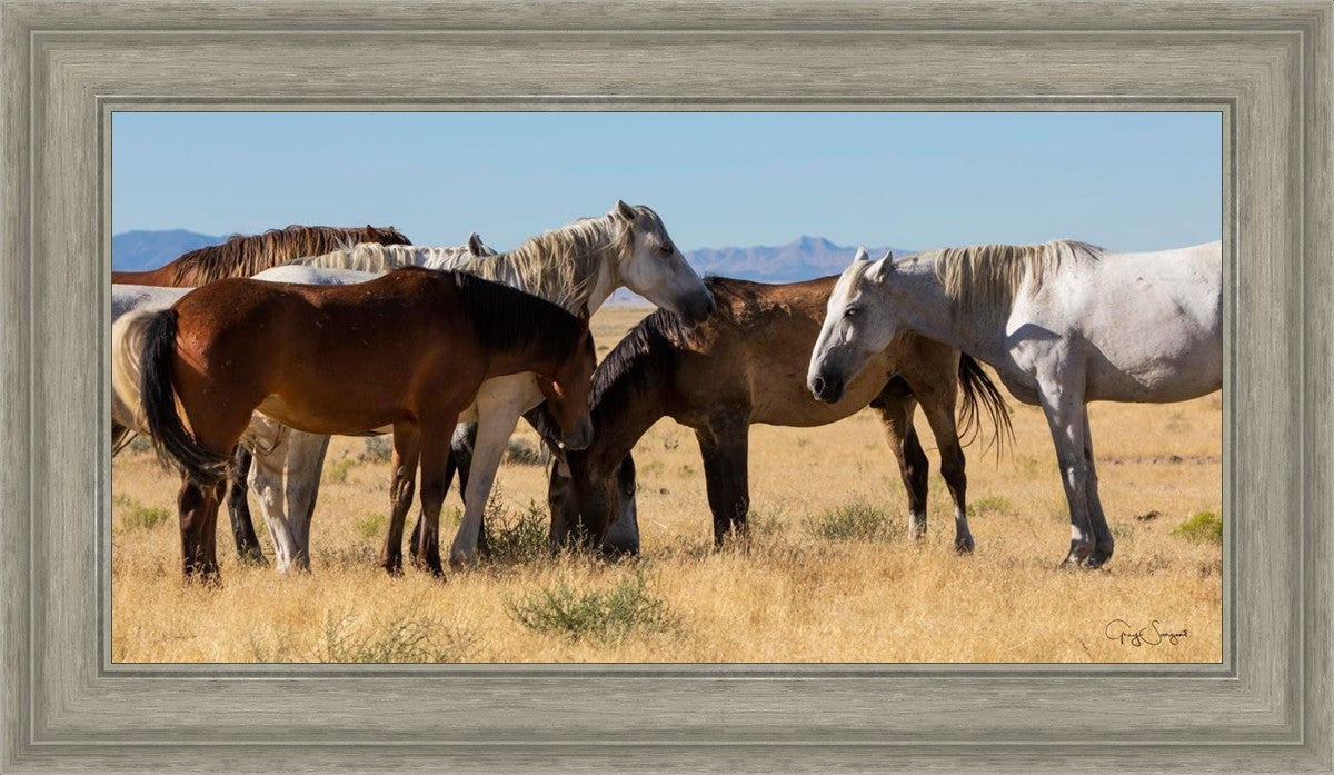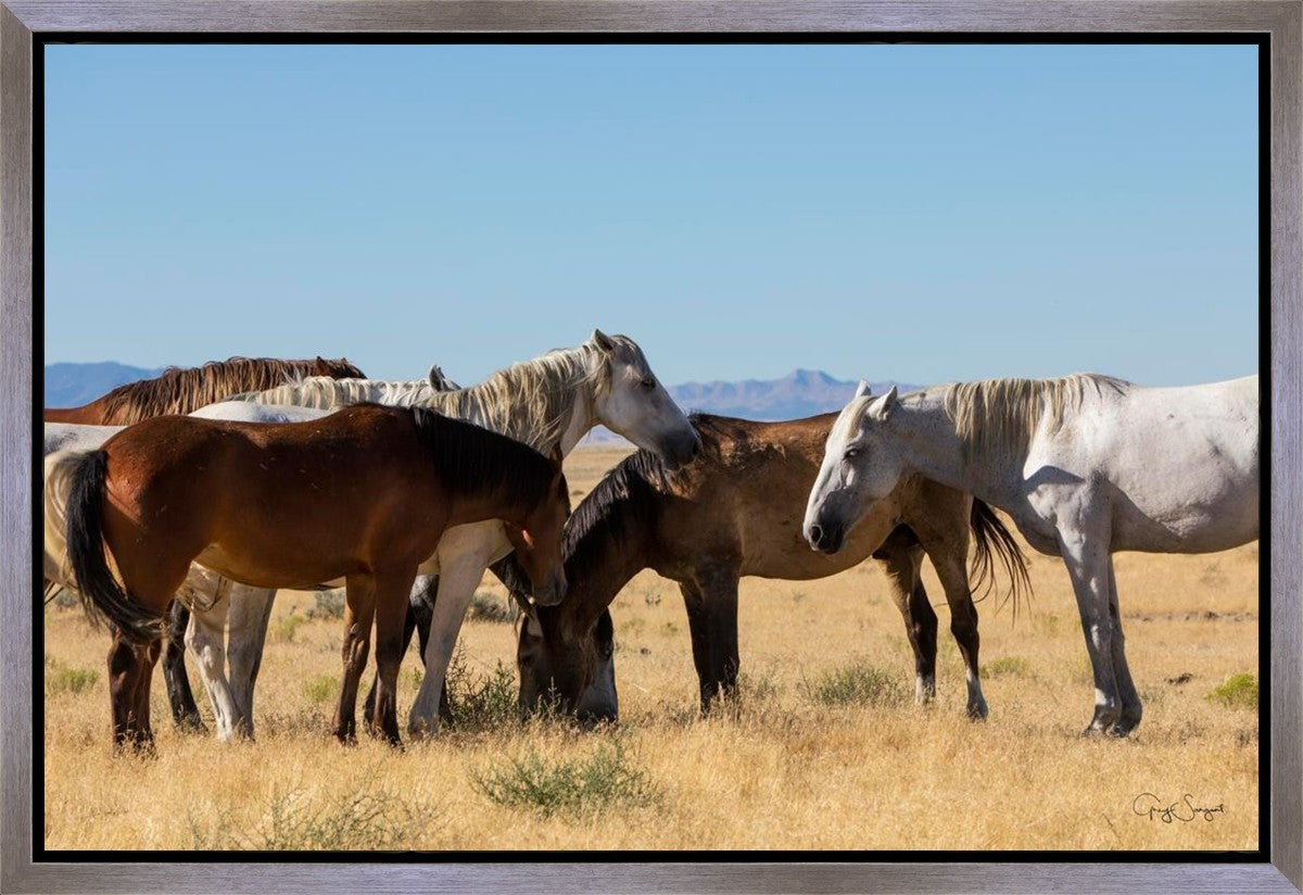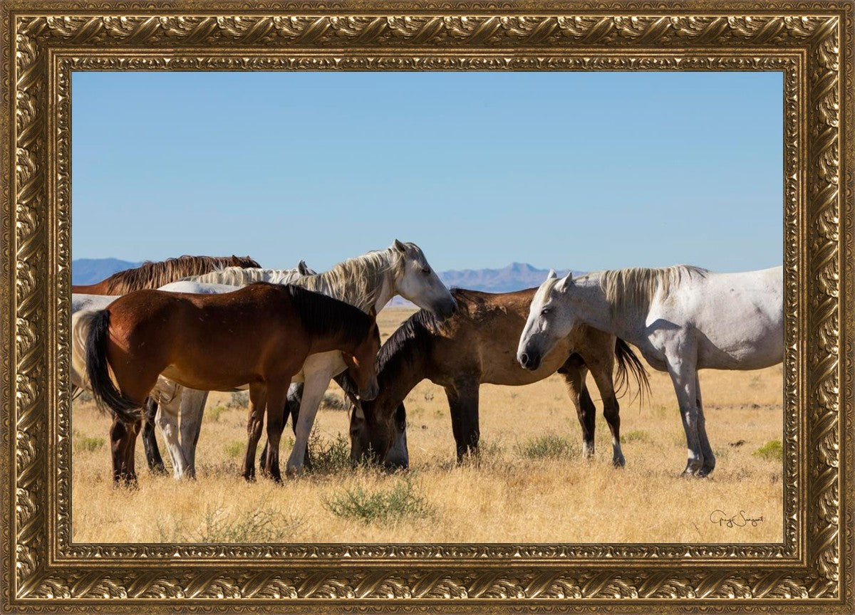 Wild horses gather in a group under the hot sun of the western desert.