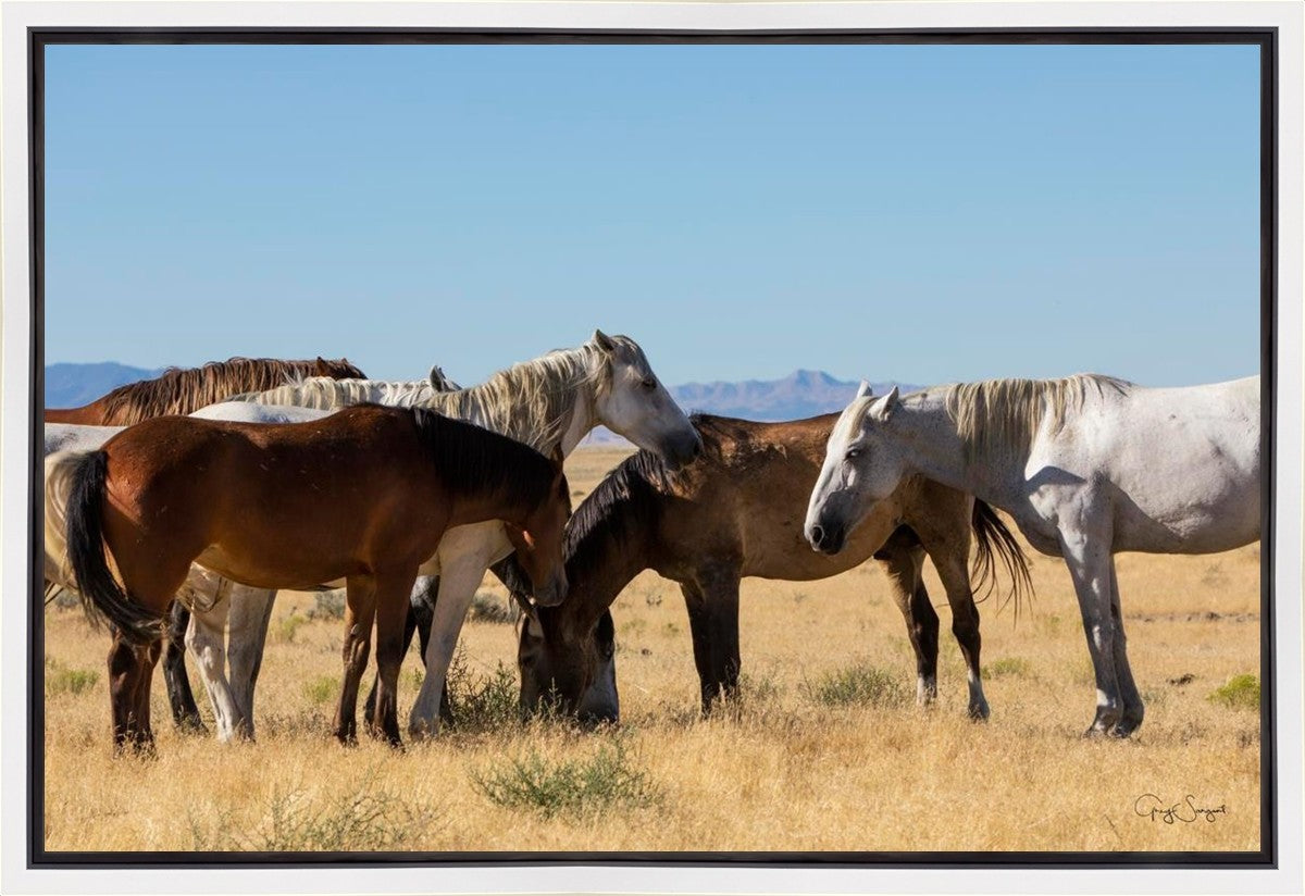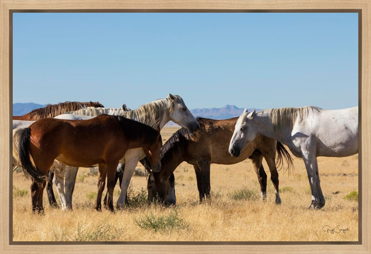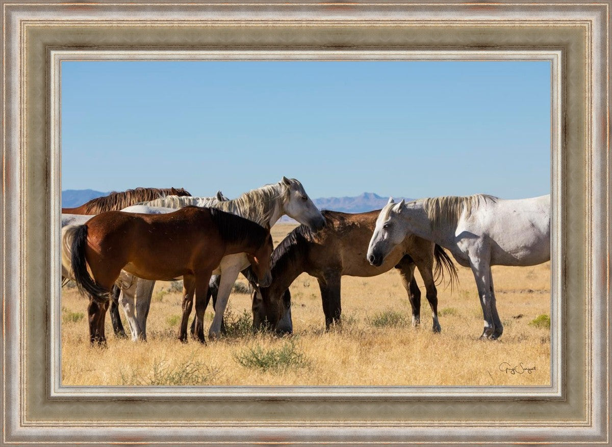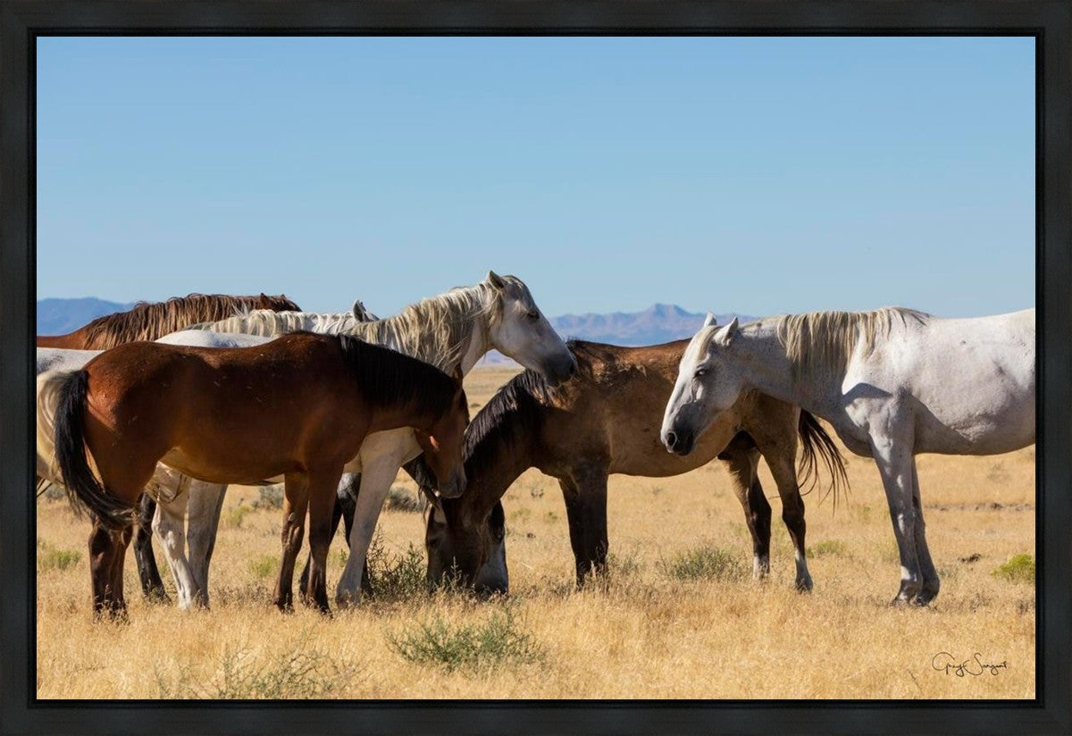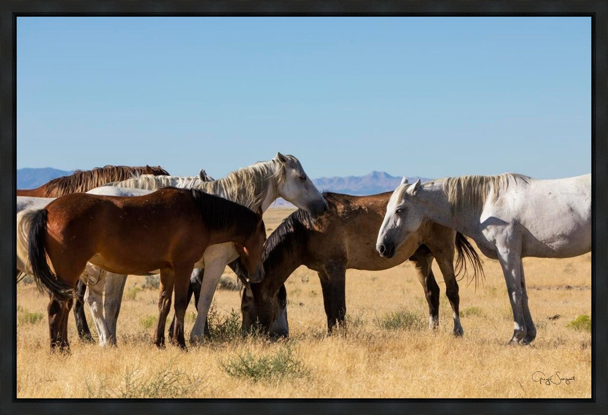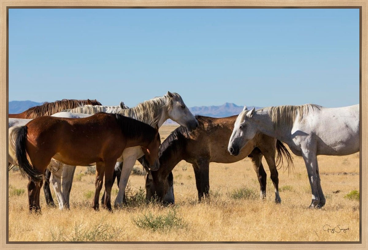 Wild horses gather in a group under the hot sun of the western desert.